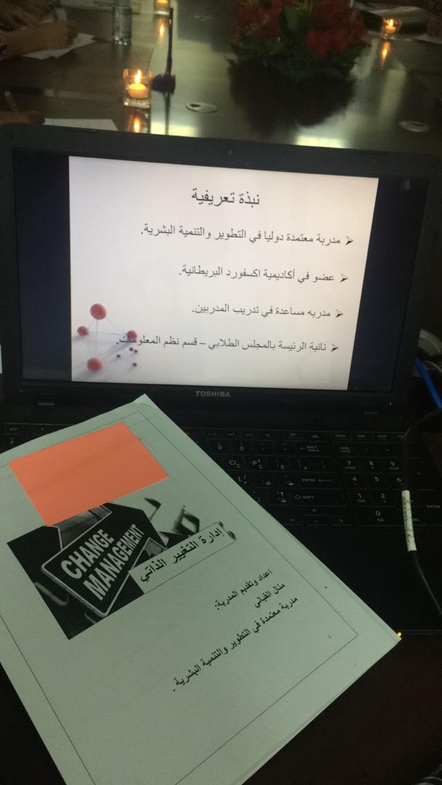 بالتعاون مع المجلس الطلابي وتحت إشراف أ. وفاء حمزة قدمت المدربة عضو في المجلس الطلابي لقسم نظم المعلومات: منال عليم القباني ورشة عمل بعنوان: "إدارة التغيير الذاتي" والتي أقيمت لمدة ساعتين من الساعة العاشرة إلى الساعة الثانية عشر من يوم الثلاثاء الموافق ٨ /٢ /١٤٣٨هـ. استهدفت الدورة الخريجات من قسم نظم المعلومات لهذا الفصل الدراسي، وكانت تهدف هذه الدورة إلى التطوير والتغيير حيث تستطيع المتدربة أن تعرف معنى التغيير وتعي أهمية التغيير في حياة الفرد الذي بالتالي يؤثر في تغيير المجتمع من حوله وتستطيع أيضًا تغيير ذاتها بالتخلص من السلبيات والتغلب على المعوقات. كما ناقشت المدربة بعض السلبيات التي تود المتدربات التخلص منها وأدلت لهم بطرق علاجية تساعد على تغييرها، واحتوى البرنامج التدريبي على العديد من الأنشطة المتنوعة بين النشاط الفردي والجماعي وكما احتوى على تمرين لتحليل الشخصية مما يساعد على فهم المتدربات لذواتهن وتحديد نقاط القهوة والضعف.