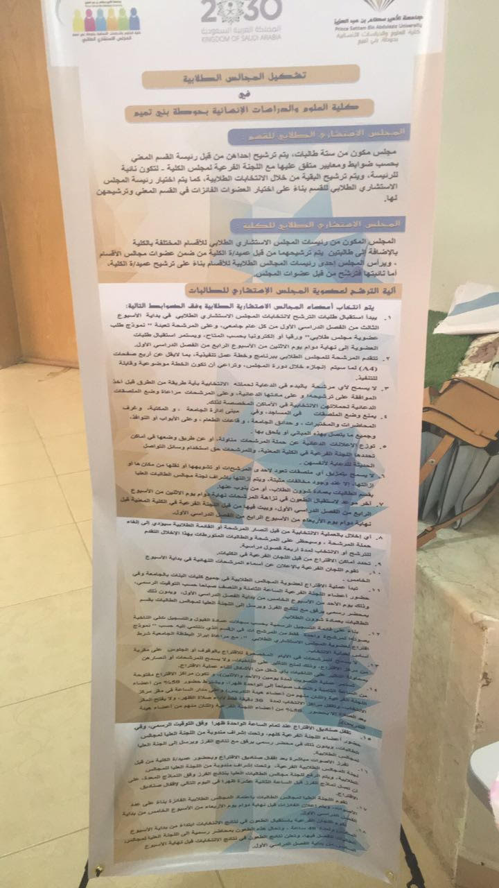 تحت رعاية عميدة كلية العلوم والدراسات الإنسانية بحوطة بني تميم د. حصة بنت سعود الهزاني قامت وحدة العمل الطلابي بالكلية بافتتاح الأندية الطلابية وذلك يوم الثلاثاء الموافق ١٠/ ١/ ١٤٣٨هـ في تمام الساعة ١٠:٠٠ صباحًا بوضع أركان وسط ساحة الكلية، وتعد الأندية الطلابية ملتقى مهمًا لاكتشاف وتطوير وتنمية المواهب، والعمل على تشجيع الابتكار وتنمية الإبداع لدى الطالبات باعتبارها مركز إشعاع علمي وثقافي واجتماعي وفني يتيح للطالبات التواصل مع رواد هذه الأنشطة داخل الكلية وخارجها ومصدر رئيس لعرض نتاجهم حتى يكونوا لبنة تثري المجتمع ومكتسب نفخر به.   كما قامت وحدة المجالس الطلابية ممثلة برئيستها أ. فاطمة المسعد بعرض أبرز مهام المجالس الطلابية الاستشارية للطالبات وكذلك الجدول الزمني لتشكيل المجالس الطلابية وآلية الترشيح لعضوية هذه المجالس، ورافق العرض مجموعة من إعلانات المرشحات للمجالس الطلابية من كل قسم للتعريف بأهدافهن وتطلعاتهن داخل المجلس الطلابي طلبًا لدعمهن واستعدادًا لجمع أصوات الانتخابات خلال الأيام القادمة.
