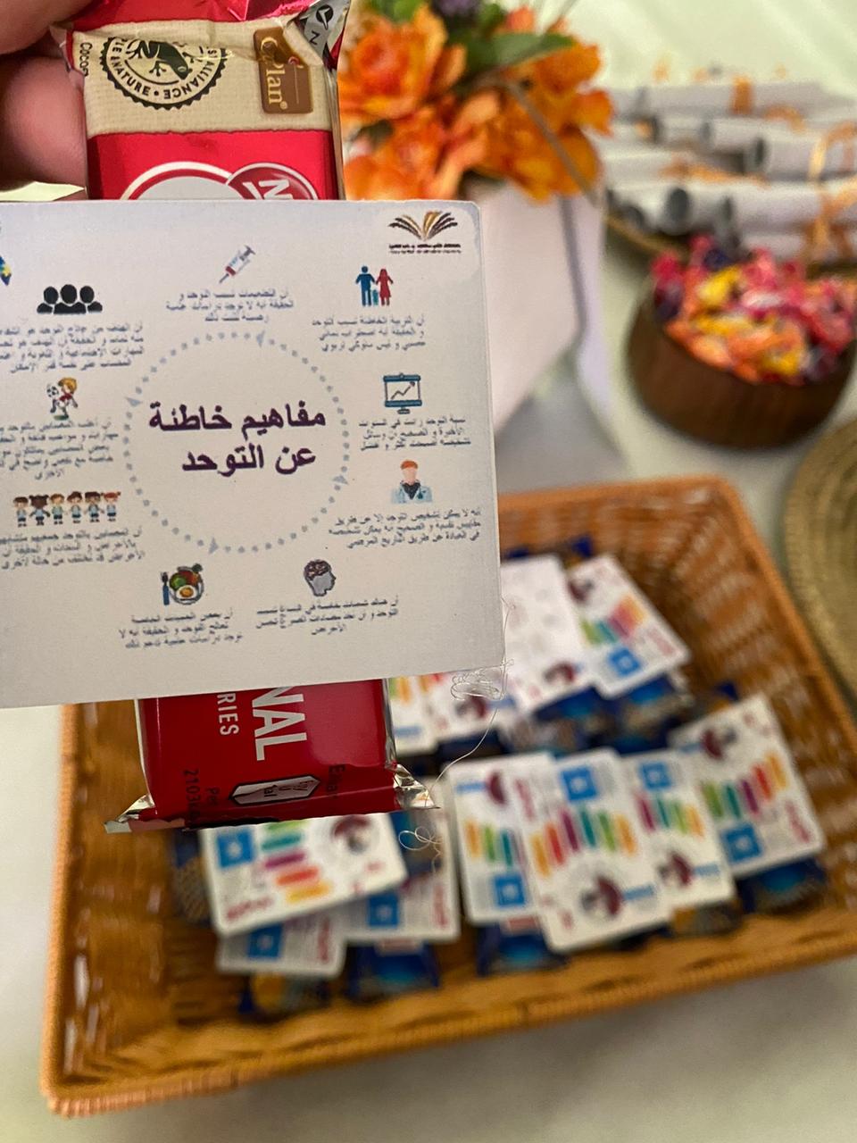 تطرقت الطالبات للتعريف بماهية مرض التوحد وأسبابه وأعراض الإصابة به، وكيفية التواصل مع المصابين، ودمجهم في المجتمع، والتعامل معهم بطرق مناسبة للتخفيف من الصعوبات الرئيسية التي يعانون منها فيما يتعلق بالمهارات اللغوية.