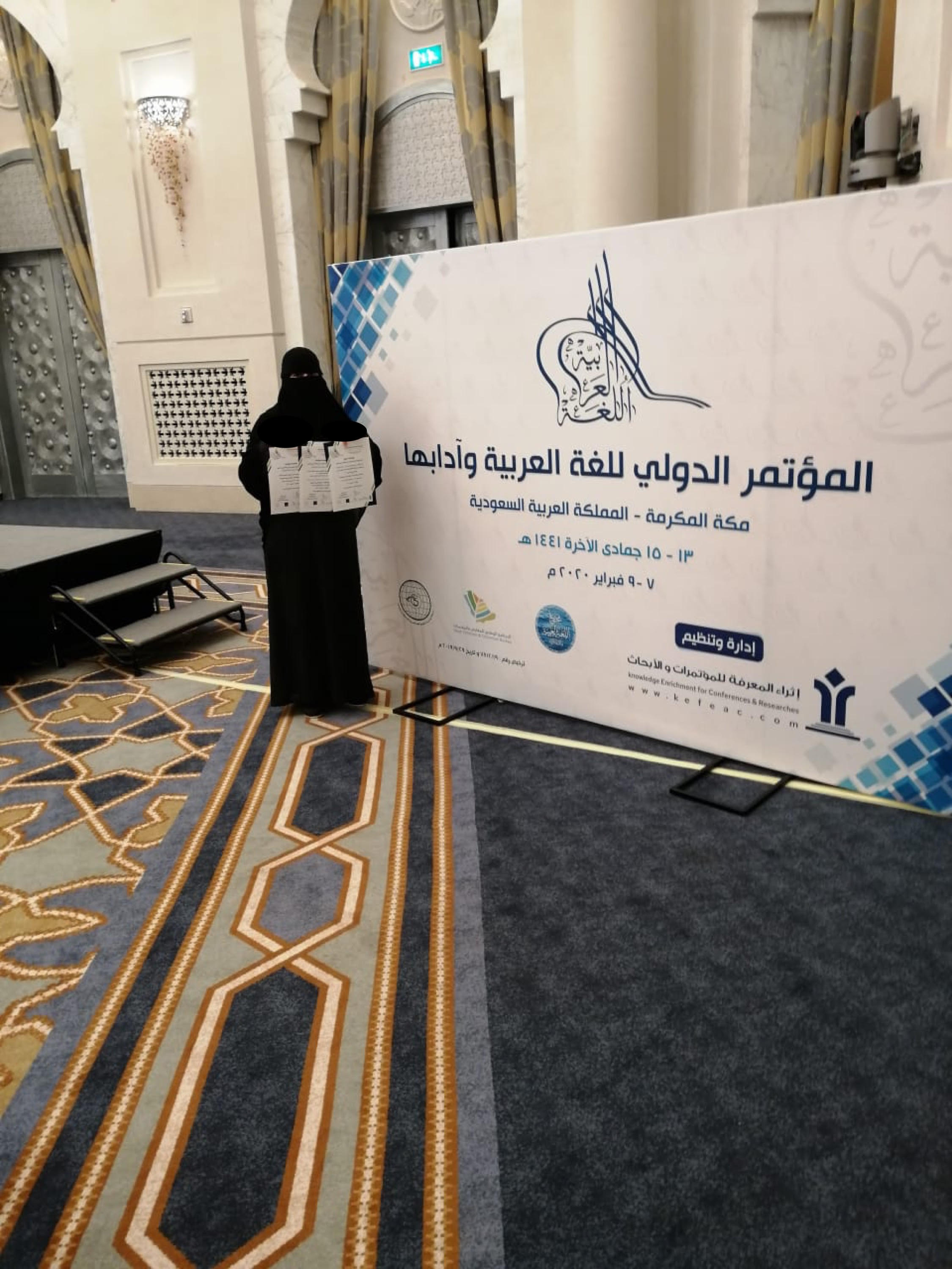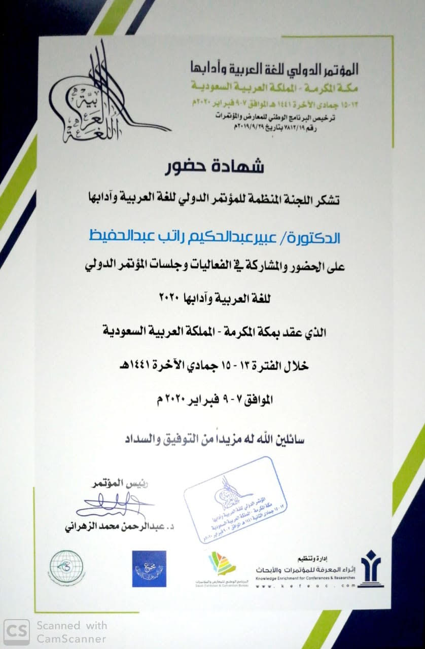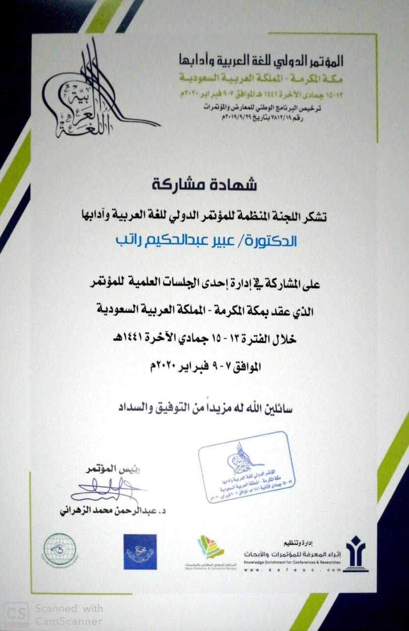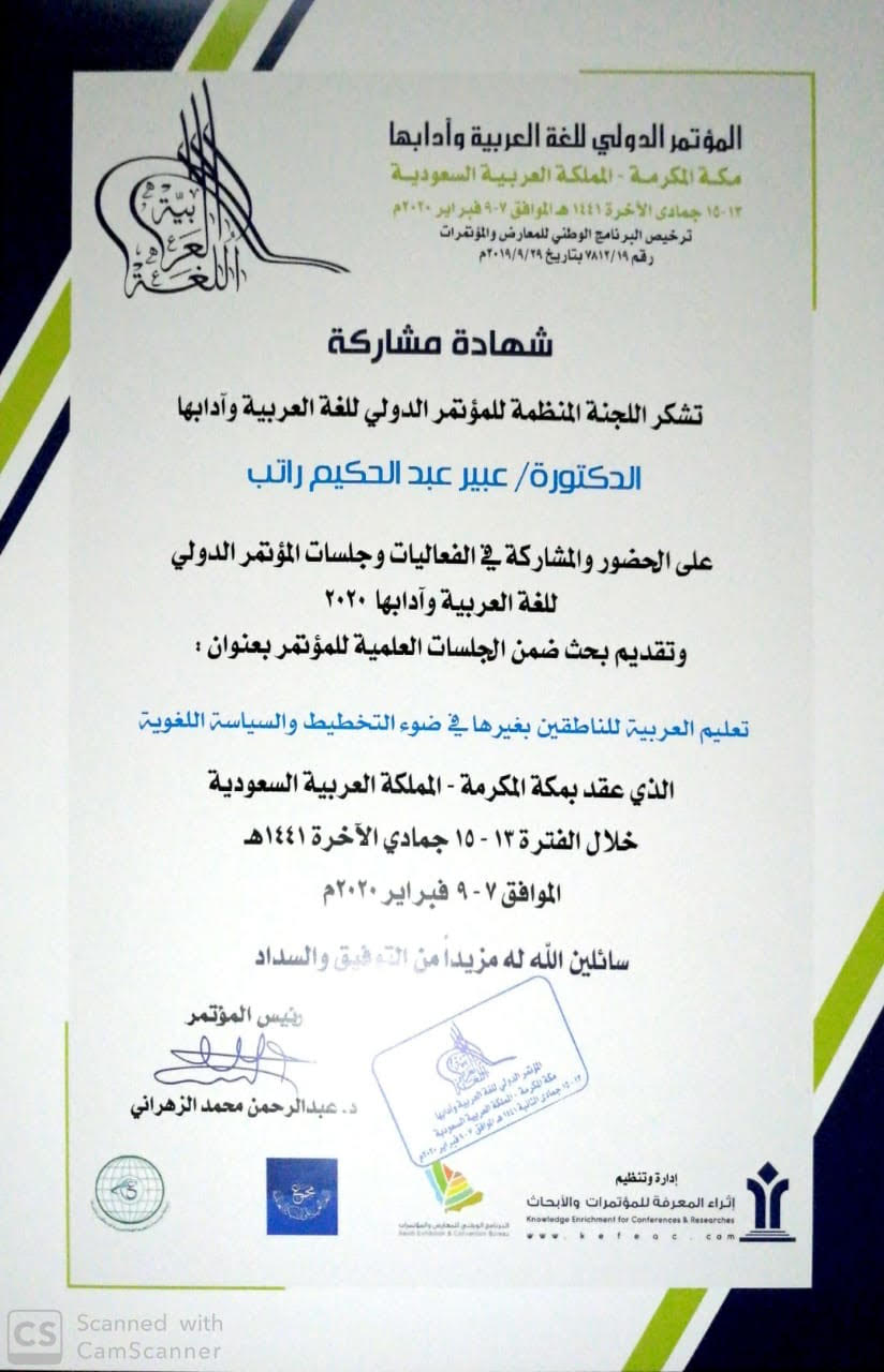 ضمن فعاليات المؤتمر الدولي للغة العربية وآدابها بمكة المكرمة " المنعقد في الفترة ١٣ - ١٦ جمادى الثانية الموافق٧-٩ فبراير ٢٠٢٠ م _ وبمشاركة وحضور أكثر من 100 اكاديمي وباحث . شاركت د. عبير عبد الحكيم راتب عضو هيئة التدريس بقسم اللغة العربية بكلية العلوم والدراسات الانسانية بمحافظة حوطة بني تميم ببحث علمي بعنوان:( تعليم اللغة العربية للناطقين بغيرها في ضوء التخطيط والسياسة اللغوية ) كما اختارتها اللجنة المنظمة للمؤتمر لإدارة الجلسة العلمية التاسعة، وتم تكريمها وتسلمها ثلاث شهادات، حضور، ومشاركة ببحث، وإدارة جلسة علمية .