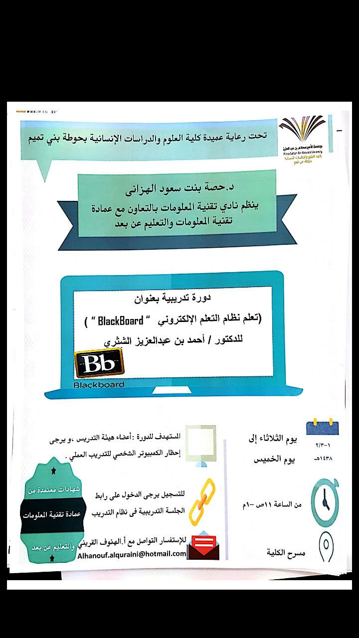 أقام نادي تقنية المعلومات بكلية العلوم والدراسات الإنسانية بحوطة بني تميم بالتعاون مع عمادة تقنية المعلومات والتعليم عن بعد بالجامعة دورة تدريبية بعنوان (تعلم نظام التعلم الإلكتروني “BlackBoard”) للمدرب المعتمد/ الدكتور أحمد بن عبدالعزيز الشثري لمدة ثلاثة أيام ابتداء من اليوم الثلاثاء الموافق 1 /2 /1438هـ المقامة في قاعة الاجتماعات بالدور الأرضي من الساعة الحادية عشر صباحًا وحتى الواحدة ظهرًا، والتي تهدف إلى تنمية معارف المشاركات لاستخدام طرق وتقنيات حديثة للعملية التعليمية وإكساب المعرفة لأعضاء هيئة التدريس بنظام البلاك البوورد لإثراء العملية التعليمية ببرامج حديثة تساعدهم في التواصل مع الطلبة بكفاءة عالية. وقد تضمنت الدورة لليوم الأول العديد من المحاور، منها: التعرف على بوابة التعلم الإلكتروني والأساسيات في التعامل مع النظام وكيفية إنشاء محاضرة لعدة أنواع من المحتوى مع شرح كل نوع بالتفصيل، بالإضافة إلى كيفية إنشاء مجلد يحتوي على العديد من محتوى لمقرر.