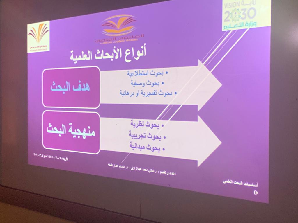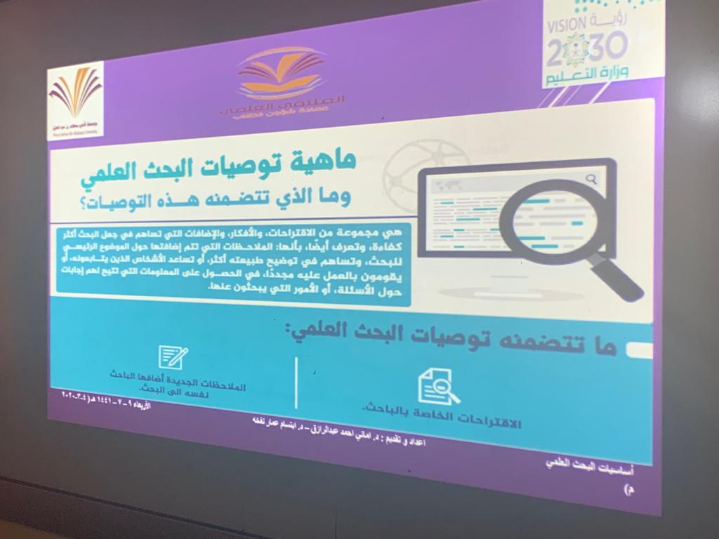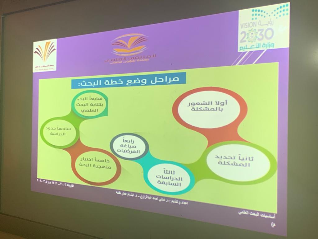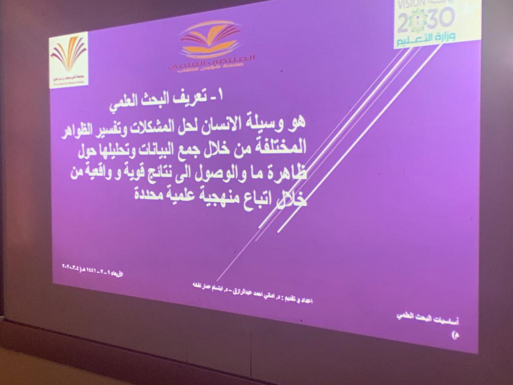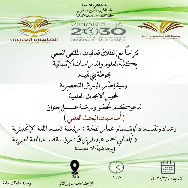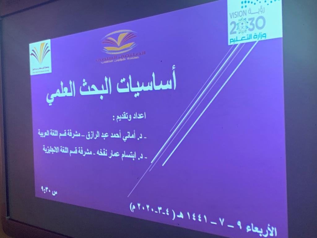 تزامناً مع انطلاق فعاليات الملتقى العلمي الطلابي و في إطار الورش التحضيرية لمحور الابحاث العلمية، بكلية العلوم والدراسات الانسانية بحوطة بني تميم. وتحت قيادة سعادة عميدة الكلية د. حصة بنت سعود الهزاني. قدمت د. أماني أحمد عبدالرازق مشرفة قسم اللغة العربية و د. ابتسام عمار نفخه مشرفة قسم اللغة الانجليزية. ورشة بعنوان "أساسيات البحث العلمي" وذلك في يوم الأربعاء الموافق: 1441/7/9 هـ، في تمام الساعة ٩:٣٠صباحاً. حيث تم التعريف بمفهوم البحث العلمي و عرض صفات الباحث العلمي. ثم تم عرض مراحل البحث العلمي و كيفية كتابته. حضرت الورشة عدد من الطالبات و مجموعة من عضوات هيئة التدريس. تمت مناقشة مختلف مكونات البحث العلمي مع الطالبات الحاضرات لترسيخ المفاهيم لديهن. و في ختام الورشة تم توزيع استمارات المشاركة على الطالبات و تشجيعهن على المشاركة بأبحاث علمية في الملتقى الطلابي.