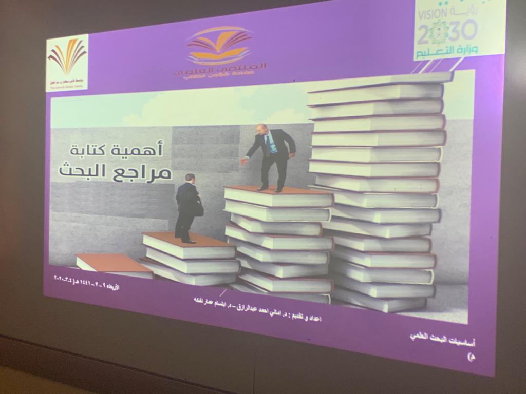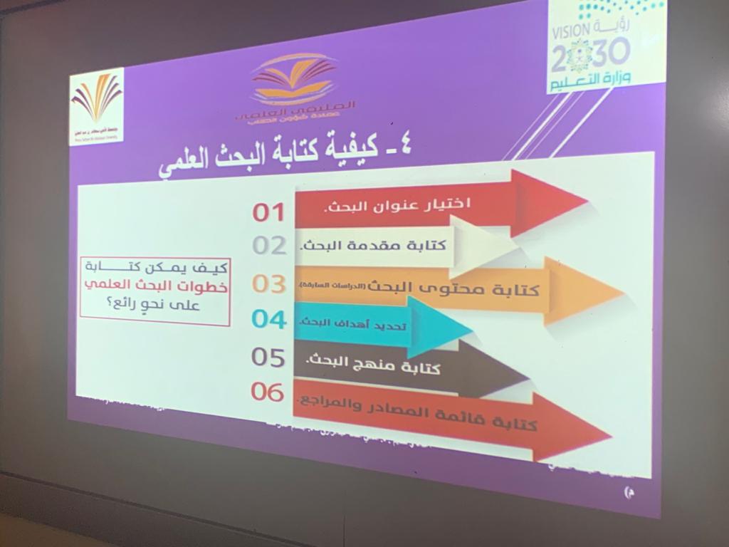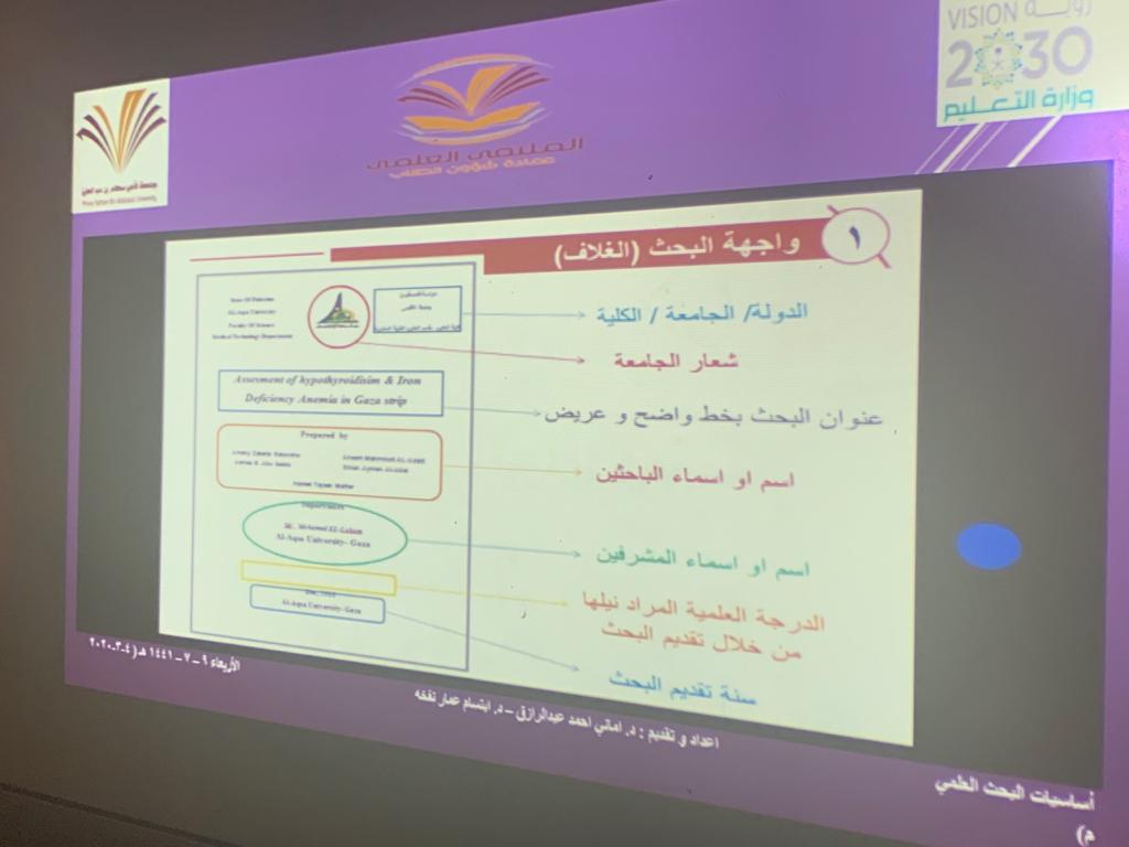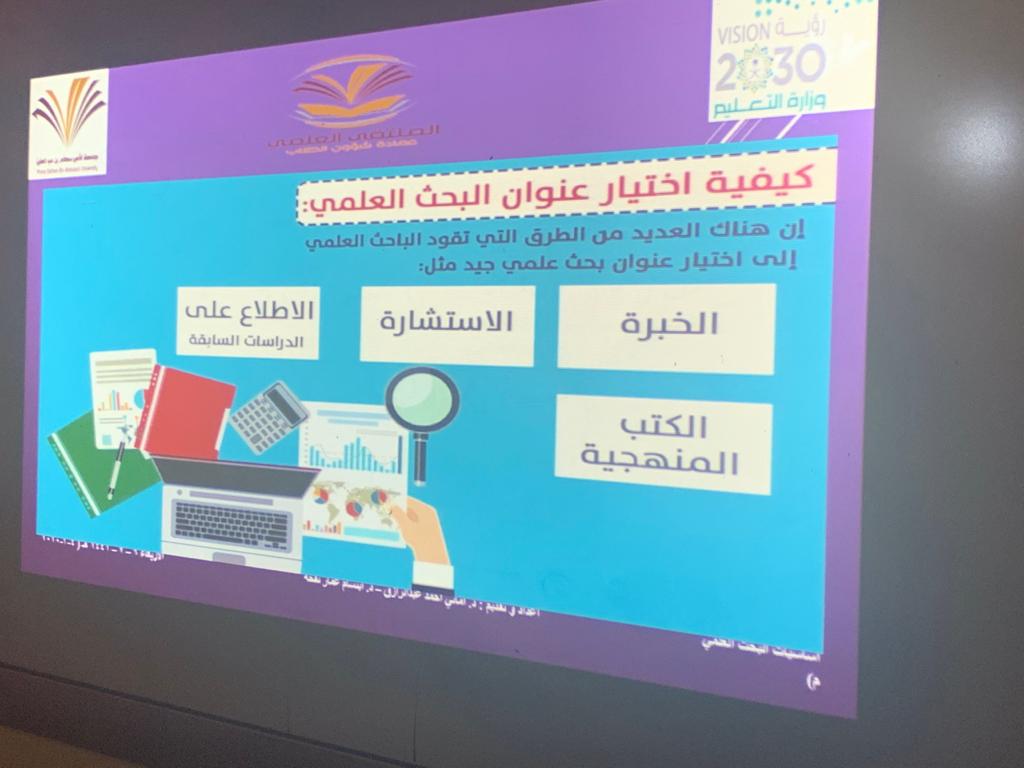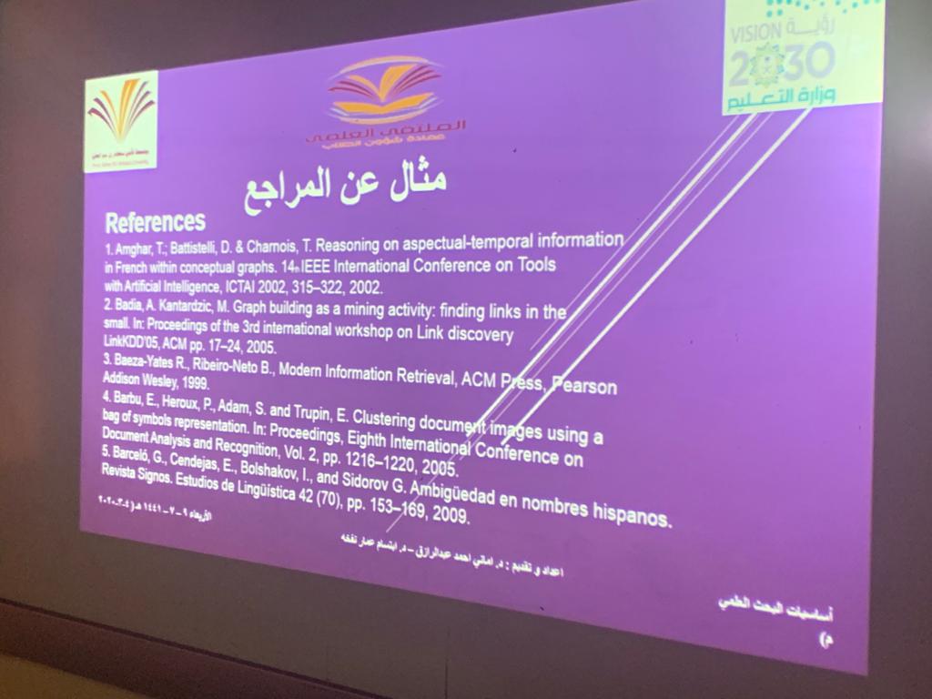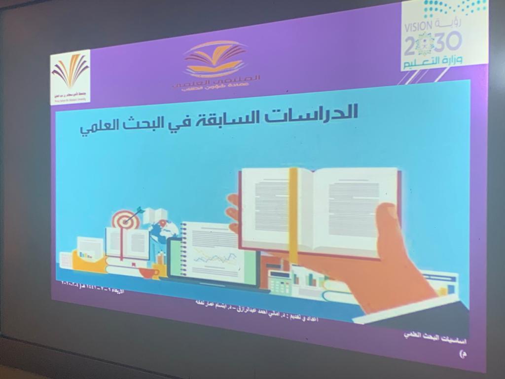 تزامناً مع انطلاق فعاليات الملتقى العلمي الطلابي و في إطار الورش التحضيرية لمحور الابحاث العلمية، بكلية العلوم والدراسات الانسانية بحوطة بني تميم. وتحت قيادة سعادة عميدة الكلية د. حصة بنت سعود الهزاني. قدمت د. أماني أحمد عبدالرازق مشرفة قسم اللغة العربية و د. ابتسام عمار نفخه مشرفة قسم اللغة الانجليزية. ورشة بعنوان "أساسيات البحث العلمي" وذلك في يوم الأربعاء الموافق: 1441/7/9 هـ، في تمام الساعة ٩:٣٠صباحاً. حيث تم التعريف بمفهوم البحث العلمي و عرض صفات الباحث العلمي. ثم تم عرض مراحل البحث العلمي و كيفية كتابته. حضرت الورشة عدد من الطالبات و مجموعة من عضوات هيئة التدريس. تمت مناقشة مختلف مكونات البحث العلمي مع الطالبات الحاضرات لترسيخ المفاهيم لديهن. و في ختام الورشة تم توزيع استمارات المشاركة على الطالبات و تشجيعهن على المشاركة بأبحاث علمية في الملتقى الطلابي.