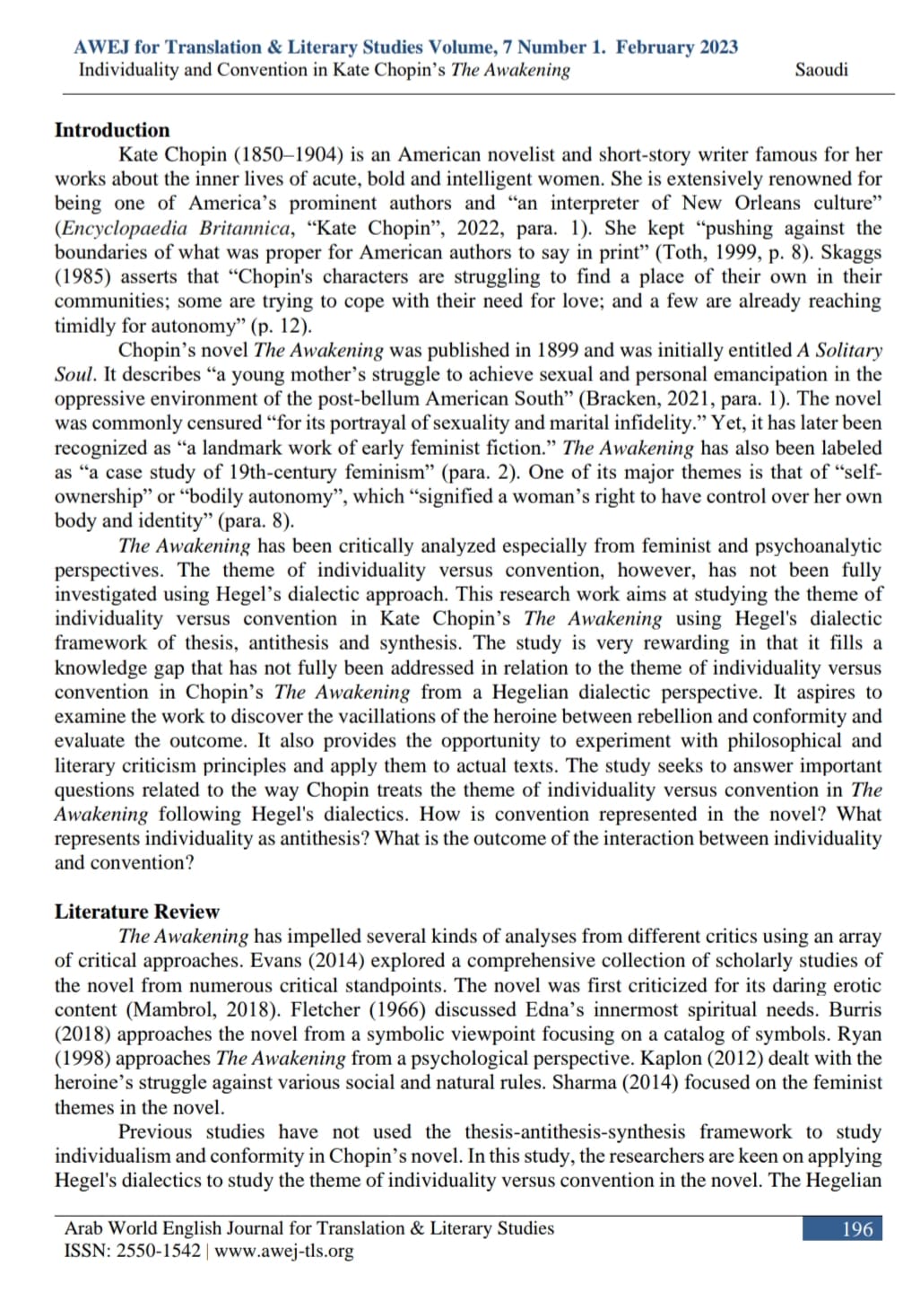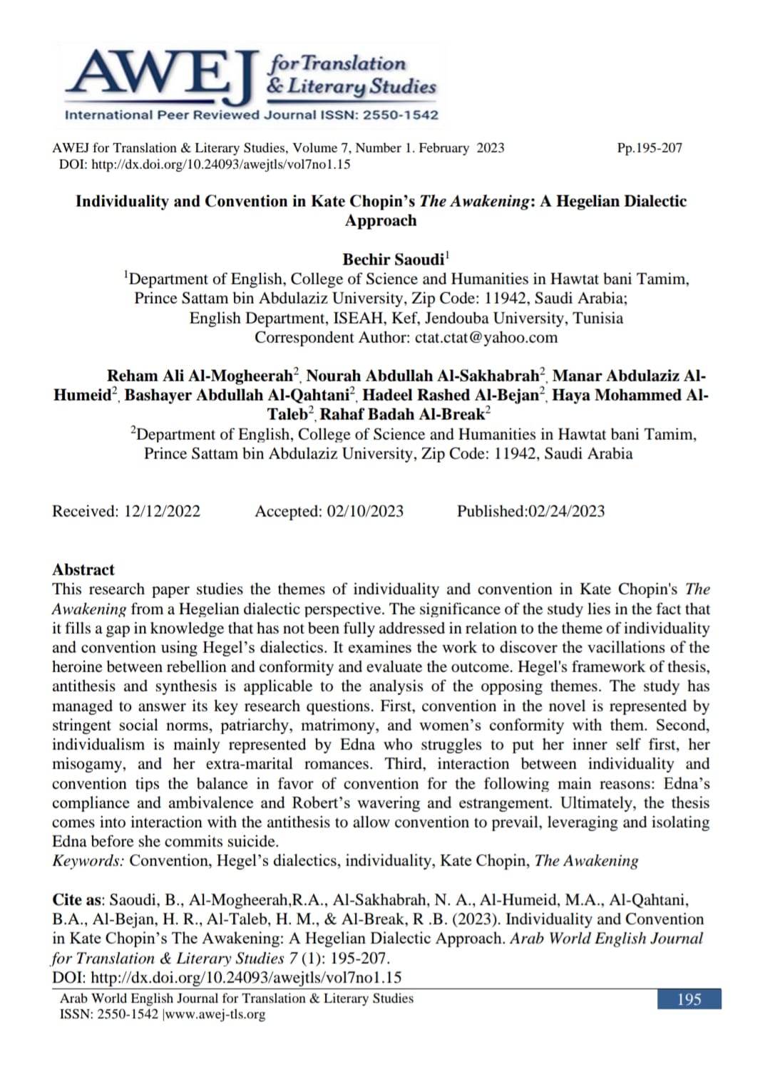 تتقدم لجنة مشاريع التخرج بوحدة الخريجات تحت رعاية سعادة عميدة كلية العلوم والدراسات الإنسانية بحوطة بني تميم د/ حصة بنت سعود الهزاني بأسمى آيات التهاني والتبريكات لخريجات قسم اللغة الإنجليزية المتميزات وهن: رهام علي المغيرة، نورة عبدالله الصخابرة، منار عبد العزيز الحميد، بشاير عبد الله القحطاني، هديل راشد البعيجان، هيا محمد آل طالب ورهف بداح آل بريك على إنجازهن الرائع بنشر مقال علمي مستمد من مشروع بحث تخرجهن في الفصل الدراسي الأول للعام الجامعي 1444 هـ بعنوان “Individuality and Convention in Kate Chopin’s The Awakening” التفرد والانصياع في رواية الإستفاقة للكاتبة الأمريكية كيت شوبين https://awej-tls.org/individuality-and-convention-in-kate-chopins-the-awakening-a-hegelian-dialectic-approach/ والذي يتناول بالنقد والتحليل جدلية الخروج عن المألوف والانصياع المجتمعي المهيمن على معظم جوانب الحياة الواقعية، و ذلك تحت إشراف سعادة د/ بشير حامد السعودي أستاذ الأدب الإنجليزي بقسم اللغة الإنجليزية فله من الشكر أجزله و من الثناء أوفره على دعمه للطالبات و تذليل كافة العقبات حتى توج الإنجاز بنشر المقال بالمجلد السابع، رقم 1 (فبراير 2023) بمجلة Arab World English Journal الصادرة بتكساس في الولايات المتحدة الأمريكية و التي تعد إحدى المجلات العلمية المحكمة المتخصصة في الدراسات الأدبية و الترجمة. نسأل الله العلي القدير دوام التوفيق والسداد ومزيد من المبادرات المشرفة لطالبات وأعضاء هيئة التدريس بكلية العلوم والدراسات الإنسانية بحوطة بني تميم في ظل قيادة رشيدة واعية تشحذ الهمم وتشجع الإبداع وتطمح للعلا.