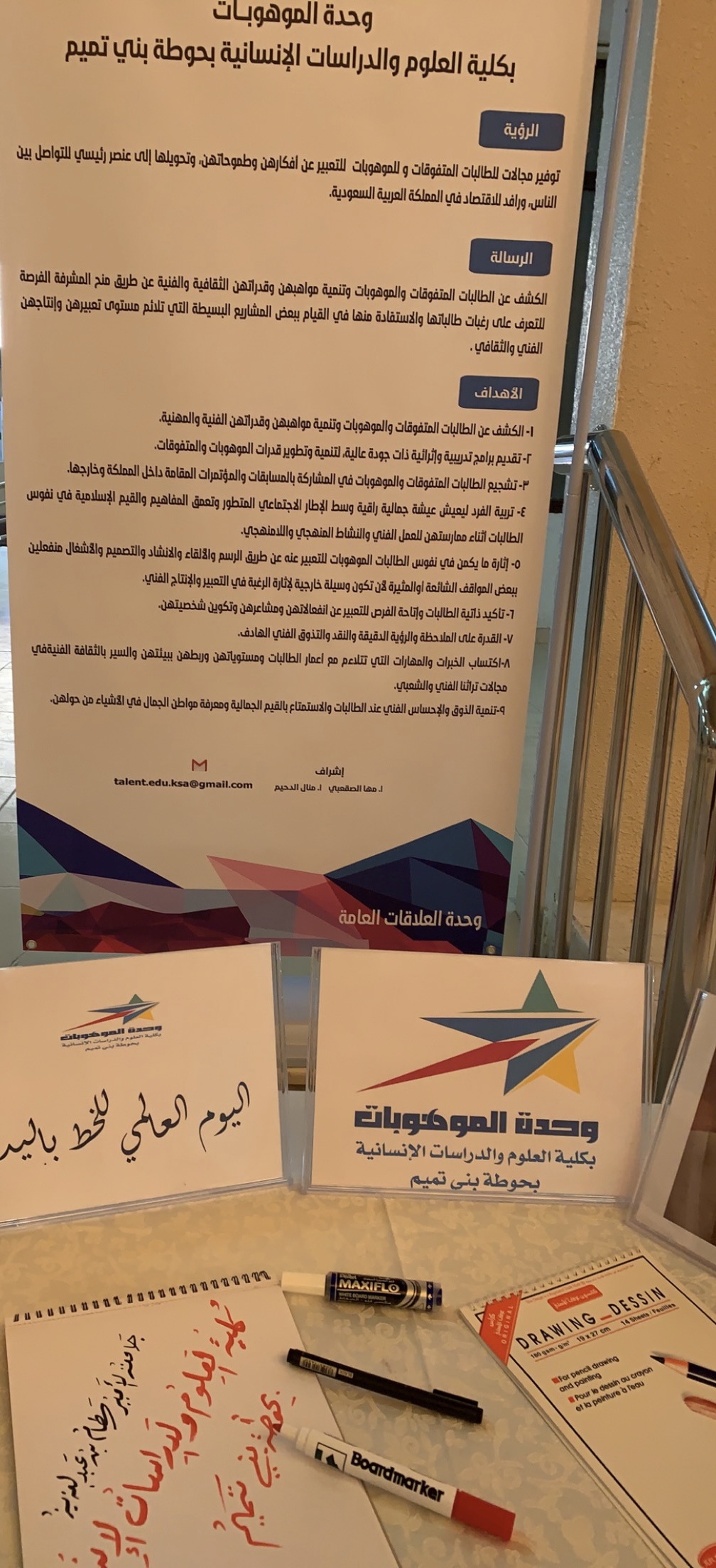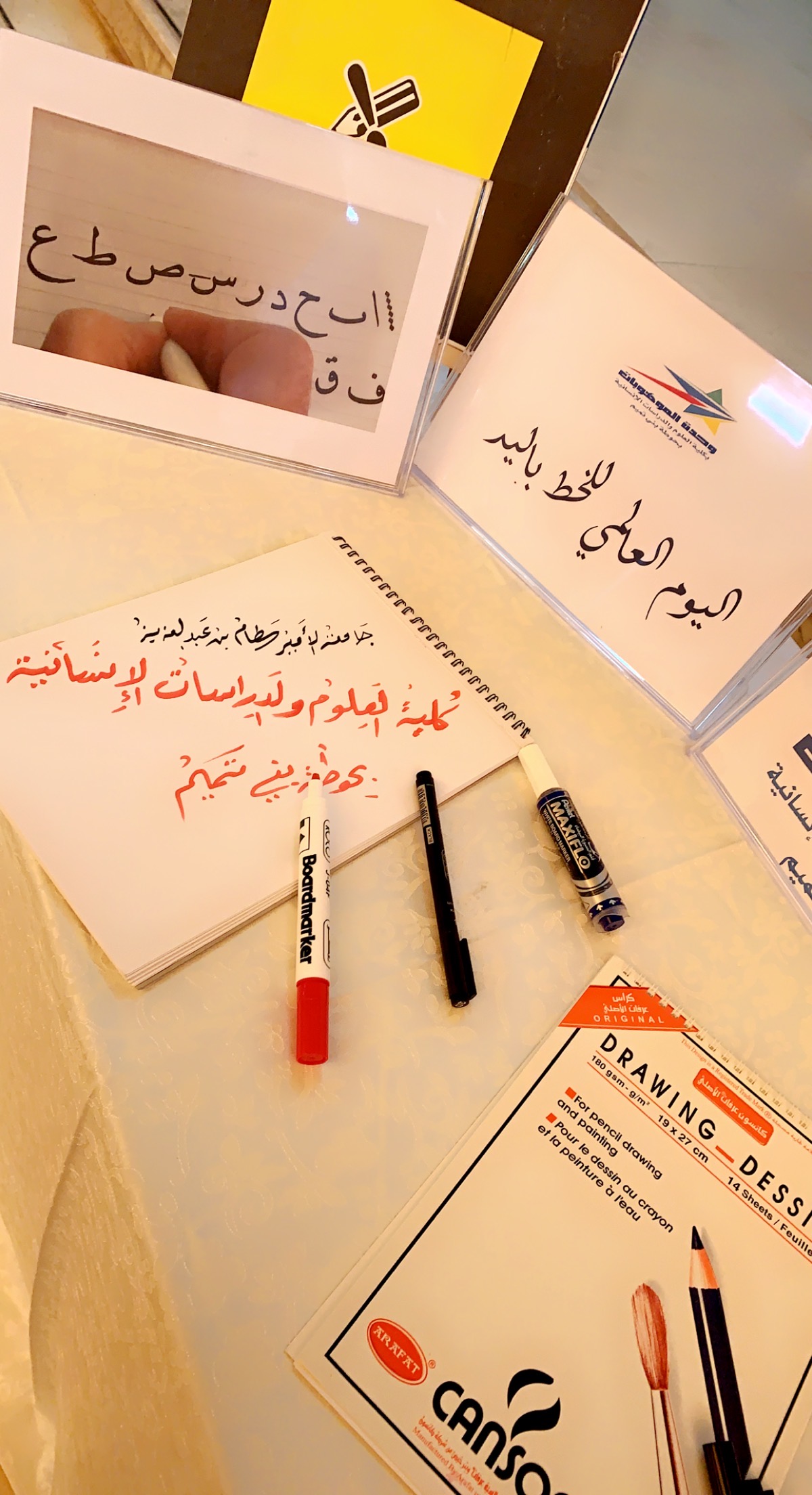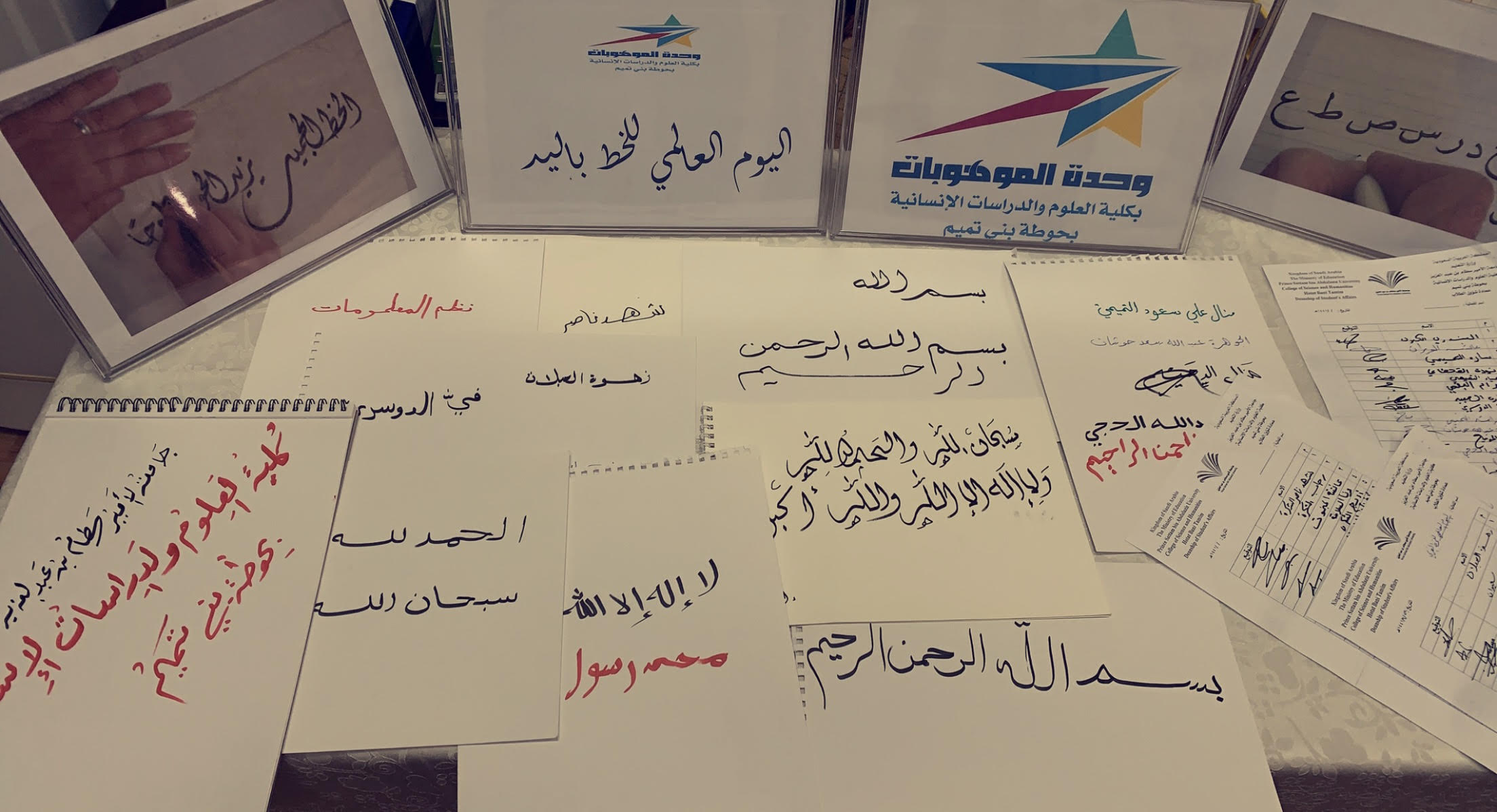 في جو يعلوه نسائم الشتاء الباردة توقدت وحدة الموهوبات تحت رعاية عميدة كلية العلوم والدراسات الإنسانية د/حصة بنت سعود الهزاني بأول فعاليات التحدي التي كانت بعنوان" اليوم العالمي للخط باليد" تحت إشراف مشرفة الوحدة ا. مها الصقعبي و ا. منال الدحيم. وذلك في يوم الأحد الموافق: 1443/6/27هـ الساعة التاسعة صباحاً بساحة الكلية.  حيث أنه في ظل التقنية الإلكترونية عزف الكثير عن الخط باليد والاعتماد على البرامج الخطية الإلكترونية ومن هنا كان لنا لفتة لإبراز موهبة الخط وتفعيل الخطوط اليدوية، حيث تم انطلاق الفعالية في ساحة الكلية بين جمال الخط وروعة الثقة وسمو اختيار القلم للخط واكتشاف الطالبات الموهوبات وقد لامست الفعالية حماساً من الطالبات والمنسوبات وقدمت الجوائز للمشاركات معبرين لهم بالشكر والثناء على التفاعل والترقب للتحديات القادمة.