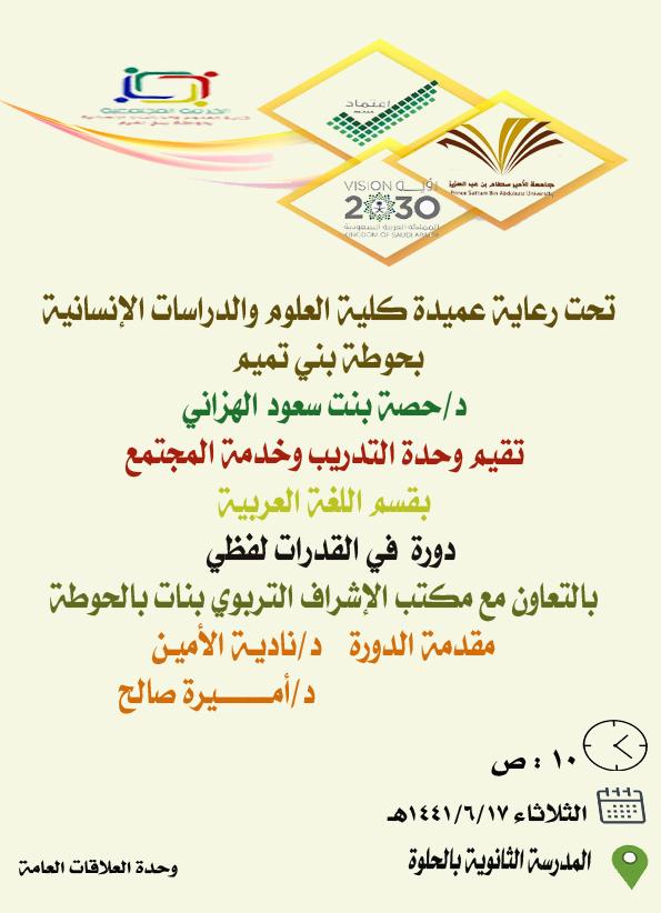 لرفع نسبة الاستعداد النفسي والمعرفي لدى الطالبات المتقدمات لاختبارات القدرات العامة. نظمت وحدة التدريب وخدمة المجتمع بقسم اللغة العربية بكلية العلوم والدراسات الإنسانية بحوطة بني تميم دورة تدريبية في القدرات القسم اللفظي بالتعاون مع مكتب الاشراف التربوي بنات بالحوطة. تحت قيادة عميدة الكلية الدكتورة/ حصة بنت سعود الهزاني. وذلك يوم الثلاثاء الموافق: 1441/6/17هـ. فُعلت هذه الدورة في المدرسة الثانوية بالحلوة للبنات. بتنظيم د. نادية الأمين و د. أميرة صالح، وهدفت إلى تعليم الطالبات الآليات والاستراتيجيات للحصول على أفضل نتيجة في اختبار القدرات، وذلك بتعريفهن باختبار القدرات وأقسامه مع عرض أمثلة لأسئلة الاختبار ومناقشتها معهن، وقد شهدت الدورة تفاعلاً واهتمامًا من قبل الطالبات.