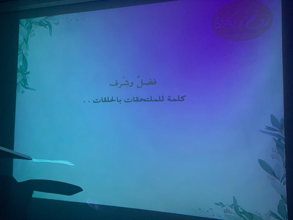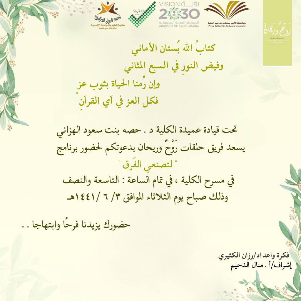 حينما يقل الزاد ويبلغ العبد العتاد وتضيق به يبقى كتاب الله أنيس الروح وطمأنينة للقلوب وسلامة للصواب, من هذا المنطلق نظم فريق حلقات روح وريحان تحت قيادة عميدة كلية العلوم والدراسات الانسانية بحوطة بني تميم د. حصة بنت سعود الهزاني, برنامجاً بعنوان "اصنعي الفرق" وذلك يوم الثلاثاء الموافق ١٤٤١/٦/٣ هـ, في تمام الساعة ٩:٣٠ بمسرح الكلية بإشراف ا:منال الدحيم, يهدف هذا البرنامج إلى بث الحماس والهمة لانطلاقة حلق القرآن والانضمام لها حيث بدا البرنامج بآيات من القرآن, تلى ذلك كلمة الملتحقات بحلقات القرآن قدمتها منظمة فريق روح وريحان الطالبة رزان الكثيري, وتم عرض مونتاج وقود القران لإشعال الهمم وإعادتها, وشرح طريقة التسجيل في الحلقات والانضمام لها, وشهد هذا البرنامج حضور منسوبات الكلية من هيئة أعضاء التدريس والإداريات والطالبات, كما صاحب البرنامج أركان نالت على إعجاب الجميع.