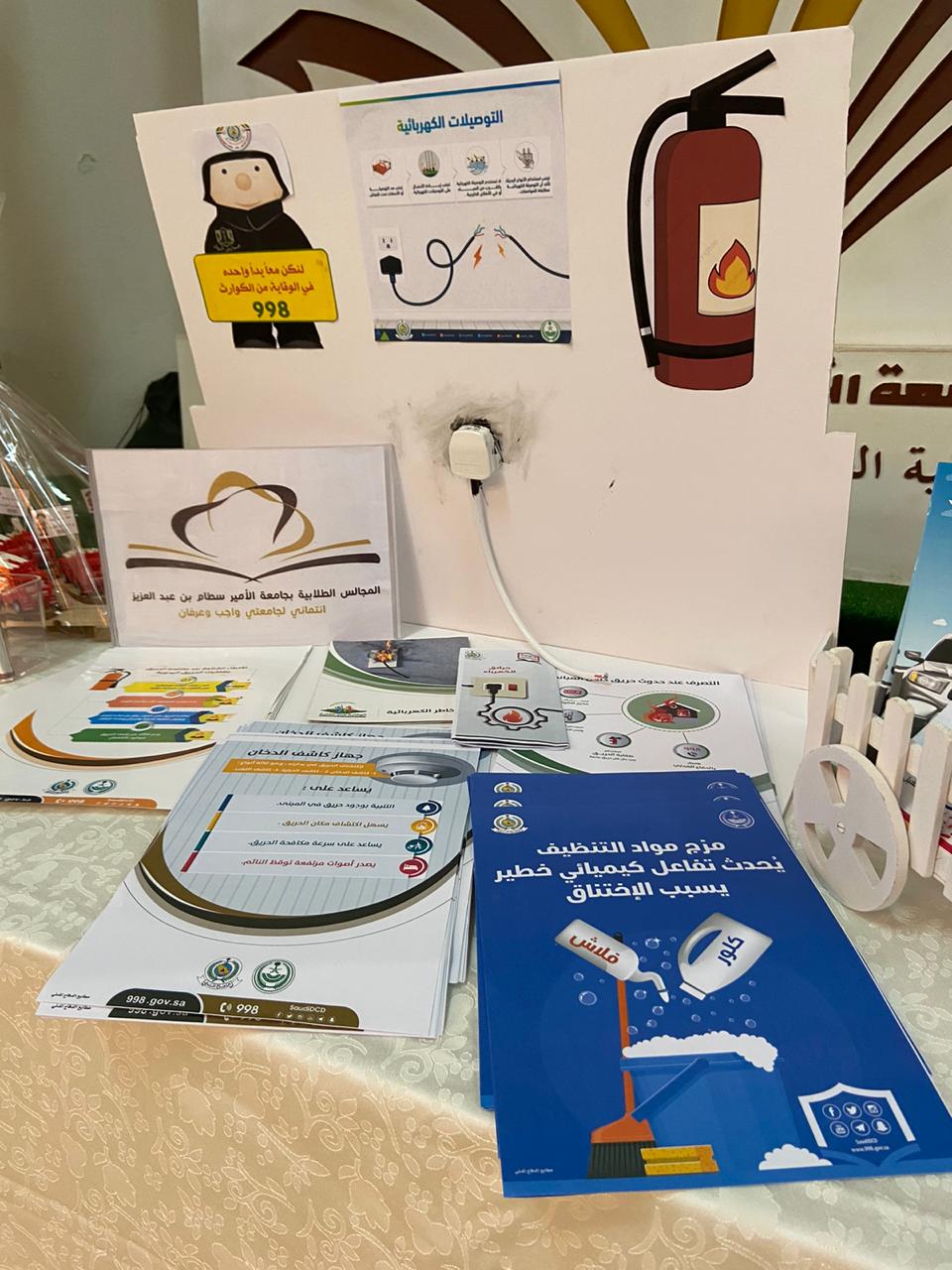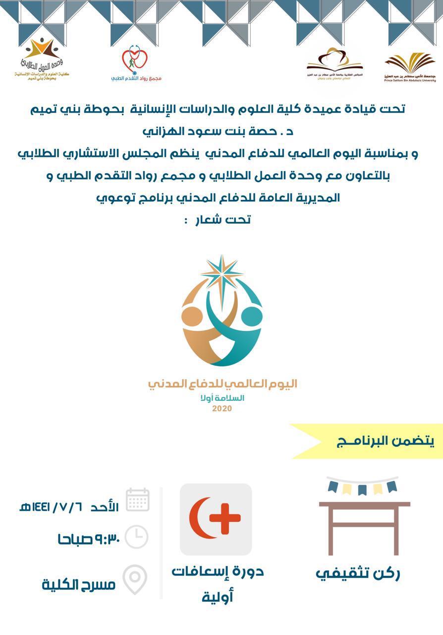 تقديراً لما تقوم به أجهزة الدفاع المدني من جهود عظيمة ومتواصلة للحفاظ على أمن وسلامة المجتمعات من خطر الكوارث والتقليل من آثارها المأساوية، نظم المجلس الاستشاري الطلابي ووحدة العمل الطلابي بالتعاون مع مجمع رواد التقدم الطبي والمديرية العامة للدفاع المدني برنامجاً تثقيفياً بمناسبة اليوم العالمي للدفاع المدني تحت شعار (السلامة أولاً) تحت قيادة عميدة كلية العلوم والدراسات الإنسانية بحوطة بني تميم د. حصة بنت سعود الهزاني، وذلك في يوم الأحد الموافق ٦ / ٧/ ١٤٤١هـ. بإشراف منسقة المجالس الطلابية أ. منيره إبراهيم التميمي و أ. ندى التميمي بوحدة العمل الطلابي. بهدف التوعية بأهمية السلامة كسلوك وتطبيق في حياة الناس اليومية بحيث يكون الأخذ بمبدأ السلامة أولاً قبل أي عمل أو سلوك ينطوي على خطر في أعمالنا وسلوكنا اليومي في جميع مجالات الحياة، تضمن البرنامج إقامة ركن تثقيفي يحتوي على منشورات توعوية مقدمة من المديرية العامة للدفاع المدني، بالإضافة إلى دورة تدريبية عن الإسعافات الأولية للحوادث المنزلية قدمتها كلاً من الطبيبة مي عوض والطبيبة هالة عاطف.  حيث تهدف هذه الدورة إلى التعريف بالإسعافات الأولية وأهميتها في الحد من الحوادث وتقليل أثرها، وكيفية تقديم الإسعافات اللازمة في حالات الطارئة مثل ( الحروق، الجروح، الاختناق، الغيبوبة). حيث أن التعامل مع مثل هذه الحالات بشكل صحيح وعلى أسس علمية يشكل ضرورة هامة للحفظ على حياة الأشخاص.