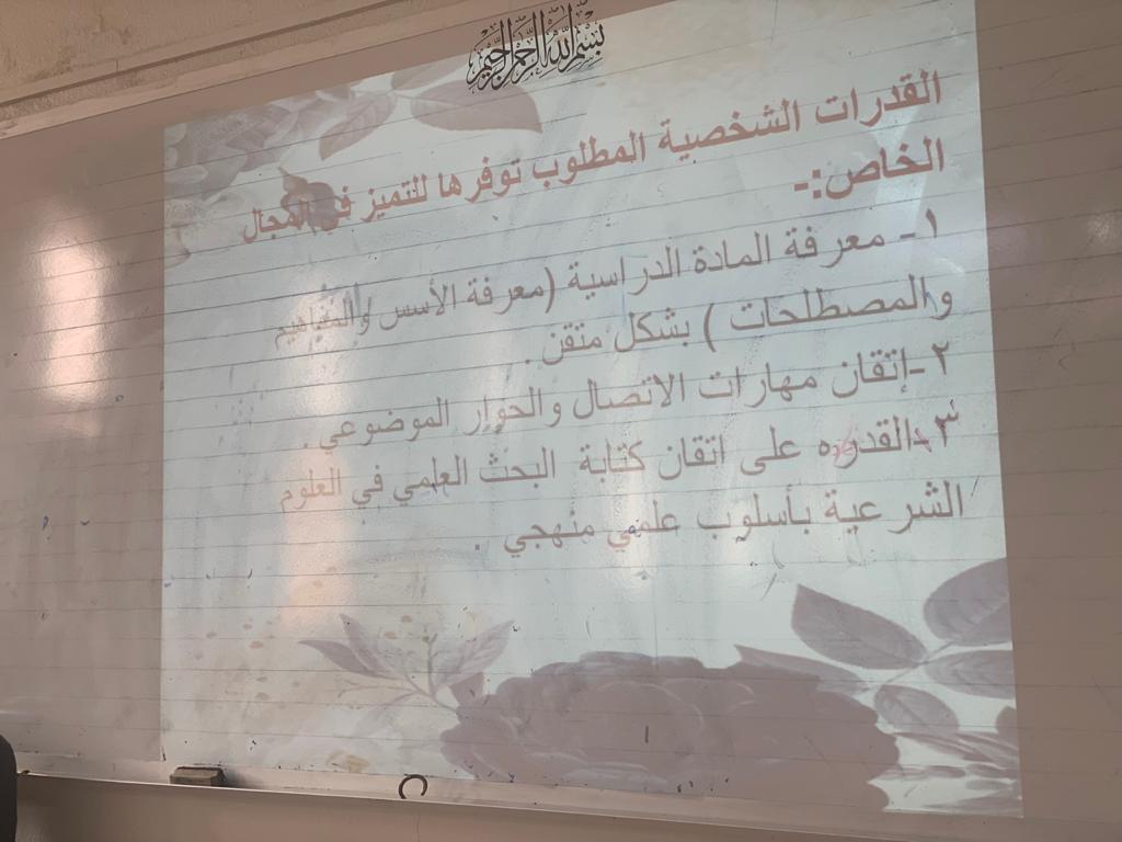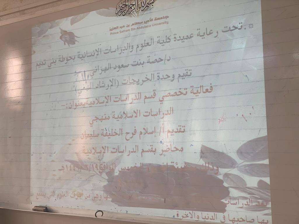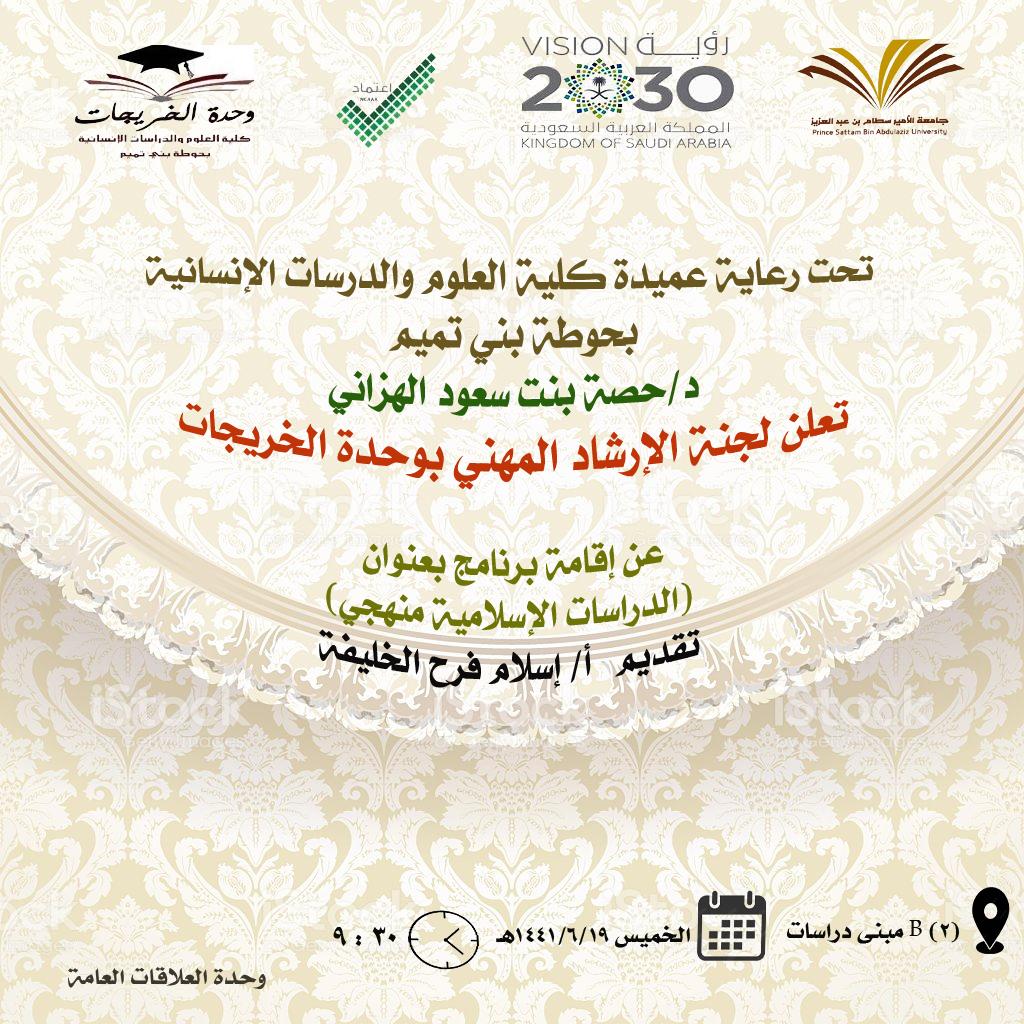 في خضم برامج التوعية لطالبات كلية العلوم والدراسات الإنسانية بحوطة بني تميم، و تحت قيادة عميدة الكلية د. حصة بنت سعود الهزاني، نظمت وحدة الخريجات متمثلة بلجنة الإرشاد المهني بقسم الدراسات الإسلامية برنامج بعنوان( الدراسات الإسلامية منهجي) في تمام الساعة التاسعة والنصف صباحاً من يوم الخميس الموافق: 1441/6/19هـ. من تقديم الأستاذة /إسلام فرح الخليفة محاضر بقسم الدراسات الإسلامية. حيث تم فيه التعريف بالقدرات الشخصية المطلوب توفرها للتميز في مجال الدراسات الإسلامية، وتوصيف للمهنة، والقدرات الشخصية المطلوب توفرها في التخصص الدقيق، والمهارات المكتسبة للتميز في المهنة والشهادات المهنية اللازمة. وفي ختام البرنامج تمت الإجابة على تساؤلات الطالبات.