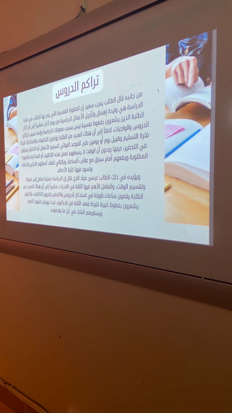 بدأ البرنامج بمقدمة عن الضغوط الدراسية والسلبيات الناتجة عن تراكم التكاليف والمتطلبات، وكذلك طرح لمجموعة تجارب لطلبة مع الضغوط الدراسية وآلية التغلب عليها. واختتم بمجموعة من النصائح للتخلص من ضغوط الدراسة ونصائح خاصة لأيام الاختبارات.