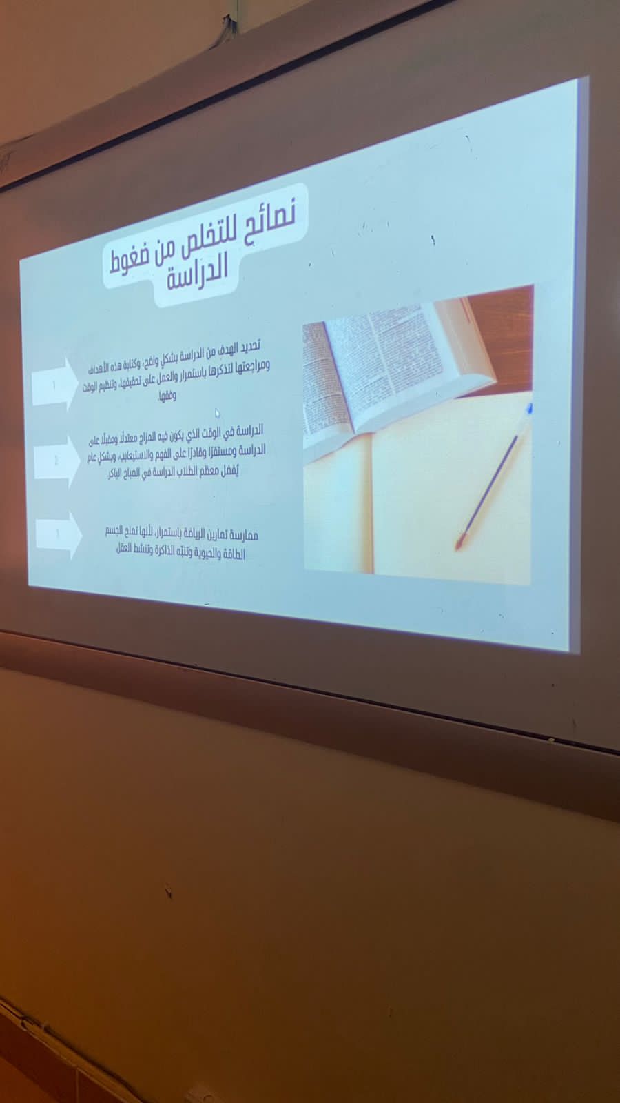 يمر الفرد بضغوطات عديدة قد تكون روتينية وأخرى انتقالية ومن أحد الضغوطات التي لا مفر منها الضغوطات الدراسية التي يمر بها الطالب طوال سنوات دراسته والتي قد تؤثر على صحته النفسية وربما الجسدية مما يؤثر سلبا على العمل بكفاءة وإتمام المهام المطلوبة في وقت مناسب وبجودة عالية، ولأهمية ذلك نظم المجلس الاستشاري الطلابي بإشراف أ. منيره إبراهيم التميمي وبرعاية كريمة من عميدة كلية العلوم والدراسات الإنسانية بحوطة بني تميم د. حصة بنت سعود الهزاني برنامج بعنوان (كيف تتعاملين مع الضغوط الدراسية). قدمته رئيسة المجلس الطلابي الطالبة مي العميره يوم الثلاثاء الموافق 29/ 8/ 1444هـ. يهدف هذا البرنامج إلى توجيه الطالبات نحو الطرق الفاعلة في التغلب على المشكلات وكيفية التعامل معها بكفاءة عالية وكذلك الحرص على رفع التحصيل العلمي والنضج الفكري لديهم.