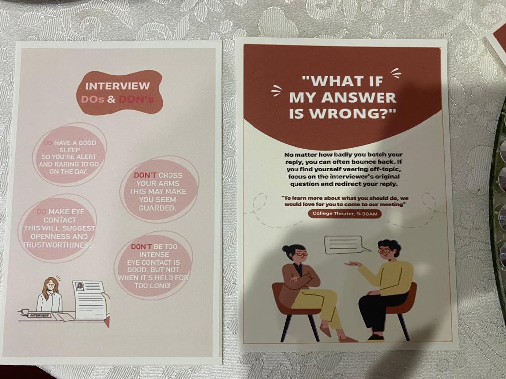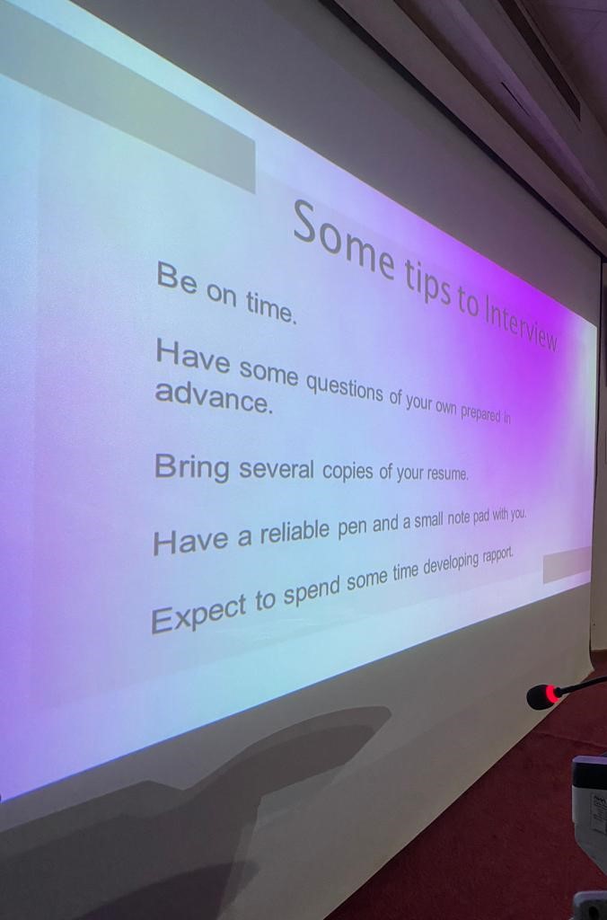 حيث تحدثن الطالبات باللغة الإنجليزية عن عدة محاور ومنها: نصائح للمقابلة للحصول على وظيفة، والخطوات التي يجب القيام بها قبل وأثناء المقابلة، كما تم طرح سؤال "ما نقاط القوة ونقاط الضعف لديك؟ "وبعض النصائح للتعامل مع هذا النوع من الأسئلة، وذلك في ظل حضور عدد من الطالبات والمنسوبات.
