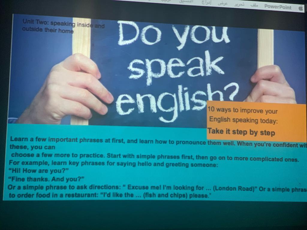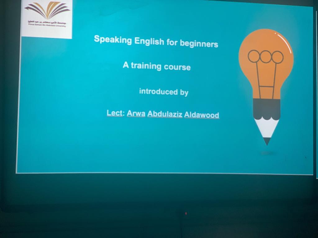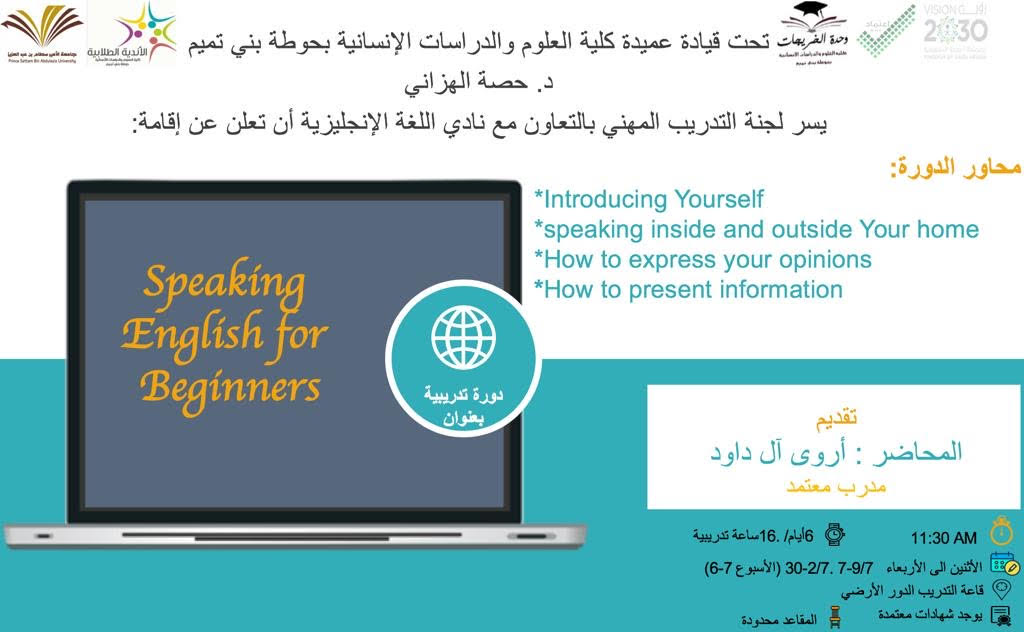 نظم نادي اللغة الإنجليزية بالتعاون مع التدريب المهني التابع لوحدة الخريجات دورة بعنوان (تحدث اللغة الإنجليزية للمبتدئين- Speaking English for beginners). تحت قيادة عميدة كلية العلوم و الدراسات الإنسانية بحوطة بني تميم الدكتورة حصة بنت سعود الهزاني. بدأت من يوم الاثنين الموافق: 1441/6/29 هـ. في قاعة التدريب من تقديم الأستاذة أروى آل داود و ذلك لمدة أسبوعين متتالين بما يعادل ستة عشرة ساعة تدريبية. و قدمت الدورة أساسيات المحادثة و الحوار و التعبير عن الرأي باللغة الانجليزية. هدفت الدورة إلى تعزيز مهارات التحدث عند المشاركين و تعزيز ثقتهن في التعبير عن الرأي و الحوار. و شارك في الدورة مجموعة من الطالبات في مختلف المستويات وبعض من الأستاذات من مختلف الأقسام.