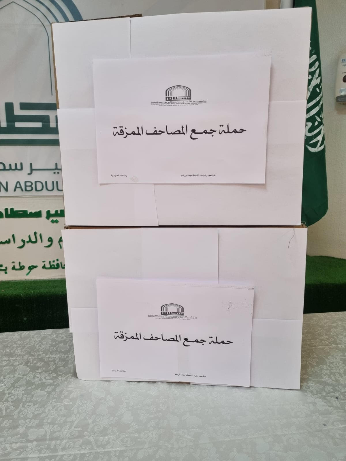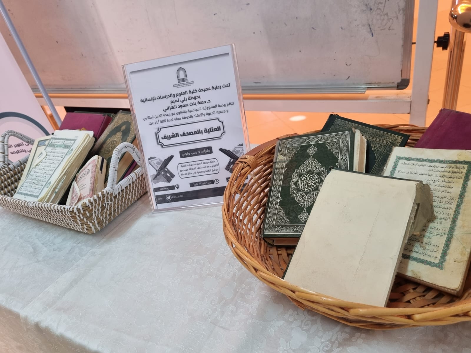 تحت رعاية عميدة كلية العلوم والدراسات الإنسانية بحوطة بني تميم د. حصة بنت سعود الهزاني نظمت وحدة الخدمة المجتمعية بالكلية بالتعاون مع وحدة النشاط الطلابي وجمعية الدعوة والإرشاد بحوطة بني تميم حملة بعنوان:( العناية بالمصحف الشريف)، بهدف جمع المصاحف الممزقة.