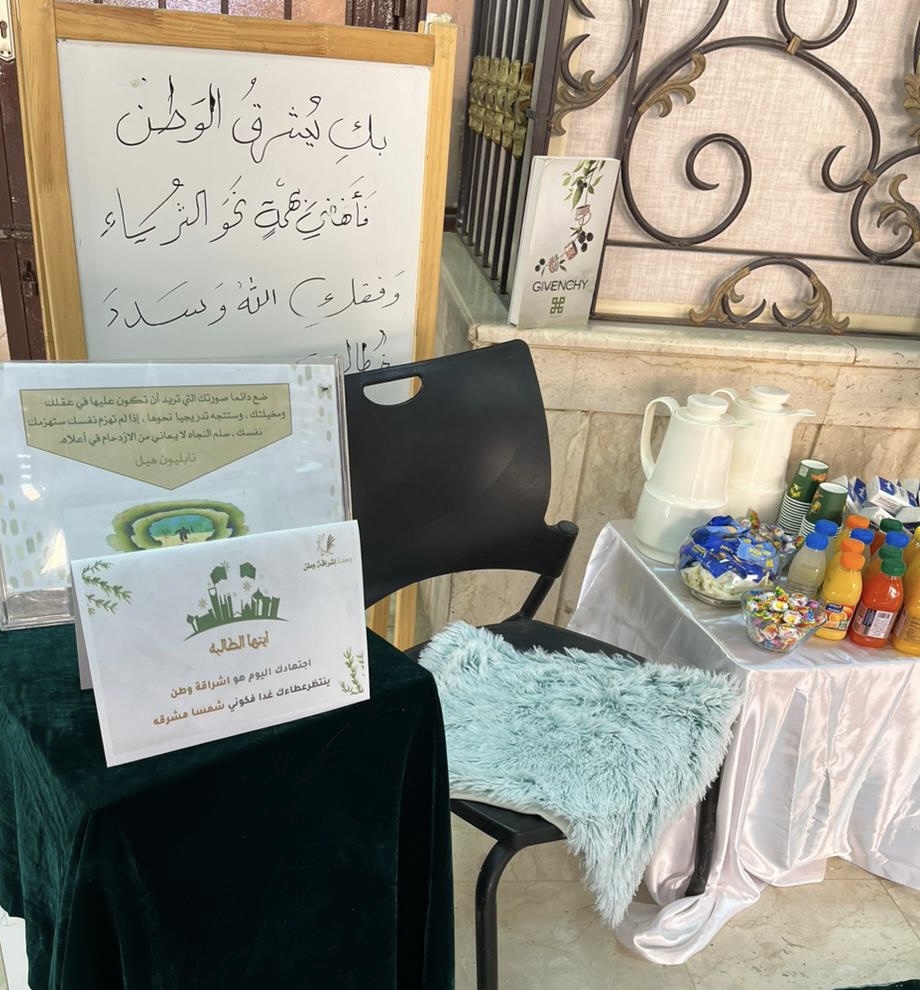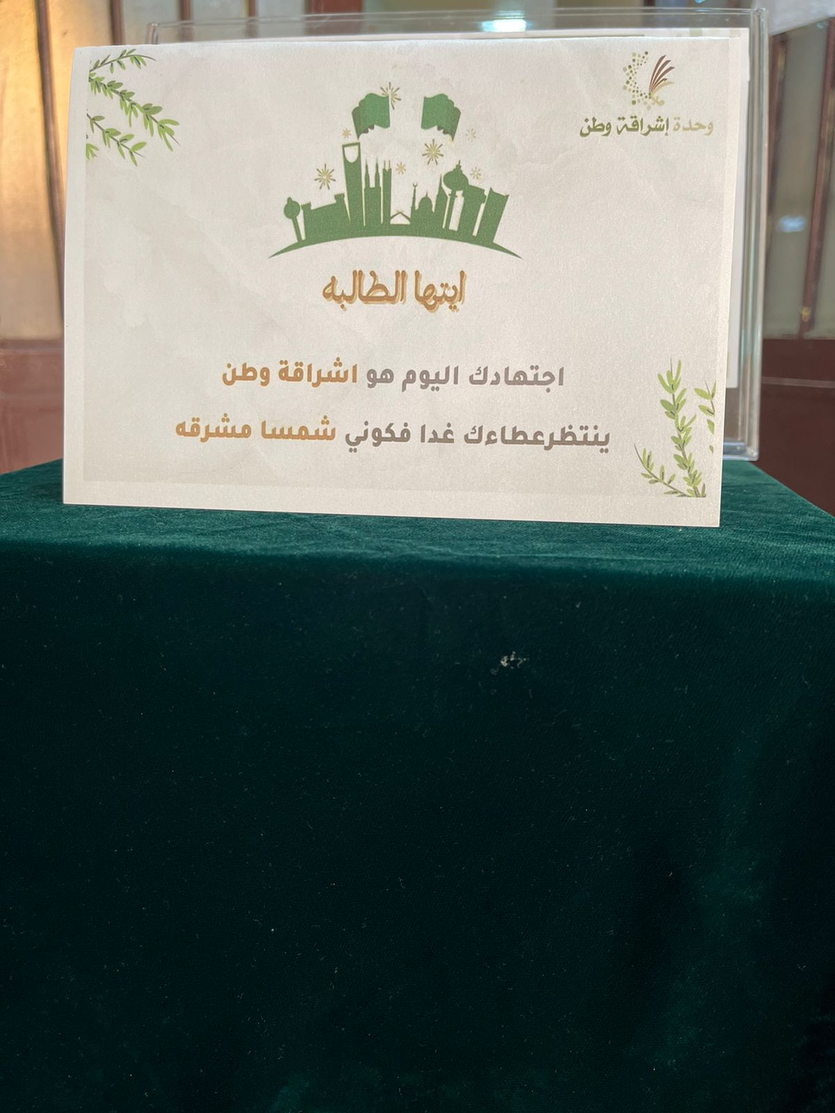 تحت رعاية عميدة كلية العلوم والدراسات الإنسانية بحوطة بني تميم د. حصة بنت سعود الهزاني نظمت وحدة إشراقة وطن مبادرة (عطاؤكم فخر للوطن ٣) يوم الثلاثاء الموافق: 1444/11/10 هـ بتمام الساعة 8:00 صباحًا بإشراف ا/منال الدحيم والفريق التابع لها.  تهدف هذه المبادرة لتعزيز روح الانتماء مع الطالبات في أيام الاختبارات، وقد تم انطلاق المبادرة في فترة الاختبارات العملية متمنين لطالباتنا التقدم والنجاح، وهي عبارة عن ركن يشمل احتياجات الطالبة في فترة الاختبارات وركن للقهوة والشاي محفوفا بعبارات ودعوات للطالبات بالتوفيق والسداد واعتزازاً بالدين والوطن، كما تم التنبيه على بعض ما قد يقع من سلبيات أثناء فترة الاختبارات والمحافظة على الممتلكات العامة وعلى أوعية العلم واحترامها.