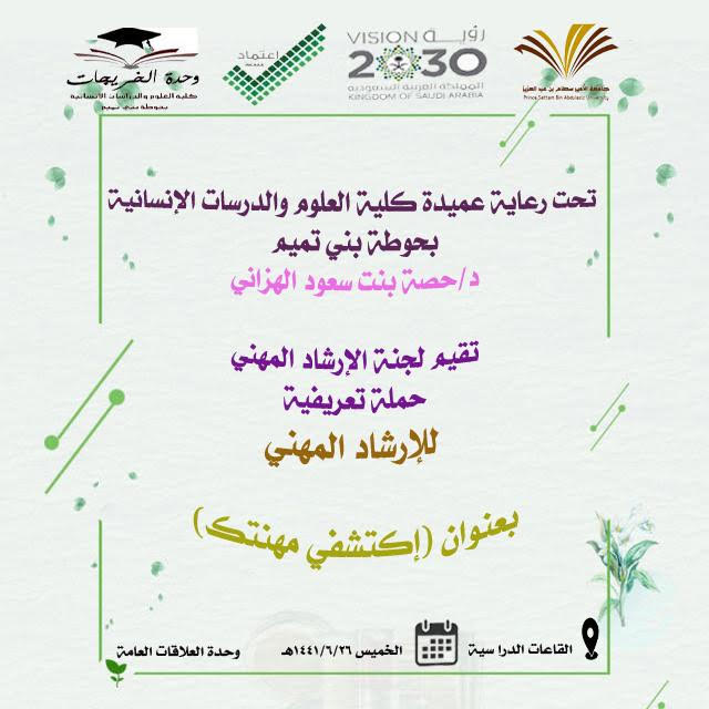 تسعى كلية العلوم والدراسات الانسانية بحوطة بني تميم بقيادة العميدة الدكتورة/ حصة سعود الهزاني إلى توجيه الطالبات للعمل والمهنة التي يمكن من خلالها استثمار طاقاتهن فالأمم تُبنى بسواعد أبنائها، وايضاً لتحسين مستوى معيشتهن وزيادة دخلهن، ومن هذا المنطلق أقامت لجنة الارشاد المهني بوحدة الخريجات برنامج ( اكتشفي مهنتك ) عباره ركن تعريفي يحتوي علي بعض المهن، و ذلك لتمكين الطالبات من النظر إلى جميع المسارات المهنية وقطاعات سوق العمل على نحو متساو بما فيها القطاع الخاص والعمل الحر . وتم ذلك في يوم الخميس الموافق: 1441/6/26هـ . في تمام الساعة9:20 صباحاً.