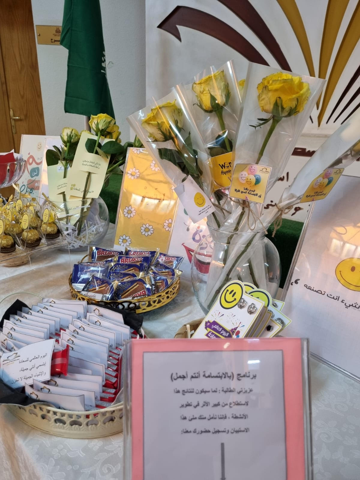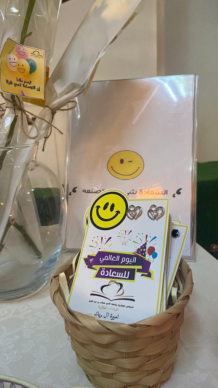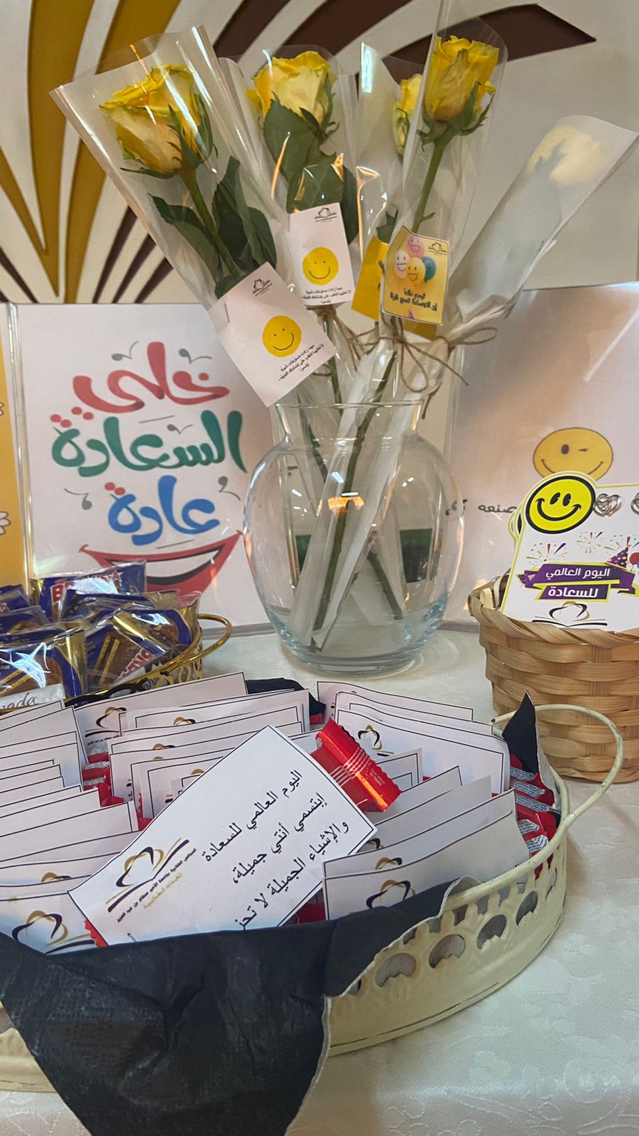 يمثل يوم السعادة حدثًا عالميًا يتم الاحتفال به في جميع أنحاء العالم في يوم 20 مارس من كل عام(International Day of Happiness) بهدف تعزيز مقومات السعادة ونشر الإيجابية بين فئات المجتمع، وبهذه المناسبة نظم المجلس الاستشاري الطلابي بإشراف أ. منيره إبراهيم التميمي وبرعاية كريمة من عميدة كلية العلوم والدراسات الإنسانية بحوطة بني تميم د. حصة بنت سعود الهزاني ركنًا بعنوان (بالابتسامة أنتم أجمل). وذلك في يوم الاثنين الموافق 28/ 8/ 1444هـ الساعة 9:30صباحًا بساحة الكلية.  حيث اشتمل الركن على العديد من العبارات الإيجابية والتوزيعات والورود التي تحمل أجمل العبارات عن تعريف السعادة، وتفعيل مثل هذا الأيام العالمية داخل مقر الكلية له دور للتعريف بمفهوم السعادة الإيجابية وجعلها أسلوب حياة في بيئة العمل للتحفيز على الإبداع والتميز وإدخال البهجة والسرور على منسوبات وطالبات الكلية.