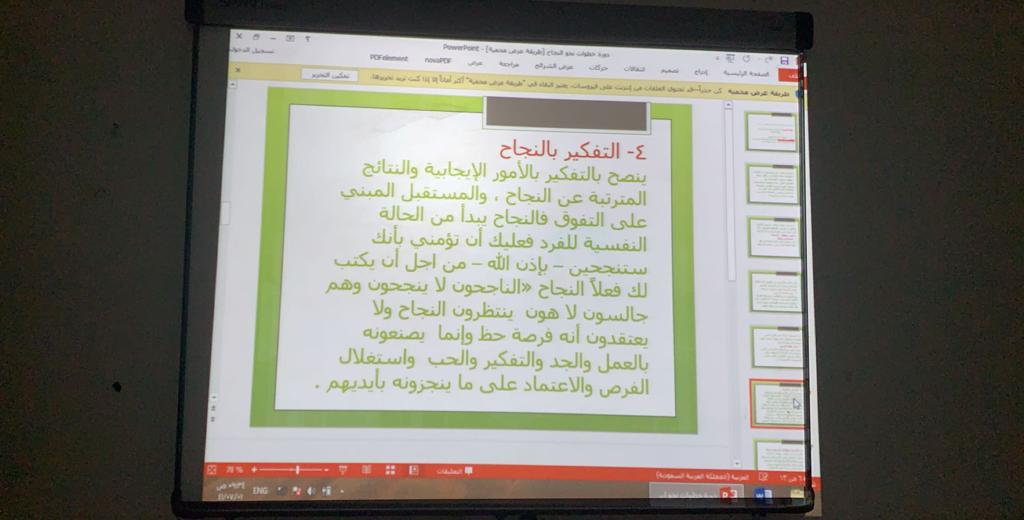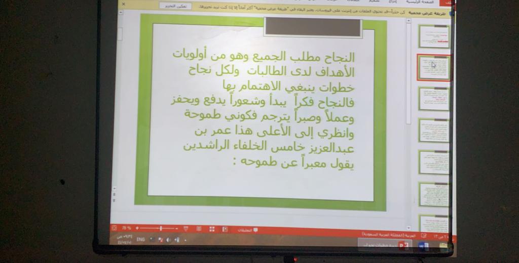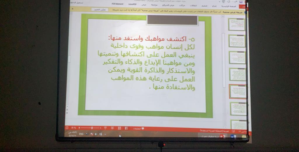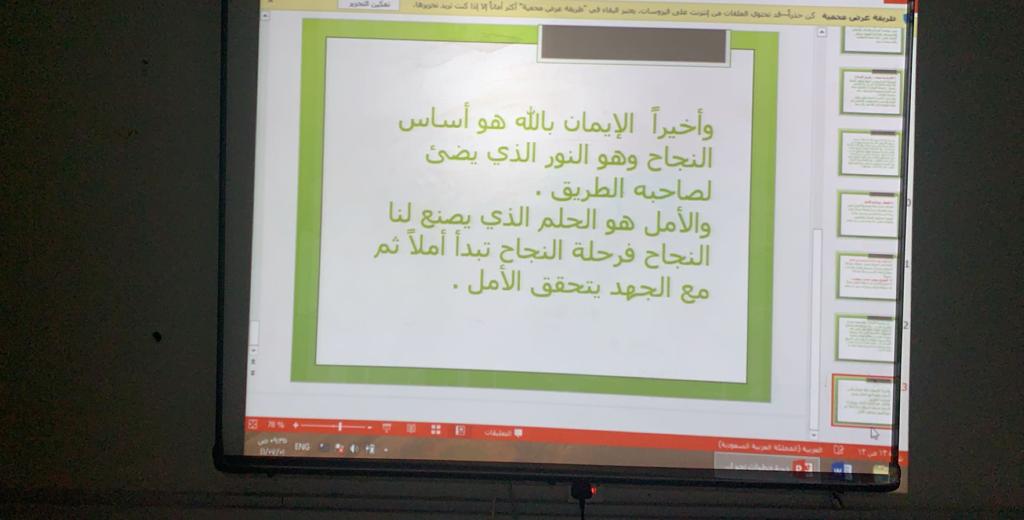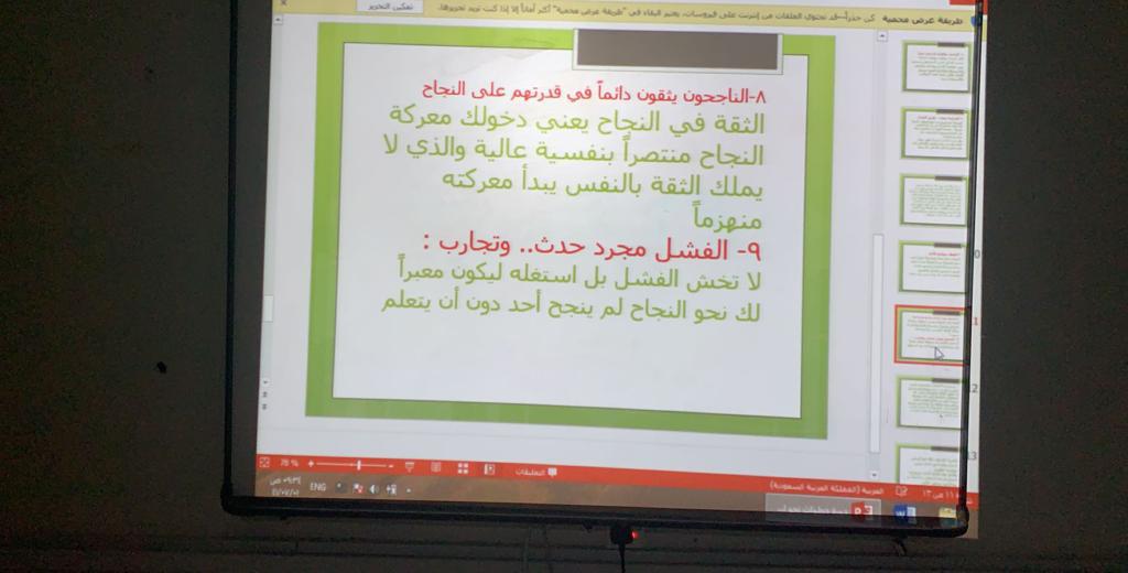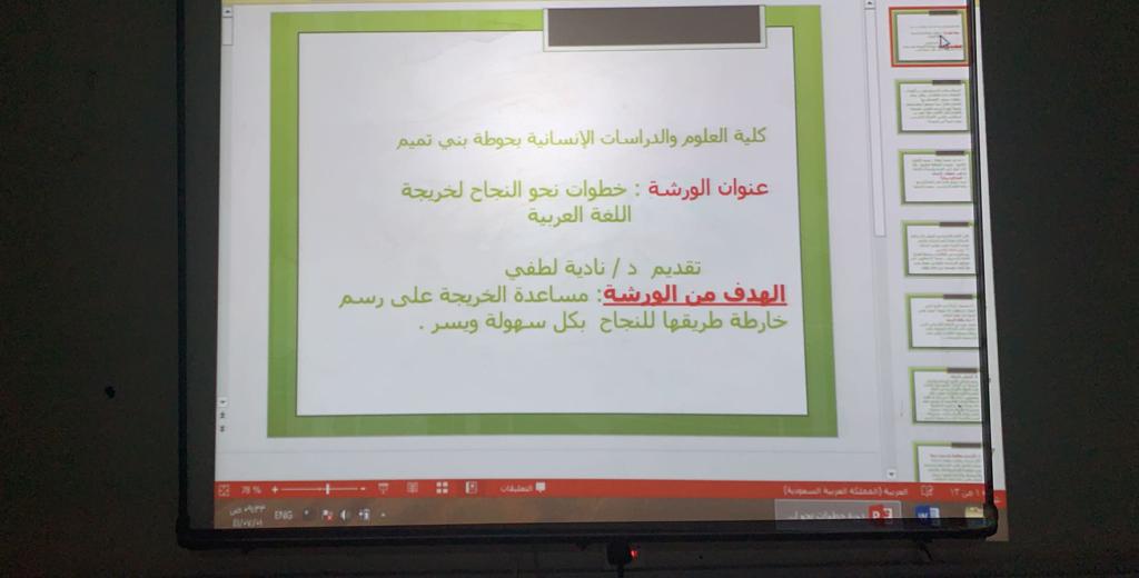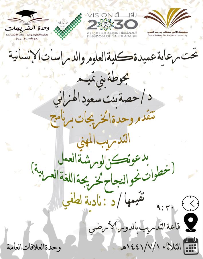 نظمت وحدة الخريجات ممثلة بالتدريب المهني بكلية العلوم والدراسات الإنسانية بحوطة بني تميم، ورشة عمل بعنوان ( خطوات نحو النجاح لخريجة اللغة العربية) تحت قيادة عميدة الكلية د. حصة سعود الهزاني، وذلك في يوم الثلاثاء الموافق: ١/ ٧/ ١٤٤١هـ بقاعة التدريب. قدمتها د. نادية لطفي الأستاذ المساعد بقسم اللغة العربية، حيث رسمت للطالبات طريقا للنجاح، وأرشدتهن لخطوات النجاح وطرائق السير عليها. وختمت الورشة بنماذج ملهِمة للنجاح، وبينت لهن أن الفشل أحيانا ليس عائقا دون النجاح. وقد لاقت الورشة استحسان الحاضرات من الطالبات المتحمسات لشق طريقهن نحو النجاح.