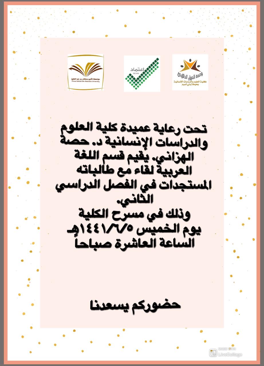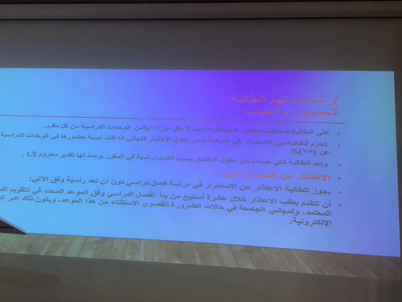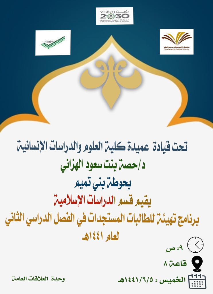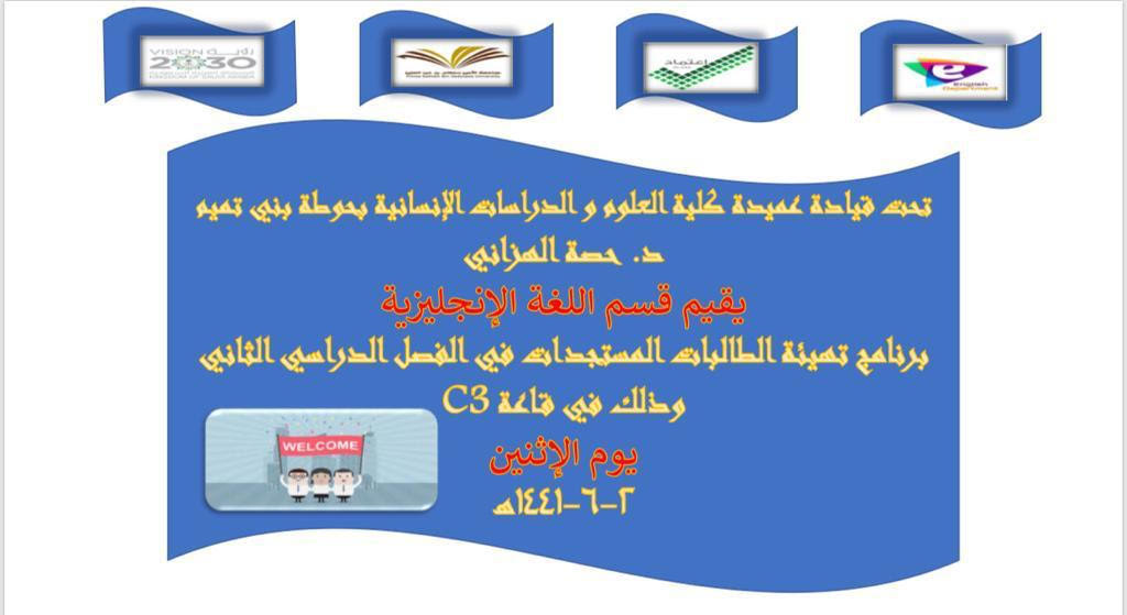 مع بداية فصل دراسي جديد، وبغرض الترحيب بالطالبات المستجدات وتعرفيهن بالأقسام وبأنظمة الجامعة، قدمت كلية العلوم والدراسات الإنسانية بحوطة بني تميم برامج منوعة لاستقبال الطالبات وتهيئتهن تحت رعاية عميدة الكلية د. حصة بنت سعود الهزاني، وبحضور رئيسات الأقسام وأعضاء هيئة التدريس والطالبات المستجدات، افتتحت هذه البرامج بتقديم قسم اللغة الإنجليزية برنامج بعنوان ( تهيئة الطالبات المستجدات في قسم اللغة الإنجليزية للفصل الدراسي الثاني) وذلك في يوم الإثنين الموافق ٢-٦-١٤٤١ هـ. في مبنى اللغة الإنجليزية قاعة C3. حيث بدأت البرنامج الأستاذة/ شروق الحميضي ( منسقة النشاط الطلابي في القسم) بذكر رؤية و رسالة جامعة الأمير سطام وكذلك رؤية و رسالة قسم اللغة الإنجليزية، و الأهداف التي يسعى لتحقيقها مع طالباته و مخرجاته. كما أشارت إلى أهمية قسم اللغة الإنجليزية و ما هي مجالات العمل الممكنة للطالبات بعد التخرج. ووجهت الطالبات إلى كيفية الوصول للخطة الدراسية على موقع الجامعة. بعد ذلك أوضحت أهمية النشاط الطلابي في القسم و أنه يدعم مواهب و قدرات الطالبات في مختلف المجالات و حفزت الطالبات بالمشاركة. بعد ذلك وضحت منسقة الإرشاد الأكاديمي د/ زينب واجي أنه يجب على كل طالبة معرفه أسم المرشدة الأكاديمية التابعة لها بحيث تكون هي الموجهة و الداعمة و المساعدة لها خلال مسيرتها التعليمية فالجامعة. كما أعطت الطالبات نسخه ورقيه عن رؤية ورسالة الجامعة و الخطة الدراسية المعتمدة فالقسم. بعد ذلك شاركت أ/ آيات الموسى منسقة الجودة فالقسم عن أهمية تقييم الطالب للمقررات في نهاية الفصل الدراسي لما له من أثر فعال في تحسين جودة المقررات الدراسية و تحسين جودة تدريس الأعضاء. ومن ثم ألقت رئيسة القسم د/ أبتسام نفخة بكلمة ترحيبية و تحفيزية للطالبات المستجدات و وجهت لهن بعض النصائح التي ستكون عون في مسيرتهن التعليمية، كما أوضحت لهن طبيعة المباني في الجامعة و مسمياتها و مسميات القاعات و كيف يمكن لهن حضور محاضرات الشبكات. بعد ذلك شاركت أ/ عناق صباح بكلمة أوضحت فيها فائدة الإنظام في نادي اللغة الإنجليزية و انه مجال تستطيع الطالبة من خلاله تطوير لغتها الإنجليزية و تحفيزها خارج نطاق المقررات الدراسية واختتم البرنامج بمناقشة بعض الامور الأكاديمية الهامة على الطلبات و تم الإجابة على معظم التساؤلات حتى يتهيؤوا لهذه المرحلة الدراسية إن شاء الله.توالت اللقاءات التعريفية تباعاً في بقية أقسام الكلية في يوم الخميس الموافق :١٤٤١/٥/٦هـ ، حيث بدأ قسم الدراسات الإسلامية بتقديم برنامج (تهيئة الطالبات المستجدات في الفصل الدراسي الثاني ) في مبني دراسات قاعة B_8 في تمام الساعة 9صباحاً. قدمته أ/ فايزة سالم منسقة الجودة بالقسم بالترحيب بالطالبات المستجدات مع ذكر رسالة وأهداف القسم. وتم توضيح بعض الأساسيات الأكاديمية التي تحتاجها الطالبة في بداية مسيرتها الجامعية، وشاركت الدكتورة فاطمة المشاري رئيسة القسم الطالبات ببعض التعليمات المهمة في الحضور والغياب والتحويل والاعتذار عن المقرر .كما حفزت الطالبات على الاجتهاد والتفوق وتمثيل القسم بأجمل صورة ، وحضر اللقاء عدد من عضوات هيئة التدريس وشاركن في الاجابة على استفسارات الطالبات. كما اشتمل البرنامج على ركن احتوى مطويات وتوزيعات تعريفية بالقسم ونظام الدراسة ، ووزعت د. ندى التميمي مطويات محفزه عن النجاح والتقدم كان لها أثر ايجابي لدى الطالبات. واختتم البرنامج بتقديم قسم اللغة العربية تهيئة لطالباته المستجدات، بتمام الساعة 10 صباحاً. وتم فيه تعريف الطالبات ببرنامج اللغة العربية وخطته وأهدافه وأهميته وتوصيف البرنامج وأهم المهن والوظائف التي يتم تأهيل الطالبة لها، كما اشتمل على ذكر أهمية الحضور للمحاضرات وأثر الغياب على مستوى الطالبة وتقدمها العلمي، وكذلك تعريفهن بكيفية الاعتذار أو التأجيل الدراسي. وشاركت رئيسة القسم د. أماني عبد الرازق في الترحيب بالطالبات وقدمت توجيهات و