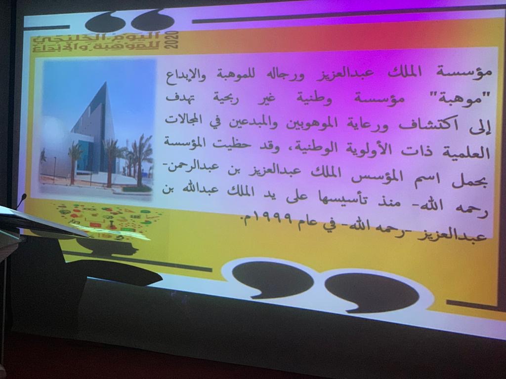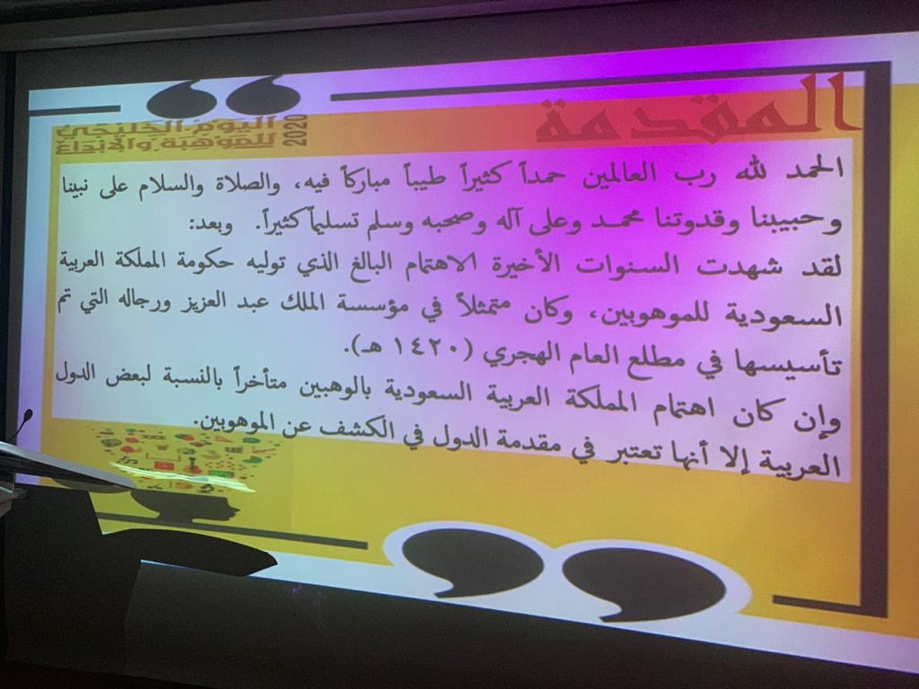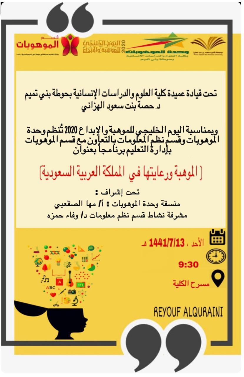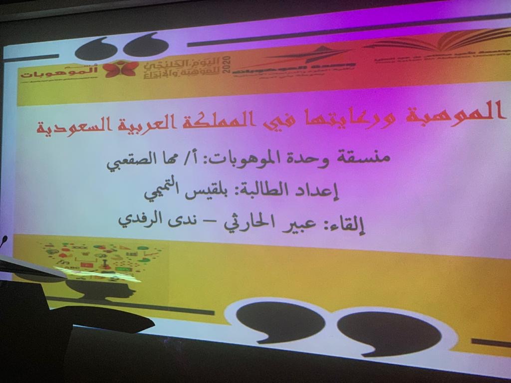 تزامناً مع الأسبوع الوطني للموهبة والإبداع واليوم الخليجي للموهبة 20 20، وإيمانا من كلية العلوم والدراسات الإنسانية بحوطة بني تميم بقيادة عميدة الكلية د. حصة بنت سعود الهزاني بضرورة تعزيز دورها في تفعيل خطة التحول 2030 عن طريق تفعيل الشراكة المجتمعية أقامت وحدة الموهوبات و قسم نظم المعلومات بالتعاون مع إدارة التعليم ممثلة بقسم الموهوبات برنامج بعنوان "الموهبة ورعايتها في المملكة العربية السعودية". تحت إشراف منسقة الوحدة ا/ مها الصقعبي وا/ وفاء حمزه منسقة النشاط الطلابي لقسم نظم المعلومات. وذلك في يوم الأحد الموافق : 1441/7/13هـ. بتمام الساعة 9:30 صباحًا، بمسرح الكلية. ويهدف هذا البرنامج إلى تعزيز كفاءة وفعالية نظام التعرف على الموهوبين والمبدعين، وإلى تحسين وتعزيز فرص التبادل والتعاون للأعمال والبرامج بين المؤسسات التربوية، كذلك التعرف على كفاءه وفعالية دور المؤسسات والمراكز السعودية الداعمة للموهوبين. تم إعداد البرنامج من قِبل الطالبة بلقيس الرقيب وإلقاء الطالبتين/ عبير الحارثي وندى الرفدي. تناول هذا البرنامج تعريف الموهبة ورعايتها في المملكة العربية السعودية، والتطرق إلى المؤسسات والمراكز التي ترعى الموهوبين: مثل مركز مجمع الأمير سلطان التعليمي بمدينة الرياض، ومؤسسة الملك عبدالعزيز ورجاله للموهبة والإبداع "موهبة" والتعرف على العناصر البيئة الإيجابية لتطوير الموهبة مثل: 1/الاسرة. 2/المدرسة وتعتمد على (الاشراف-المعلم- المواد التعليمية والبرامج المساعدة- المكان وتجهيزاته- الإرشاد). أيضًا اشتمل العرض على التجارب الناجحة مع الطالبات الموهوبات اللاتي حصلن على جوائز و مراكز على مستوى المملكة بالإضافة للمشكلات والصعوبات في بداية مشوارهن في البحث العلمي .وهن كالآتي الطالبة شيخة آل عيد و نورة الخريف والهنوف آل هلال. كما شارك قسم نظم المعلومات في تنظم ركن توزيعات . وقدمت مجموعة من طالبات وحدة الموهوبات في الفن التشكيلي مجموعة من الاعمال الفنية. اختتم هذا البرنامج وسط حضور وتفاعل من الجميع وعلى رأسهم د/ هبة الله أحمد الويشي الأستاذ المساعد ورئيسة قسم نظم المعلومات و د. نادية الامين رئيسة شؤون الطالبات والتسجيل و (11) استاذة من الطاقم الإداري و(40) من طالبات الكلية. في الختام نسأل الله العلي القدير أن يكلل الجهود بالنجاح الذي يحقق الرؤية وطموحها.