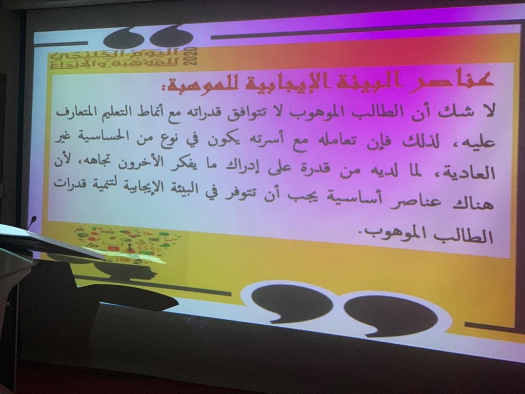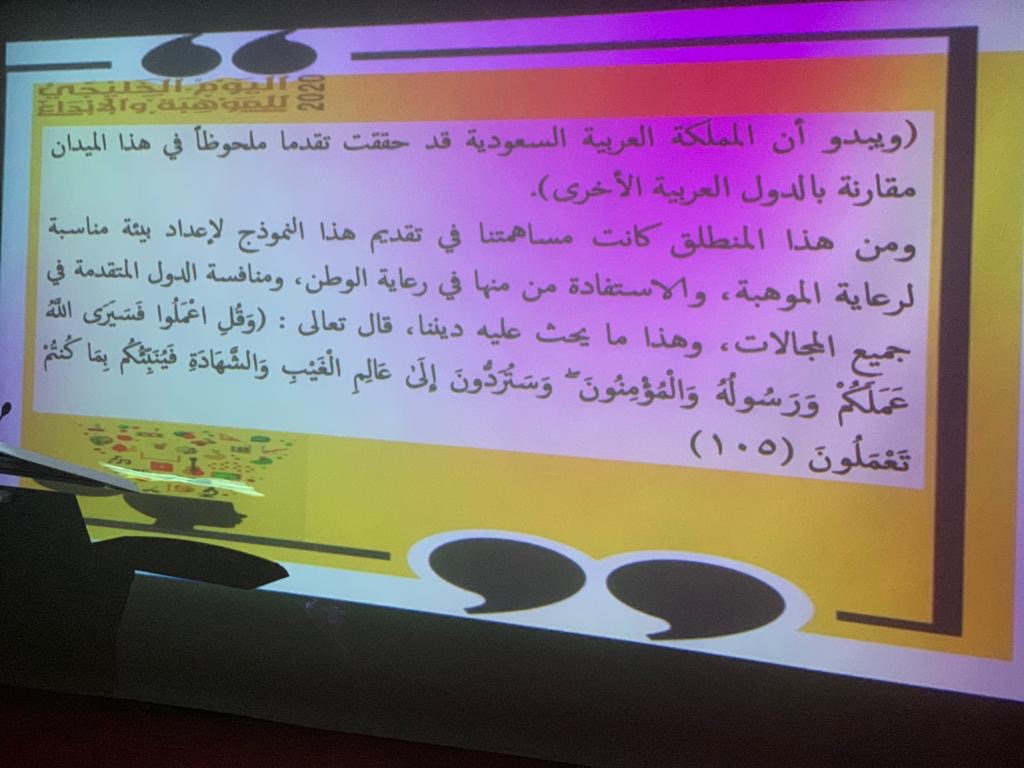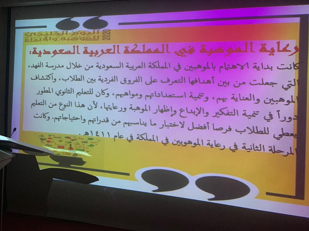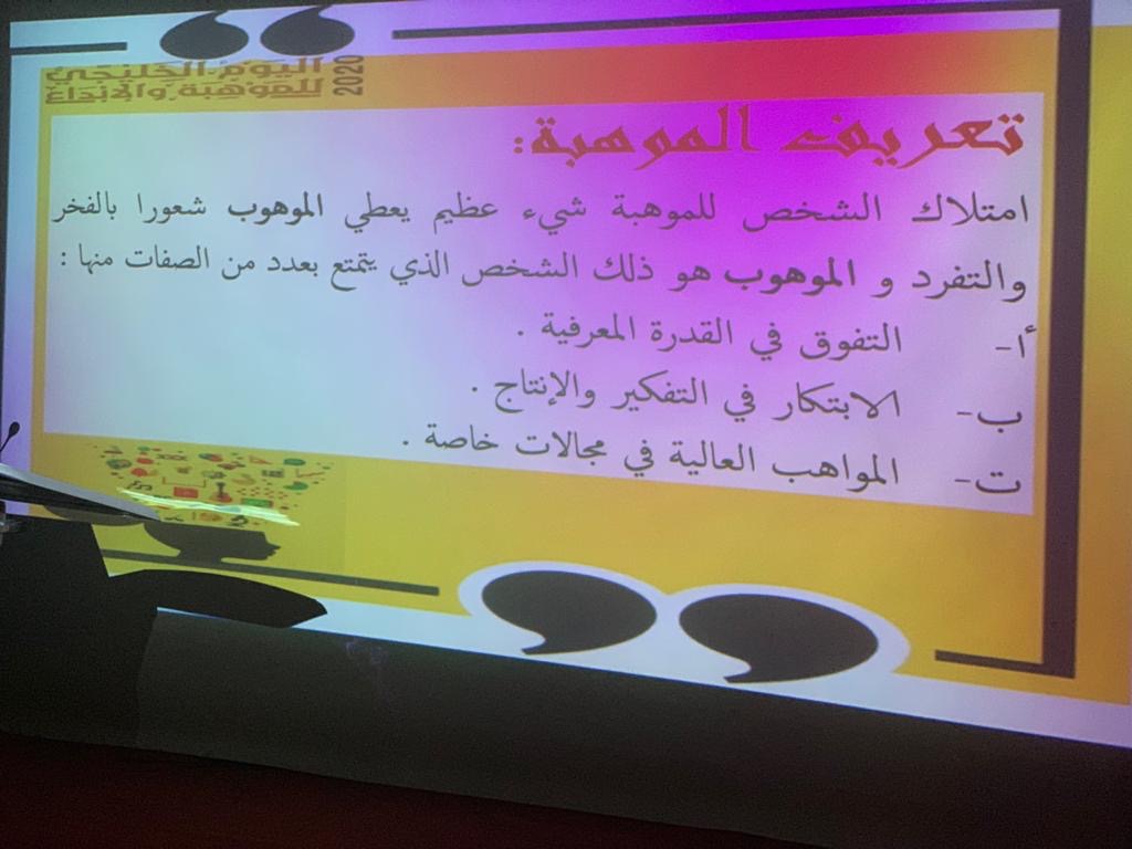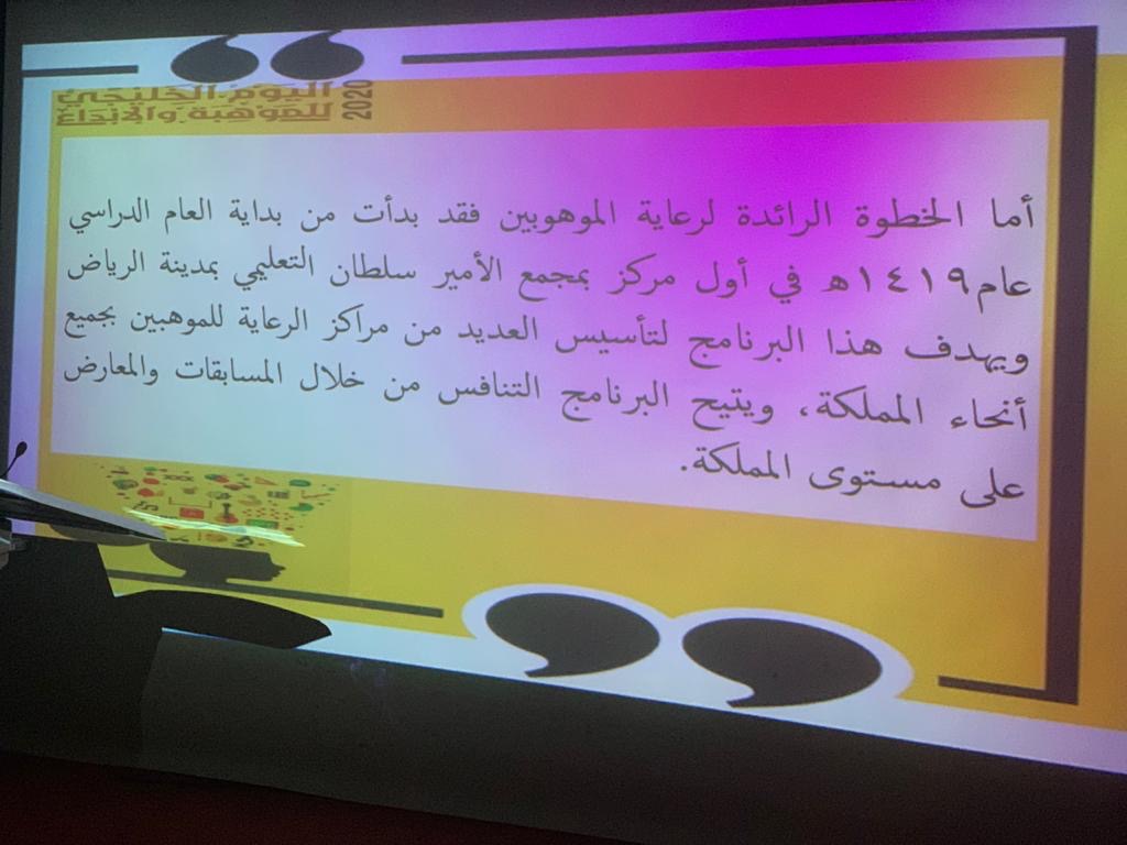 تزامناً مع الأسبوع الوطني للموهبة والإبداع واليوم الخليجي للموهبة 20 20، وإيمانا من كلية العلوم والدراسات الإنسانية بحوطة بني تميم بقيادة عميدة الكلية د. حصة بنت سعود الهزاني بضرورة تعزيز دورها في تفعيل خطة التحول 2030 عن طريق تفعيل الشراكة المجتمعية أقامت وحدة الموهوبات و قسم نظم المعلومات بالتعاون مع إدارة التعليم ممثلة بقسم الموهوبات برنامج بعنوان "الموهبة ورعايتها في المملكة العربية السعودية". تحت إشراف منسقة الوحدة ا/ مها الصقعبي وا/ وفاء حمزه منسقة النشاط الطلابي لقسم نظم المعلومات. وذلك في يوم الأحد الموافق : 1441/7/13هـ. بتمام الساعة 9:30 صباحًا، بمسرح الكلية. ويهدف هذا البرنامج إلى تعزيز كفاءة وفعالية نظام التعرف على الموهوبين والمبدعين، وإلى تحسين وتعزيز فرص التبادل والتعاون للأعمال والبرامج بين المؤسسات التربوية، كذلك التعرف على كفاءه وفعالية دور المؤسسات والمراكز السعودية الداعمة للموهوبين. تم إعداد البرنامج من قِبل الطالبة بلقيس الرقيب وإلقاء الطالبتين/ عبير الحارثي وندى الرفدي. تناول هذا البرنامج تعريف الموهبة ورعايتها في المملكة العربية السعودية، والتطرق إلى المؤسسات والمراكز التي ترعى الموهوبين: مثل مركز مجمع الأمير سلطان التعليمي بمدينة الرياض، ومؤسسة الملك عبدالعزيز ورجاله للموهبة والإبداع "موهبة" والتعرف على العناصر البيئة الإيجابية لتطوير الموهبة مثل: 1/الاسرة. 2/المدرسة وتعتمد على (الاشراف-المعلم- المواد التعليمية والبرامج المساعدة- المكان وتجهيزاته- الإرشاد). أيضًا اشتمل العرض على التجارب الناجحة مع الطالبات الموهوبات اللاتي حصلن على جوائز و مراكز على مستوى المملكة بالإضافة للمشكلات والصعوبات في بداية مشوارهن في البحث العلمي .وهن كالآتي الطالبة شيخة آل عيد و نورة الخريف والهنوف آل هلال. كما شارك قسم نظم المعلومات في تنظم ركن توزيعات . وقدمت مجموعة من طالبات وحدة الموهوبات في الفن التشكيلي مجموعة من الاعمال الفنية. اختتم هذا البرنامج وسط حضور وتفاعل من الجميع وعلى رأسهم د/ هبة الله أحمد الويشي الأستاذ المساعد ورئيسة قسم نظم المعلومات و د. نادية الامين رئيسة شؤون الطالبات والتسجيل و (11) استاذة من الطاقم الإداري و(40) من طالبات الكلية. في الختام نسأل الله العلي القدير أن يكلل الجهود بالنجاح الذي يحقق الرؤية وطموحها.
