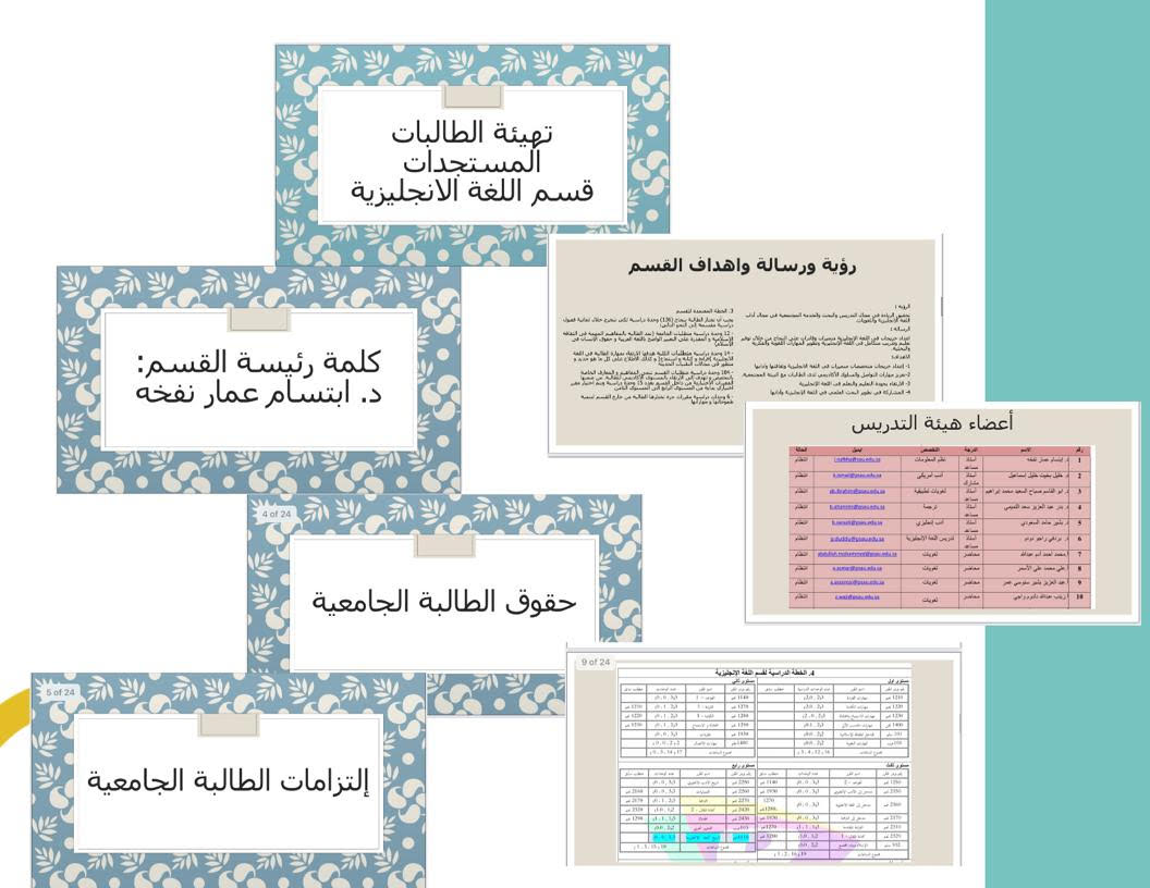 ثم عرضت لهن نبذة عن القسم بالإضافة إلى رؤية و رسالة وأهداف القسم. بعد ذلك تم عرض الخطة الدراسية لقسم اللغة الإنجليزية من المستوى الأول إلى الثامن بما يتضمن أسماء المقررات و رموزها و المتطلبات السابقة. تلى ذلك عرض قائمة بأسماء أعضاء هيئة التدريس مع عناوين التواصل معهم.