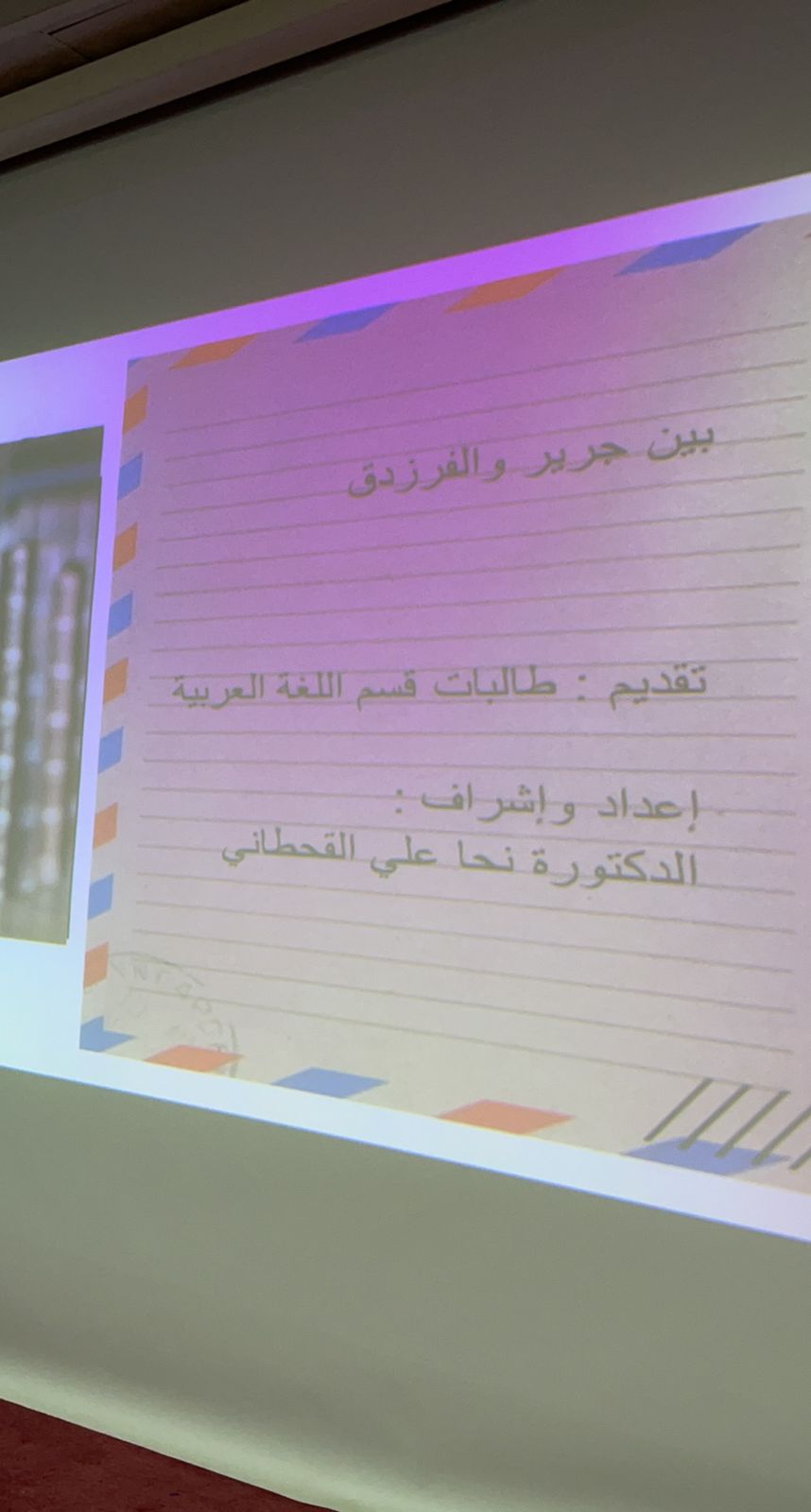 يظل الشاعران جرير والفرزدق رمزاً للمبارزة الشعرية رغم تتابع الزمن، وعلى مسرح كلية العلوم والدراسات الإنسانية بحوطة بني تميم تحت رعاية عميدة الكلية الدكتورة حصة بنت سعود الهزاني قدمت طالبات قسم اللغة العربية مشهدًا تمثيليًا من إعداد مشرفة النشاط الدكتورة نحا القحطاني بعنوان (بين جرير والفرزدق) في تمام الحادية عشرة من صبيحة الأربعاء ٢٦/ ٦/ ١٤٤٤هـ، كان حوارًا شعريًا بين الشاعرين الفحلين، وقد سبق ذلك عرضًا مرئيًّا لنشأة كل منهما ونسبه وحياته، وعلاقتهما ببعضهما، وأبرز اللقاءات الشعرية بينهما، وقد تخلل ذلك توزيع بعض تقديمات الطالبات التي عرضت لجميل شعرهما وشيء من صفاتهما حتى تجتمع الصورة والذوق في تقديم المعلومة للحاضرات وربط الحاضر بجماليات الشعر القديم في أبهى صوره واستعمالاته.