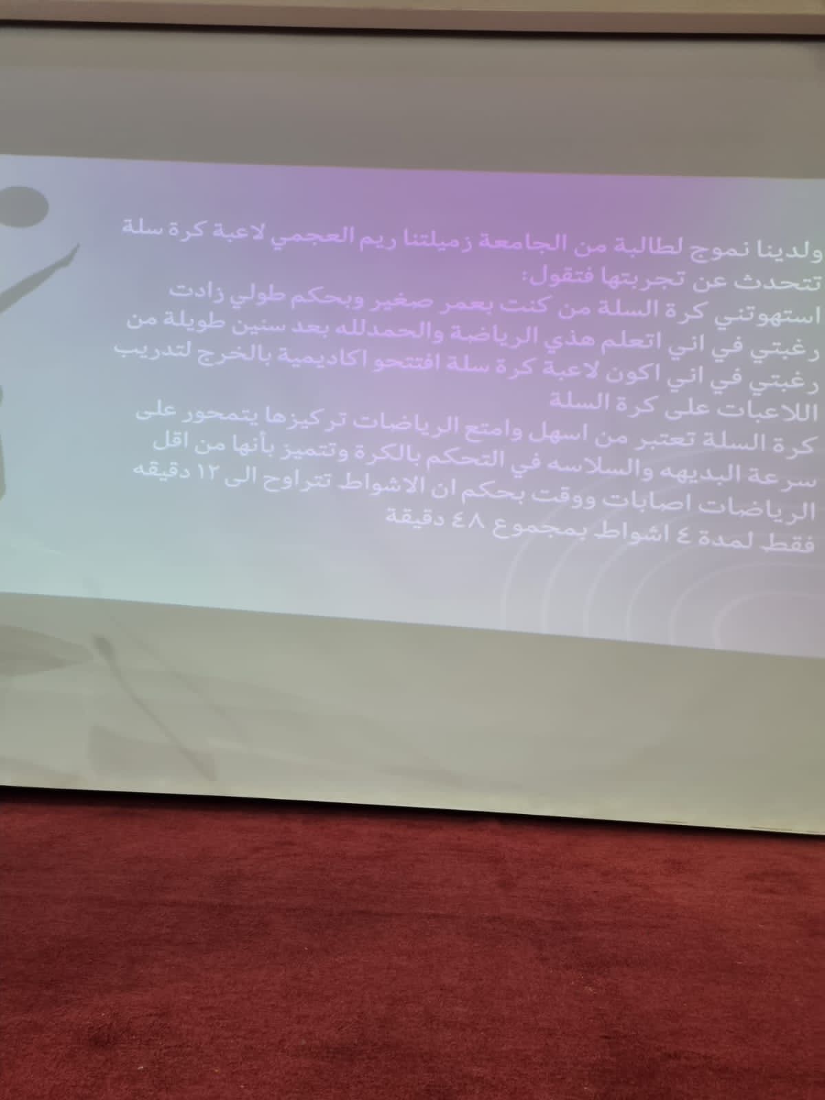 يهدف البرنامج لإبراز دور المرأة الإيجابي في دعم الرياضة في المجتمع، وأهم الرياضات النسائية، بالإضافة إلى عرضٍ لنماذج مشرفة من نساء المجتمع السعودي ساهمن في المجال الرياضي إما إشرافًا أو مشاركةً، وقد حققن العديد من النجاحات على نطاقات دولية، بالإضافة إلى ذلك فقد شارك الحديث طالبات الكلية المهتمات بالرياضة والممارسات لها، وممن حققن بعض النجاحات على مختلف المستويات، كما أجابن على استفسارات الحضور. وكل ذلك يصب في هدف البرنامج لإيقاد جذوة الحماس لدى الطالبات المهتمات بالنشاط الرياضي للتقدم والعطاء والنجاح، ودعم الرياضة في المجتمع في محيطها حيث كان؛ لكونها الجزء الآخر منه.