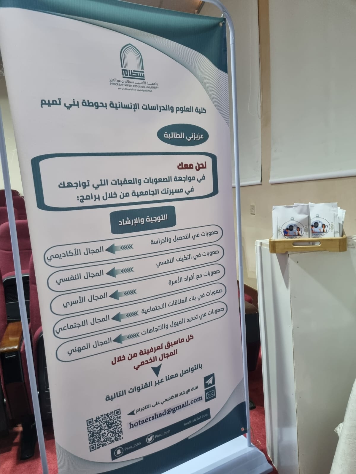 في يوم الاثنين الموافق 10 أكتوبر 2023 وتحت رعاية عميدة كلية العلوم والدراسات الإنسانية بحوطة بني تميم الدكتورة/ حصة بنت سعود الهزاني. أقامت وحدة التوجيه والإرشاد برنامجًا بعنوان: (التوجيه والإرشاد ودوره في التحصيل الجامعي). يهدف البرنامج إلى توعية الطالبات بوحدة الإرشاد و التوجيه و التعريف بمجالاته وكيفية الاستفادة من الخدمات المقدمة في البرنامج، و قد حظي البرنامج بإقبال كبير من الطالبات و أعضاء هيئة التدريس و تخلل البرنامج فقرات متنوعة، حيث ابتدأ بآيات من الذكر الحكيم ثم كلمة توجيهيه من عميدة الكلية تضمنت الكلمة الحديث عن أهمية هذه الوحدة و كيفية الاستفادة من الخدمات المقدمة خلالها، تلا ذلك مشهدًا تمثيليًا يصوّر أهمية الوحدة والدور الذي تقدمه الوحدة للطالبات، ثم عرض تقديمي للتعريف بمجالات الوحدة قدمته الدكتورة علياء العتيبي والدكتورة باتعة الجعفري والدكتورة نحا القحطاني. واختتم العرض بإعلان إنشاء فريق تطوعي تحت مسمى (أرشدني لتسعدني).  وختامًا تم السحب على ثلاث جوائز مقدمة للحضور عبارة عن قسائم شرائية من مكتبة جرير قيمة كل قسيمة مائة ريال.