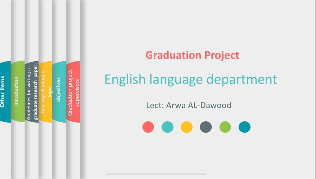 يعتبر مشروع التخرج من المتطلبات الضرورية لنيل الشهادة الجامعية، حيث أقامت لجنة مشاريع التخرج بالتعاون مع نادي اللغة الإنجليزية بكلية العلوم والدراسات الإنسانية بحوطة بني تميم دورة بعنوان: (Principles of Writing a Good Graduation Project). تحت رعاية عميدة الكلية د. حصة بنت سعود الهزاني، قدمتها المحاضر أروى آل داوود. وذلك في يوم الثلاثاء الموافق:1442/6/13هـ. في تمام الساعة 11صباحاً، على برنامج زووم. وتم في هذه الدورة التطرق للعديد من الجوانب المهمة في كتابة مشروع التخرج ومن ضمنها كيفية كتابة المقدمة بشكل سليم، ومعرفة الطريقة المناسبة للبحث وكيفية إخراج النتائج وكتابة المراجع. وفي نهاية اللقاء تم الإجابة على أسئلة الطالبات واستفساراتهم.