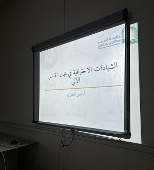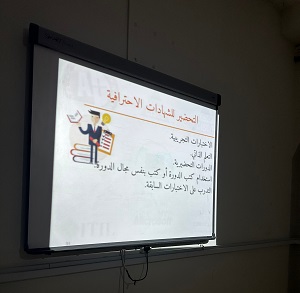 قدمت المدربة عبير العنزي تعريفًا بالشهادات الاحترافية وتعريف الطالبات بماهية وأهمية الشهادات الاحترافية في مجال الحاسب الآلي، وتدريب الطالبات على كيفية اختيار الشهادة المناسبة والحصول عليها عن طريق المنصات المختلفة.