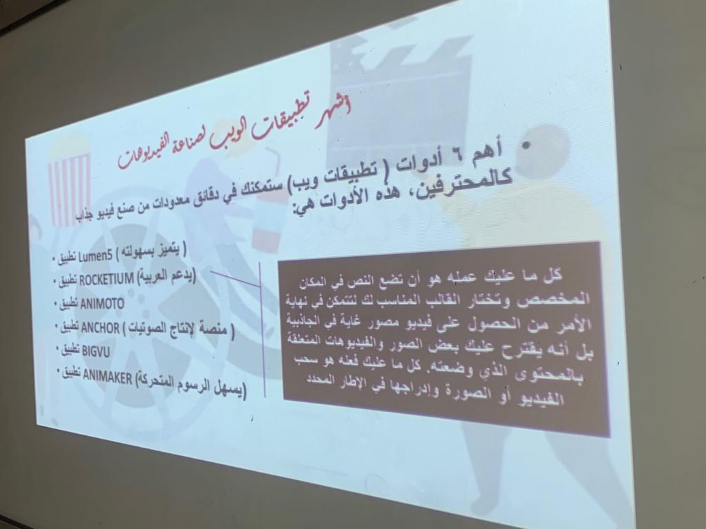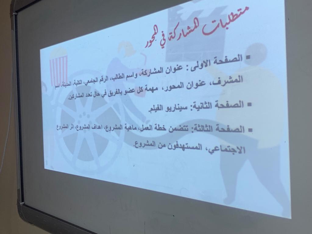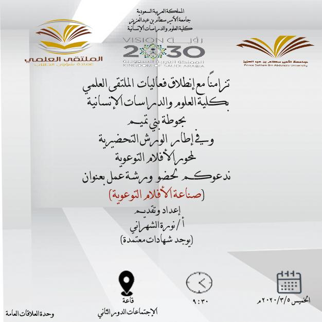 تُعد الأفلام التوعوية أحد أهم الأدوات التي تساهم في معالجة القضايا بأسلوب تربوي وتقني وقد تبنى الملتقى العلمي بجامعة الأمير سطام بن عبد العزيز صناعة الأفلام كأحد المحاور المهمة في الملتقى منذ دورته الأولى. وضمن الفعاليات التحضيرية للملتقى بكلية العلوم والدراسات الإنسانية بحوطة بني تميم وتحت قيادة سعادة العميدة الدكتورة حصة سعود الهزاني، أقيمت دورة تدريبية بعنوان (كيف أصنع فيلماً ؟) من إعداد وتقديم الأستاذة نورة الشهراني يوم الأربعاء الموافق: 10\7\1441هـ عند الساعة التاسعة والنصف صباحاً بقاعة التدريب. في بداية الدورة تم الترحيب بالحضور وشكرهن على المشاركة ثم ابتدأ التعريف بمحور الأفلام وضوابط الفيلم الجيد من امتلاك الإبداع والإمتاع والإقناع. ثم تم توضيح مراحل انتاج الفيديو ابتداء بفكرة بسيطة حتى وصل إلى فيديو مصمم باحترافية مع شرح كل مرحلة وتوضيح المعدات والبرامج المناسبة لذلك. في نهاية الدورة تم التدريب والتطبيق العملي على البرنامج وتصميم فيديو قصير مع الطالبات. كما تم تحفيز الطالبات بالكلية للمشاركة بالمحور للاستفادة من مواهب وإبداع الطالبات في تحقيق فائدة للمجتمع.