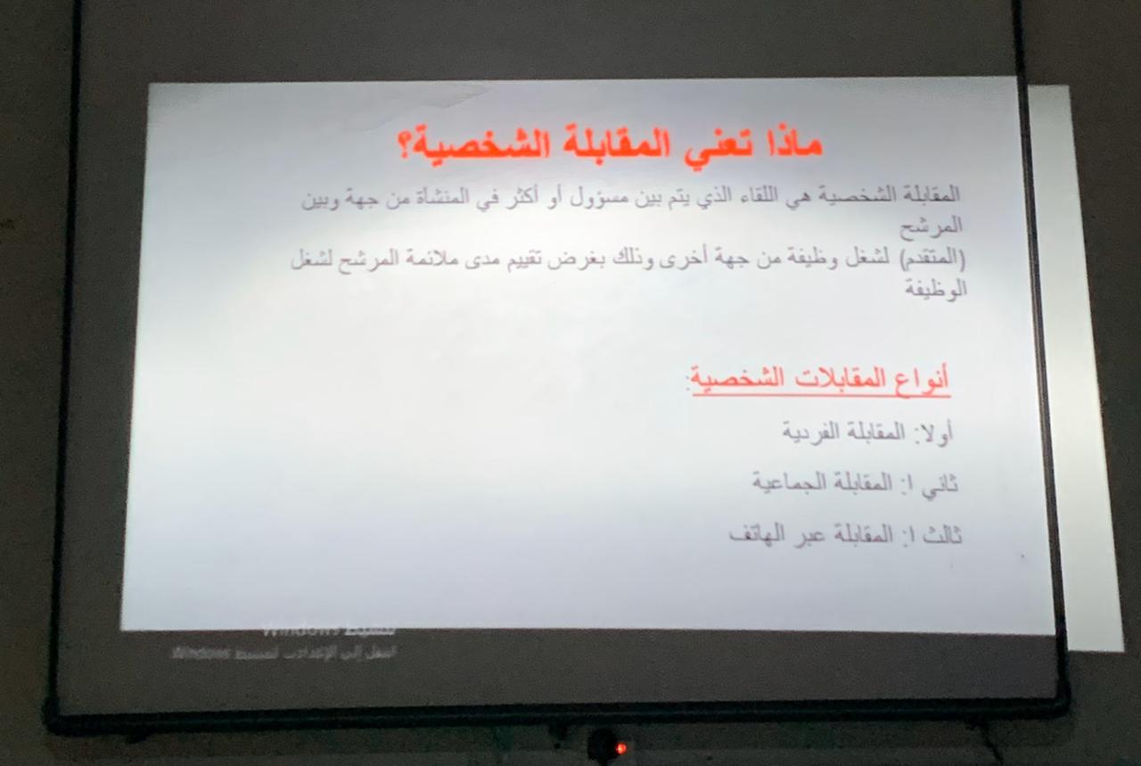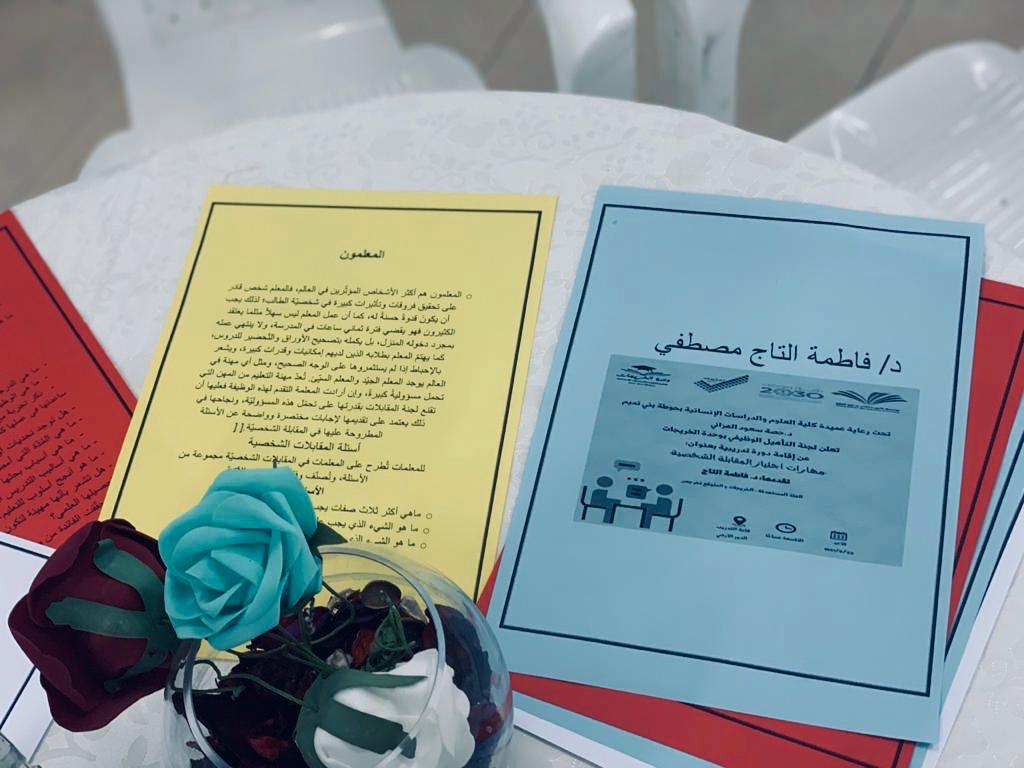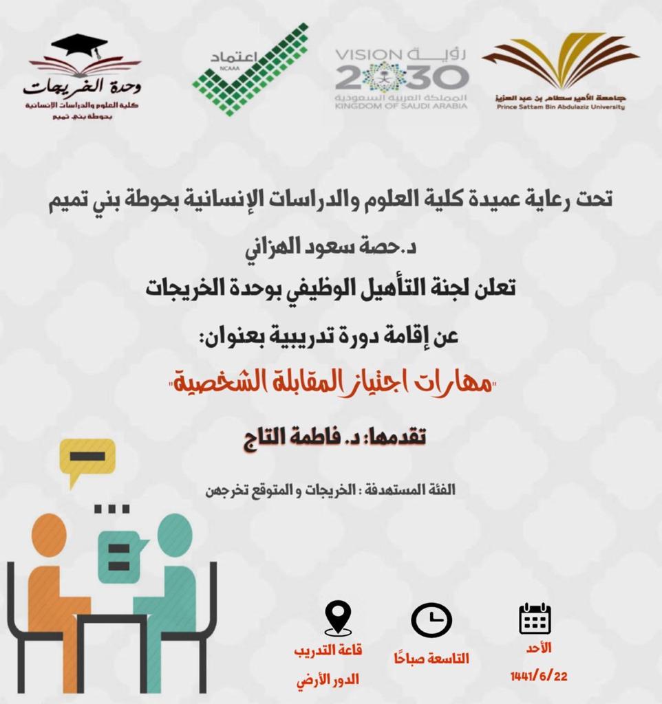 أقامت وحدة الخريجات متمثلة بلجنة التأهيل الوظيفي دورة تدريبية بعنوان: "مهارات اجتياز المقابلة الشخصية" تحت قيادة عميدة كلية العلوم والدراسات الإنسانية بحوطة بني تميم د. حصة سعود الهزاني. قدمتها د. فاطمة التاج عضو هيئة التدريس بقسم الدراسات الإسلامية. وذلك في يوم الأحد الموافق: 1441/6/22 هـ. في تمام الساعة التاسعة صباحاً بقاعة التدريب. حيث تناولت فيها مفهوم المقابلة الشخصية وأنواعها، وكيفية الاستعداد والتهيئة النفسية قبل إجراء المقابلة الشخصية وأثناء المقابلة، وأبرز الأسئلة الشائعة في المقابلات الشخصية. و أفادت د. فاطمة أن مثل هذه الدورات التي تقدمها وحدة الخريجات تسهم في تقديم مفاتيح العمل الأولى للطالبات الخريجات والمقبلات على التخرج، وتعرفهم بوسائل التقديم للوظائف ومعرفة احتياجات سوق العمل ومجالات التوظيف.