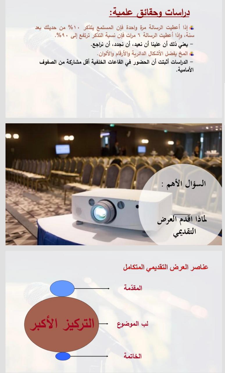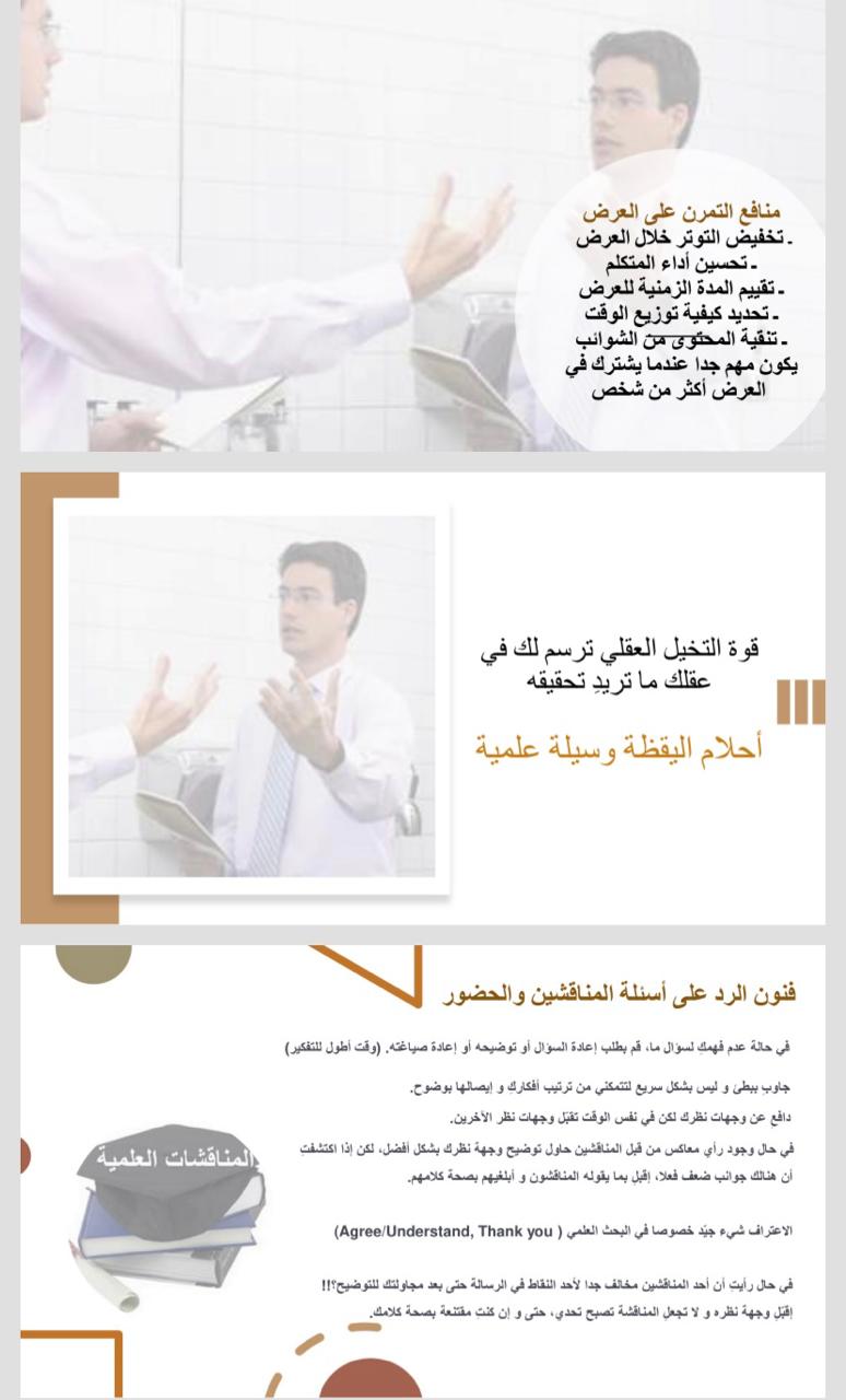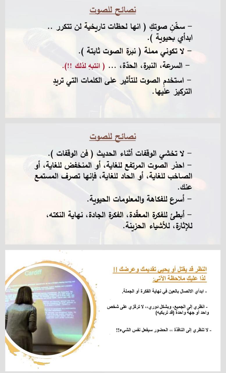 من منطلق حرص الجامعة على تهيئة الخريجات وتقديم كافة الامكانات لتطوير مستوياتهن، برعاية كريمة من سعادة عميدة كلية العلوم والدراسات الإنسانية بحوطة بني تميم الدكتورة حصة بنت سعود الهزاني، أقامت لجنة مشاريع التخرج بوحدة الخريجات بالكلية دورة تدريبية بعنوان "مهارات العروض التقديمية" تقديم الأستاذة حنان الأسمري المحاضر بقسم نظم المعلومات، وذلك صباح يوم الأحد الموافق ٢٩/ ٣/ ١٤٤٢ هـ عند الساعة السابعة عبرBlackboard Collaborate Ultra. أُقيمت هذه الدورة بحضور ومتابعة كريمة من رئيسة لجنة مشاريع التخرج بالكلية الدكتورة هبةالله الويشي، حيث بدأت الدورة بالتعريف بأهم عناصر العرض التقديمي المتكامل والمواصفات المهمة لنجاحه. كما تم تقديم العديد من الوسائل التي تساعد الطالبة التغلب على التوتر والقلق والاندماج بموضوع العرض. ركزت الدورة بشكل كبير على طريقة تنمية المهارات الشخصية من حيث درجة الصوت والتواصل البصري وطرق كسر الحاجز النفسي مع المتلقي واستفاضت في شرح كل موضوع على حدة. اُختُتمت الدورة بعرض طرق وأساليب الرد على أسئلة الحضور والمناقشين بشكل لائق وذكي، كما تم شكر الحضور و استقبال أسئلة الطالبات و الرد على استفساراتهن. يذكر أن هذه الدورة تأتي ضمن سلسلة دورات مكثفة تقدمها لجنة مشاريع التخرج بالكلية من أجل الوصول للأهداف التي تنص عليها رؤية ورسالة الجامعة الاستراتيجية ٢٠٣٠، من حيث إعداد خريجة متمكنة علمياً وتمكينها من المنافسة على جميع الأصعدة، وتطوير بيئة البحث العلمي والمشاريع في الجامعة على أفضل المستويات.