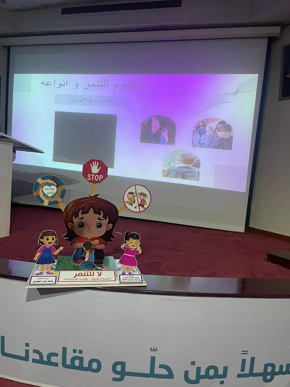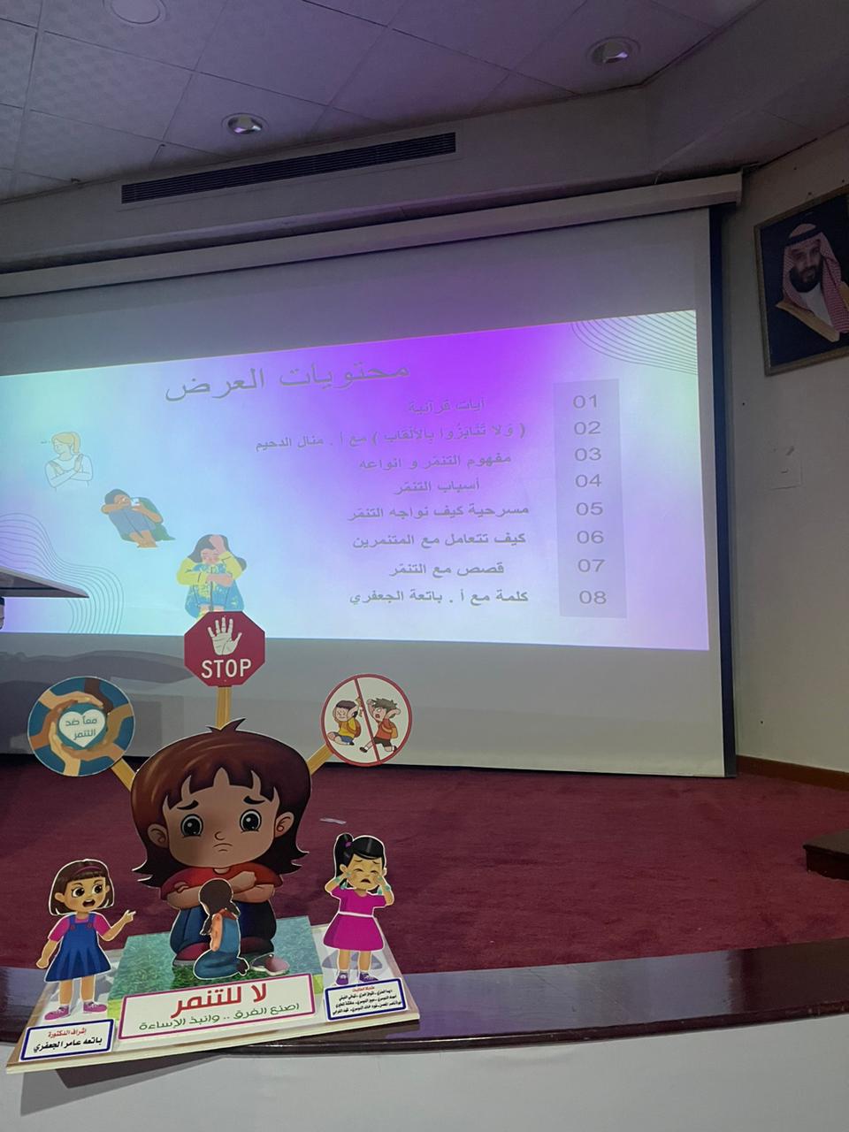 ثم عرض لمفاهيم التنمر وأنواعه للطالبة هيا الهذيلي وتبعها توضيح لأسباب التنمر والطالبة نجود الدوسري.