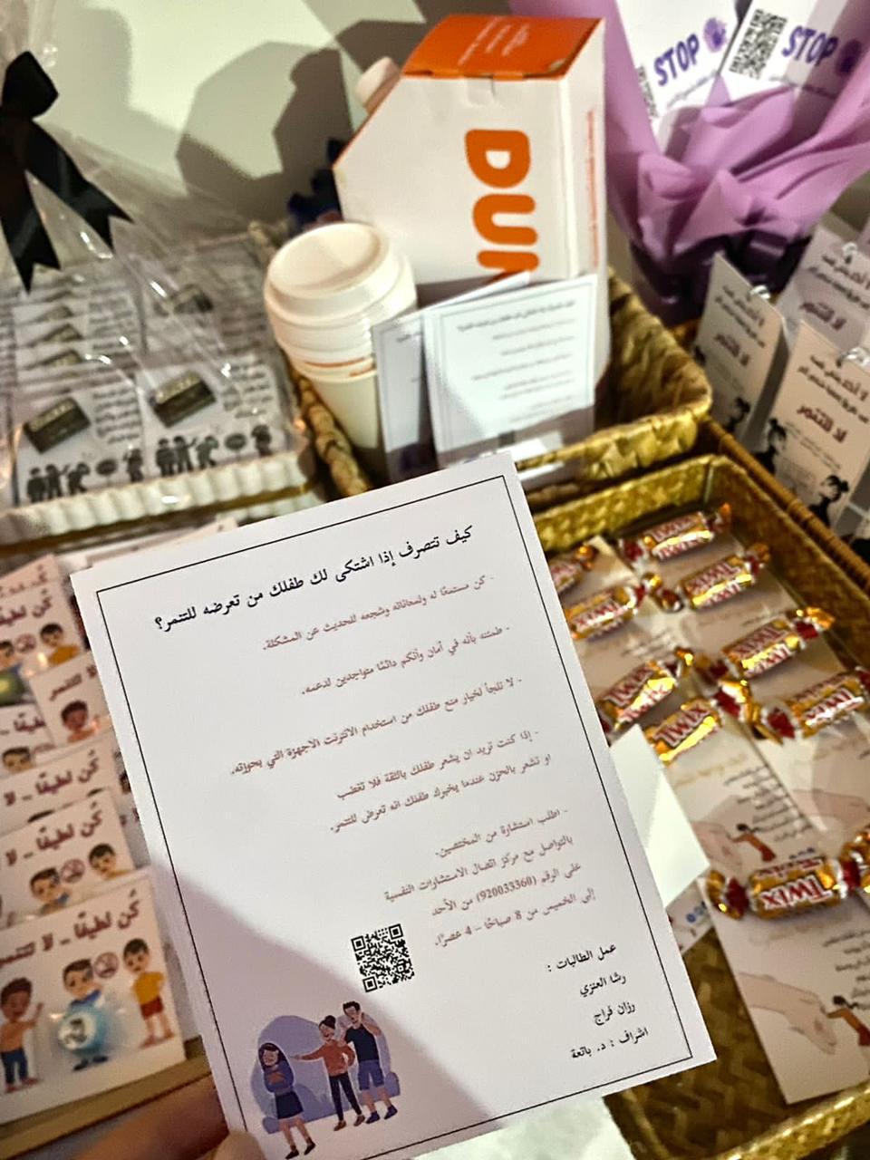 وعرضت الطالبات نورة القريان، ونورة صليح، ونورة الجريد مسرحية عن كيفية مواجهة التنمر. كما قامت الطالبات فلوة الفهادي ورهام العنزي بعمل اشكال تنكرية لتوضيح مدى تأثير ذلك على رد فعل الناس وانجرافهم بشدة للتنمر.