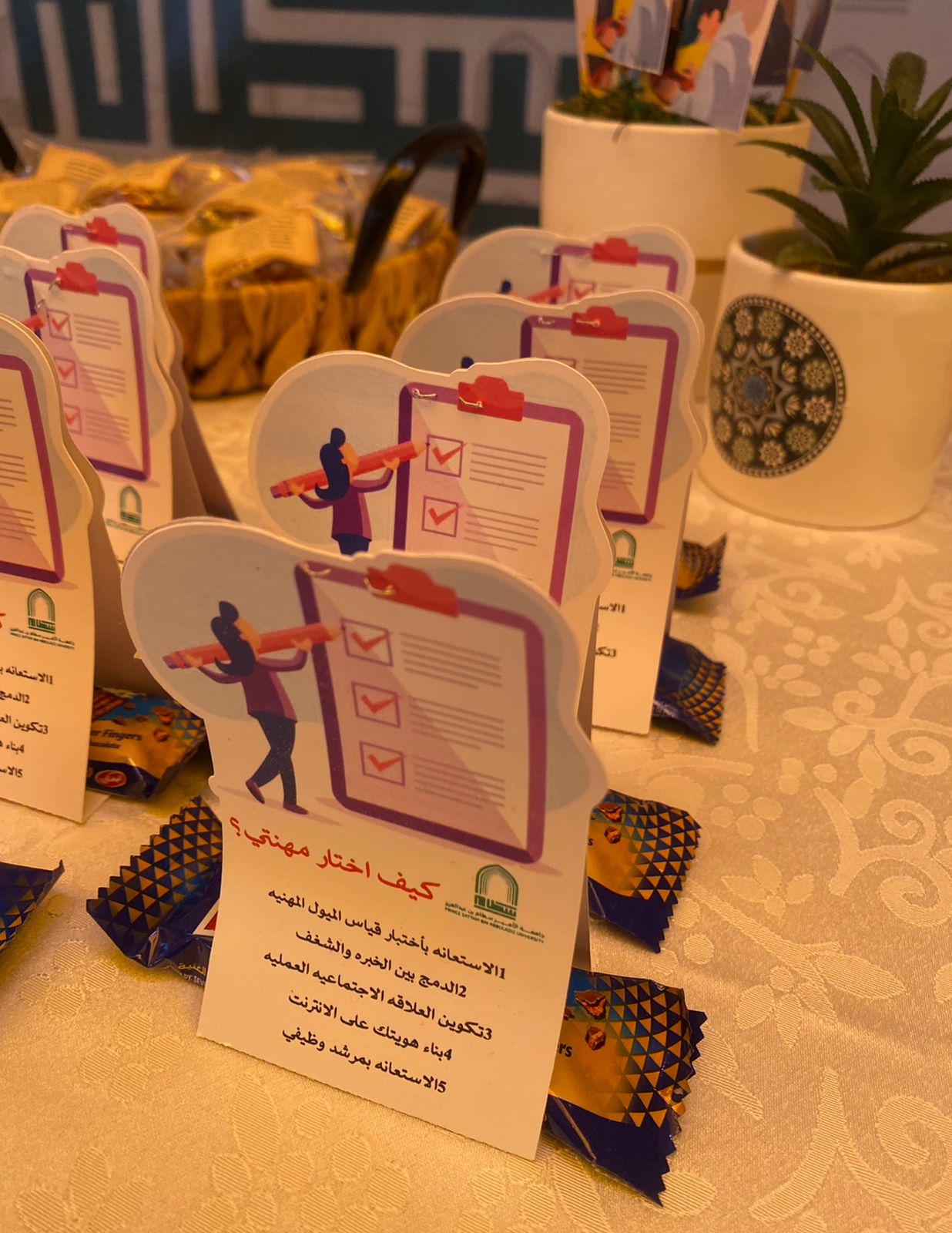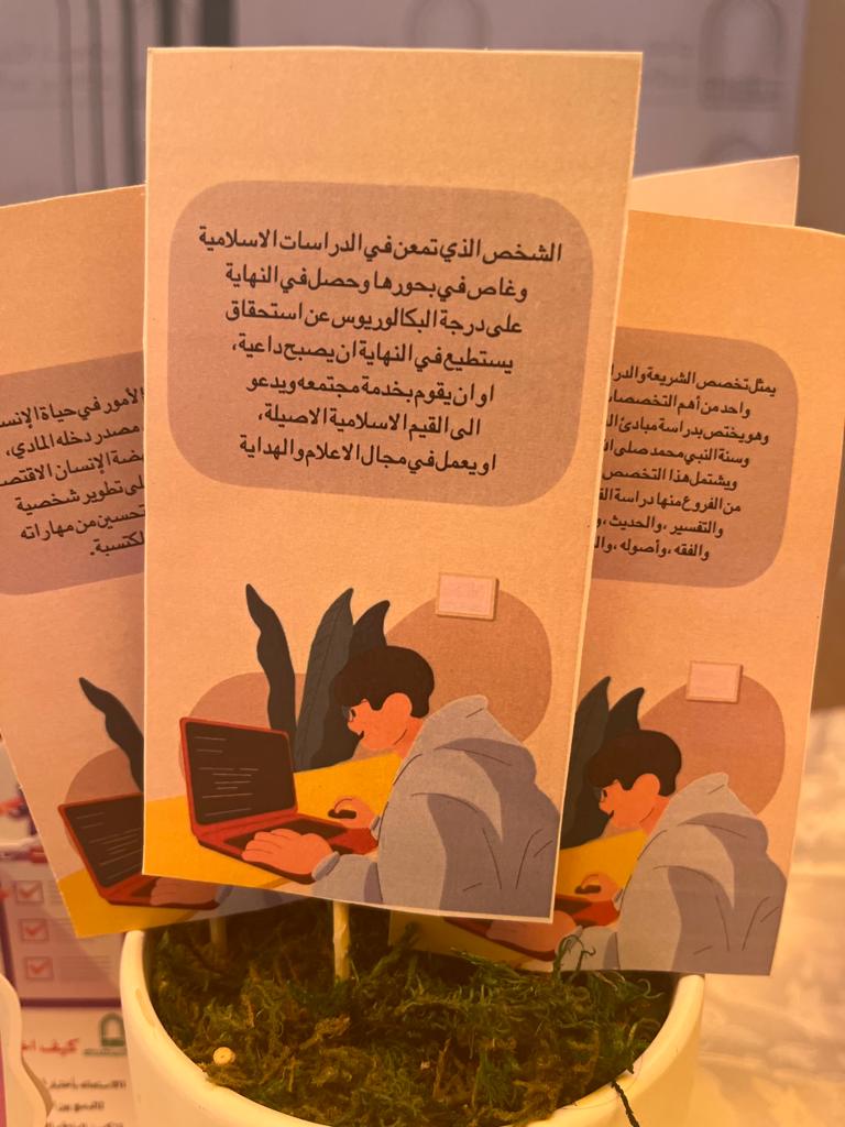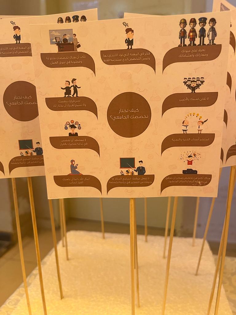 حيث تم إعداد المنشورات التعريفية، والمجسمات التوضيحية والتوزيعات المناسبة لكل قسم من أقسام الكلية، وتم توضيح التخصصات المتناسبة مع ميول الطالبات والوظائف المتاحة لكل قسم بعد التخرج. حيث أبدت الحاضرات سرورهن بطريقة إيصال الفكرة المرادة وتمت المناقشات حول الموضوع، والإجابة على الاستفسارات بمشاركة عدد من طالبات قسم اللغة العربية والأقسام الأخرى.