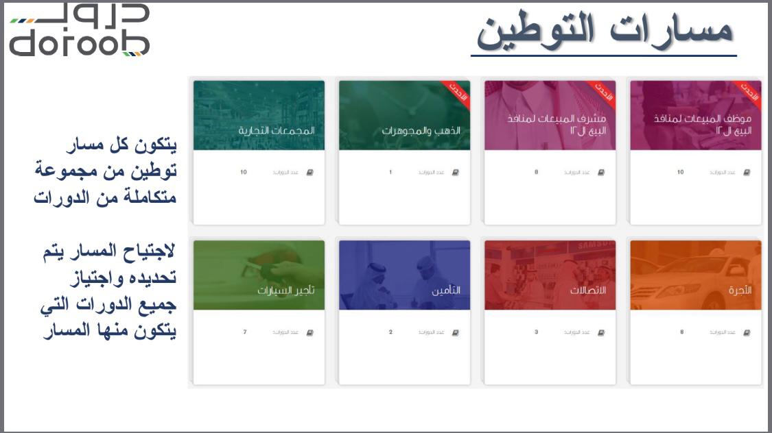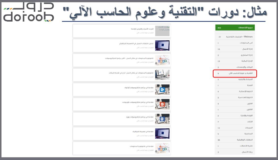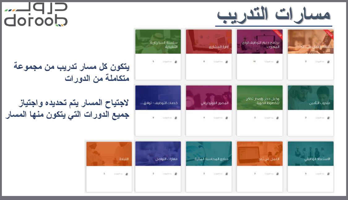 من منطلق سعي الجامعة لتوفير فرص معتمدة للتدريب المهني والتأهيل الوظيفي للطلاب والخريجين لتنمية قدراتهم ومهاراتهم الشخصية وتأهيلهم للمنافسة في سوق العمل، أقامت وحدة الخريجات بكلية العلوم والدراسات الإنسانية بحوطة بني تميم لقاء افتراضياً بعنوان: "التعريف بمنصة دروب" تحت رعاية عميدة الكلية سعادة الدكتورة: حصة بنت سعود الهزاني. و كان اللقاء في مجال التأهيل الوظيفي وذلك يوم الثلاثاء الموافق ١٠-٧-١٤٤٢ هـ قدمت الدورة ا. عبير العنزي ( محاضر بقسم نظم المعلومات بالكلية). وكان من أهم أهداف اللقاء تعريف الطالبة على برنامج دروب الذي يوفر أكثر من 170 دورة إلكترونية في مجالات متعددة ويتم الحصول على الدورة عن بُعد ويتم منح من اجتاز الدورة شهادة معتمدة من صندوق تنمية الموارد البشرية "هدف". تناول اللقاء: ✍ نوع الدورات التدريبية المقدمة من دروب. ✍ مسارات التدريب المتاحة على المنصة. ✍ مسارات التوطين المتاحة على المنصة. ✍ كيفية الحصول على شهادات اجتياز الدورات. و في نهاية اللقاء تم حث الطالبات على الاستفادة من هذه الدورات الإلكترونية على الرابط:  ‏www.doroob.sa