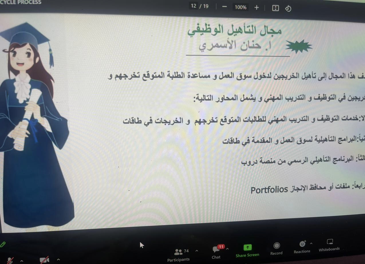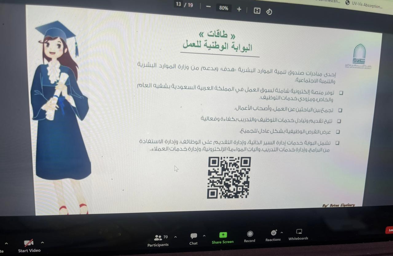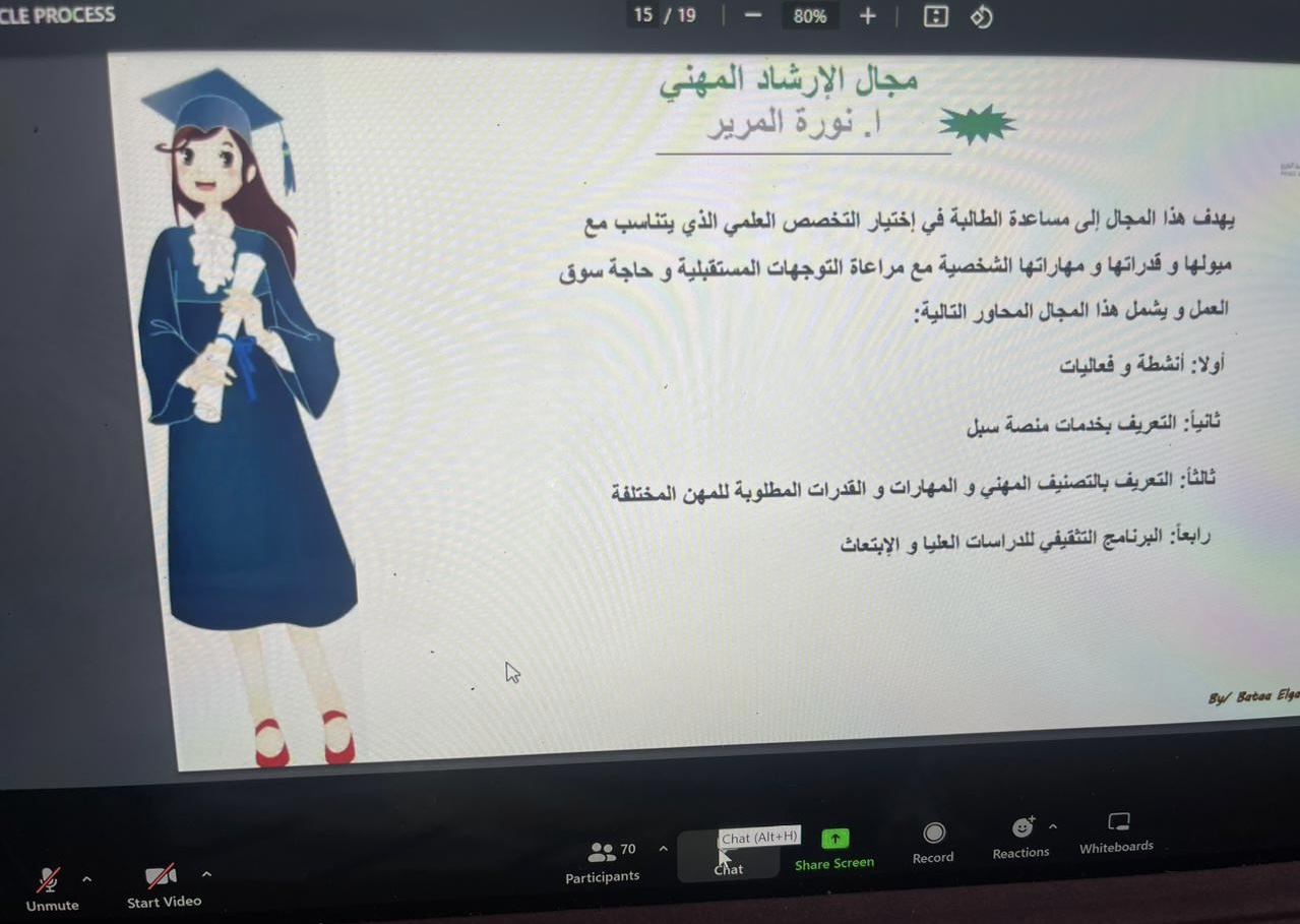 كما استعرضت ا. حنان الأسمري منسقة لجنة التأهيل الوظيفي أهم أهداف اللجنة والتعريف بمنصات التوظيف الوطنية مثل دروب وطاقات وكيف تستفيد الطالبة وترفع مهاراتها وخبراتها في مجال التوظيف، أيضًا تحدثت ا. نورة المرير منسقة لجنة الإرشاد المهني عن أهم مجالات الإرشاد المهني والتعريف بمنصة سبل والتعريف أيضا بالتصنيف المهني وبرنامج الابتعاث الداخلي والابتعاث الخارجي (سفير).