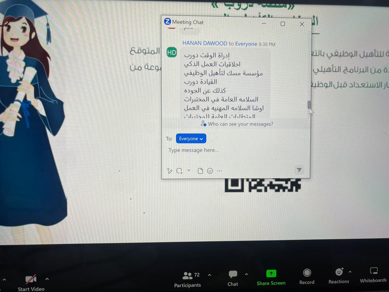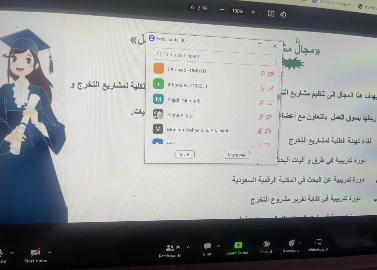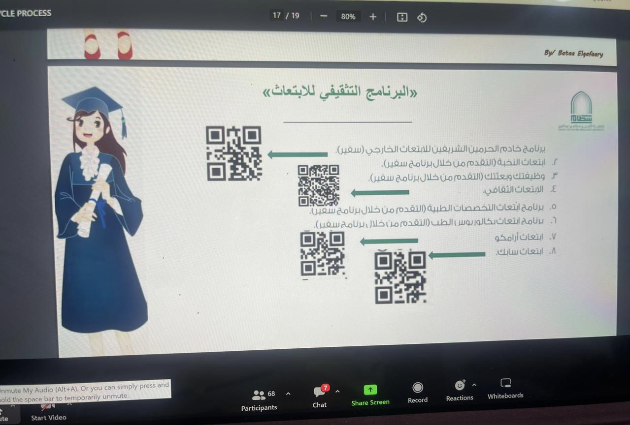 كما استعرضت ا. حنان الأسمري منسقة لجنة التأهيل الوظيفي أهم أهداف اللجنة والتعريف بمنصات التوظيف الوطنية مثل دروب وطاقات وكيف تستفيد الطالبة وترفع مهاراتها وخبراتها في مجال التوظيف، أيضًا تحدثت ا. نورة المرير منسقة لجنة الإرشاد المهني عن أهم مجالات الإرشاد المهني والتعريف بمنصة سبل والتعريف أيضا بالتصنيف المهني وبرنامج الابتعاث الداخلي والابتعاث الخارجي (سفير).