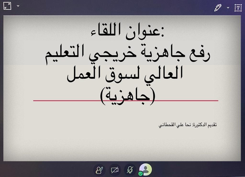 وقد بدأ اللقاء ببيان لماهية البرنامج جاهزية والتعريف به وتوضيح أهدافه للخريجات وإحاطتهن بالتخصصات الثلاثة عشرة التي يشملها البرنامج وبيان طبيعة الاختبار ومدته وكيفيته وتوضيح مكان الاختبار والمعامل المجهزة لإجرائه، ولفت نظر الخريجات لعمل اللجنة مع أستاذات التخصص وتدريبهن على نماذج محاكية مستقبلا وعقب ذلك الإجابة على تساؤولات الخريجات.