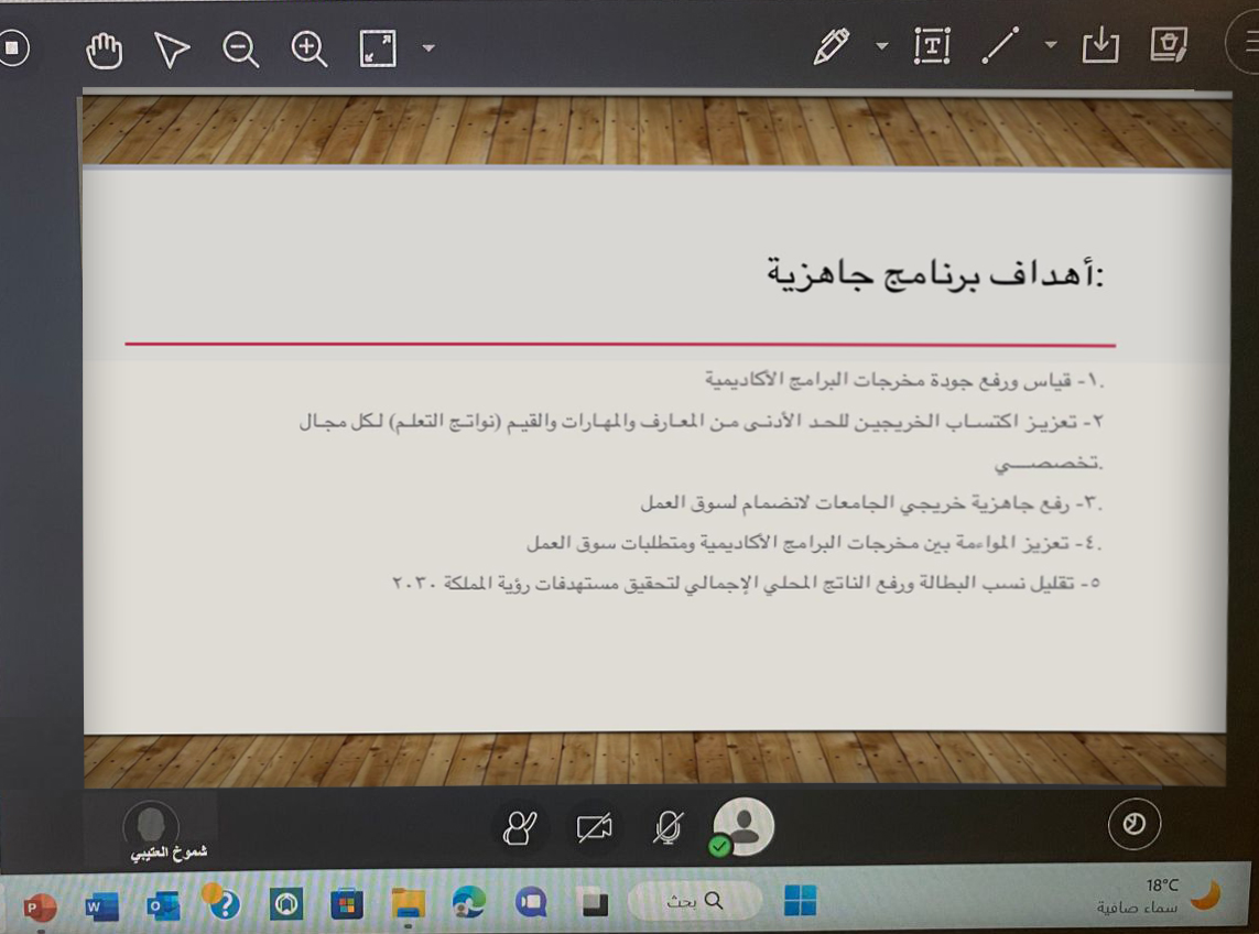 في إطار اهتمام جامعة الأمير سطام بن عبد العزيز بجاهزية خريجي الجامعة لسوق العمل أقامت لجنة تنمية المهارات المهنية لقاءً تعريفيًا عن برنامج جاهزية الذي سيبدأ في السابع عشر من الشهر الخامس الميلادي وذلك تحت رعاية عميدة كلية العلوم والدراسات الإنسانية سعادة الدكتورة حصة بنت سعود الهزاني في يوم الخميس ٢١/ ١٠/ ١٤٤٤هـ عبر البلاك بورد في تمام السابعة مساءً.