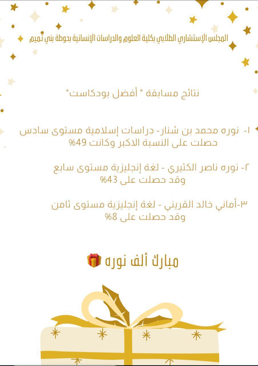 يعتبر برنامج البودكاست أحد وسائط الإعلام الرقمي الجديد فهو دمج بين كلمتي : Ipod+Brodcast = Podcast أي النشر أو البث، بمعنى استخدام سلسلة وسائط متعددة أو حلقات صوتية أو مرئية يمكن الاشتراك بها أو متابعتها، ولحاجة الطالبات إلى مثل هذه الأنشطة طرح المجلس الاستشاري الطلابي بكلية العلوم والدراسات الإنسانية بحوطة بني تميم مسابقة لأفضل بودكاست تحت رعاية عميدة الكلية د. حصه بنت سعود الهزاني وبإشراف منسقة المجلس أ. منيره إبراهيم التميمي وتم استقبال المشاركات يوم الثلاثاء ١٨/ ٧/ ١٤٤٢هـ إلى يوم الخميس ٢٠/ ٧ / ١٤٤٢هـ، عبر حساب المجلس الطلابي بتويتر.  وذلك بهدف زيادة القدرة على الإبداع وإحداث المتعة والتشويق والتحدي بين الطالبات وكذلك التعرف على فاعلية استخدام Podcast في تنمية دافعية المتعلمين نحو التعليم عبر الويب، والمجلس الطلابي يهنئ الطالبة الطالبة/ نوره محمد بن شنار من قسم الدراسات الإسلامية لفوزها بحصولها على أعلى الأصوات وكذلك نتقدم بالشكر الجزيل للمشاركات التي لم يحالفهن الحظ . https://vimeo.com/519933712