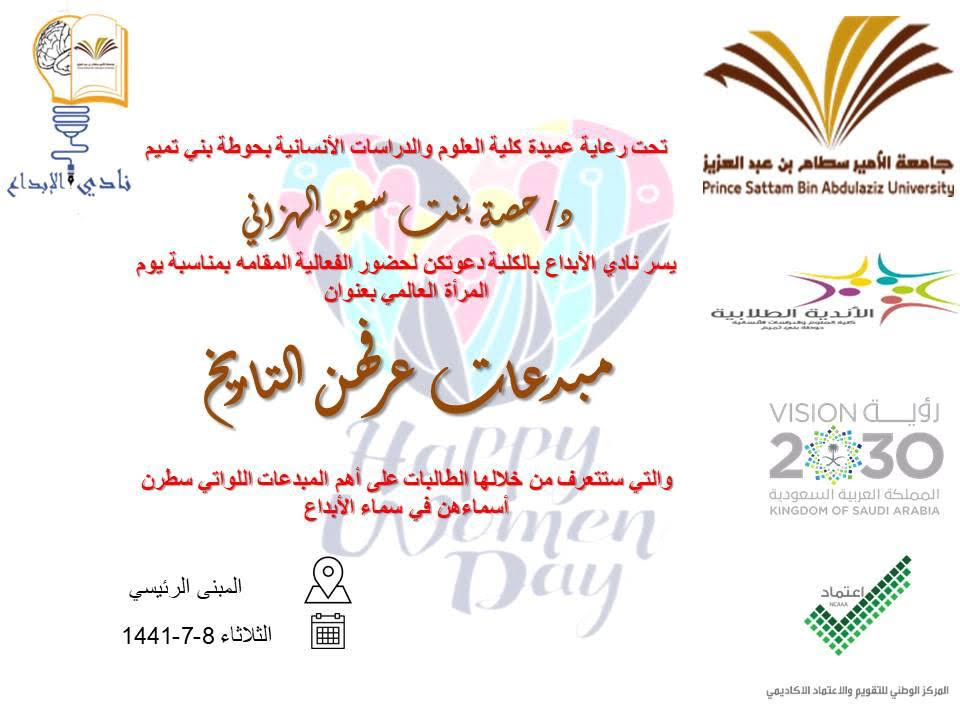 بمناسبة اليوم العالمي للمرأة، أقام نادي الإبداع بكلية العلوم والدراسات الانسانية بحوطة بني تميم. ركن تعريفي بعنوان (مبدعات عرفهن التاريخ ) تحت قيادة عميدة الكلية د/ حصة سعود الهزاني، وبرئاسة الأستاذة/ نهى الحربي، وذلك في يوم الثلاثاء الموافق: 1441/7/8هـ. حيث تعرفت من خلاله الطالبات على أهم المبدعات اللاتي سطرن أسماءهن في أفق الإبداع والتي تشمل الأدب والطب والكيمياء وشتى مجالات الحياة المختلفة . كما كان هناك نبذة مصغره عن أهم المبدعات السعوديات اللواتي عرفهن العالم من خلال إبداعهن في المجالات العلمية والأدبية المختلفة. كما تم توزيع بعض العبارات التحفيزية للطالبات والتي تحث على الثقة بالنفس والإبداع والعمل في المجالات التي يبدعن فيها.