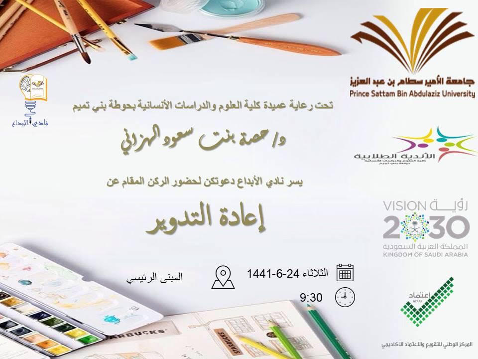 دعماً لرؤية الجامعة في الحفاظ على البيئة والاستفادة من مواردها. أقام نادي الإبداع بكلية العلوم والدراسات الإنسانية بحوطة بني تميم. ركن تعريفي للطالبات عن إعادة التدوير. تحت قيادة عميدة الكلية  د. حصة سعود الهزاني، في تمام الساعة التاسعة والنصف صباحا من يوم الثلاثاء  الموافق: 1441/6/24هـ. بإشراف ا/ نهى الحربي، حيث قامت بتشجيع الطالبات على البحث عن ما يمكن الاستفادة منه في بيئتهن والقيام بإعادة تدويره وعرضه على بقية الطالبات. وكان للطالبات مشاركات تميزت بالإبداع والحس الفني العالي. كما تم توزيع بعض المنشورات لتعريف طالبات الكلية بأهمية إعادة التدوير، وحثهن على الحفاظ على البيئة بالقيام بأعمال ابداعيه من خلال إعادة تدوير ما يتم استهلاكه من موارد موجودة حولنا.