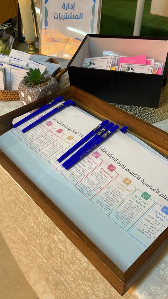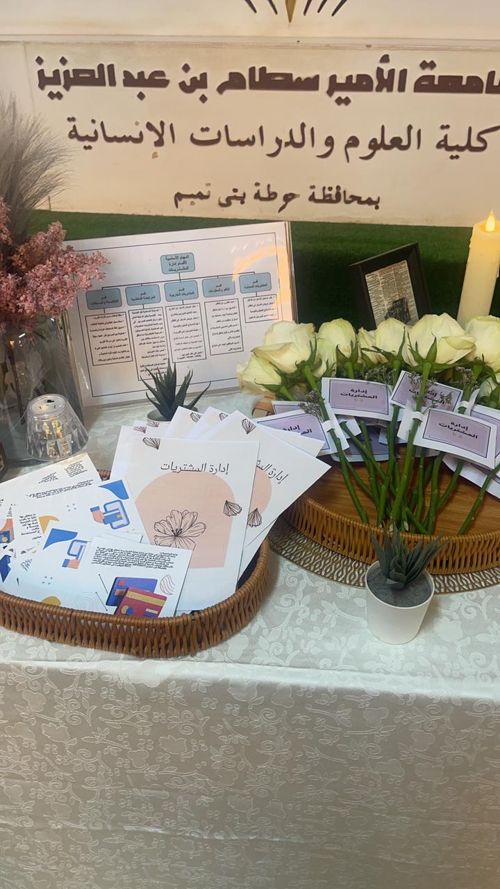 أقام قسم إدارة الأعمال بكلية العلوم والدراسات الإنسانية بحوطة بني تميم تحت رعاية عميدة الكلية د. حصة بنت سعود الهزاني وبإشراف وكيلة كلية إدارة الأعمال الدكتورة مليحة القحطاني ركنًا بعنوان (إدارة المشتريات). وذلك يوم الاثنين الموافق ١١ / ١٠ / ١٤٤٤هـ الساعة 9:30 صباحًا في بهو الكلية.