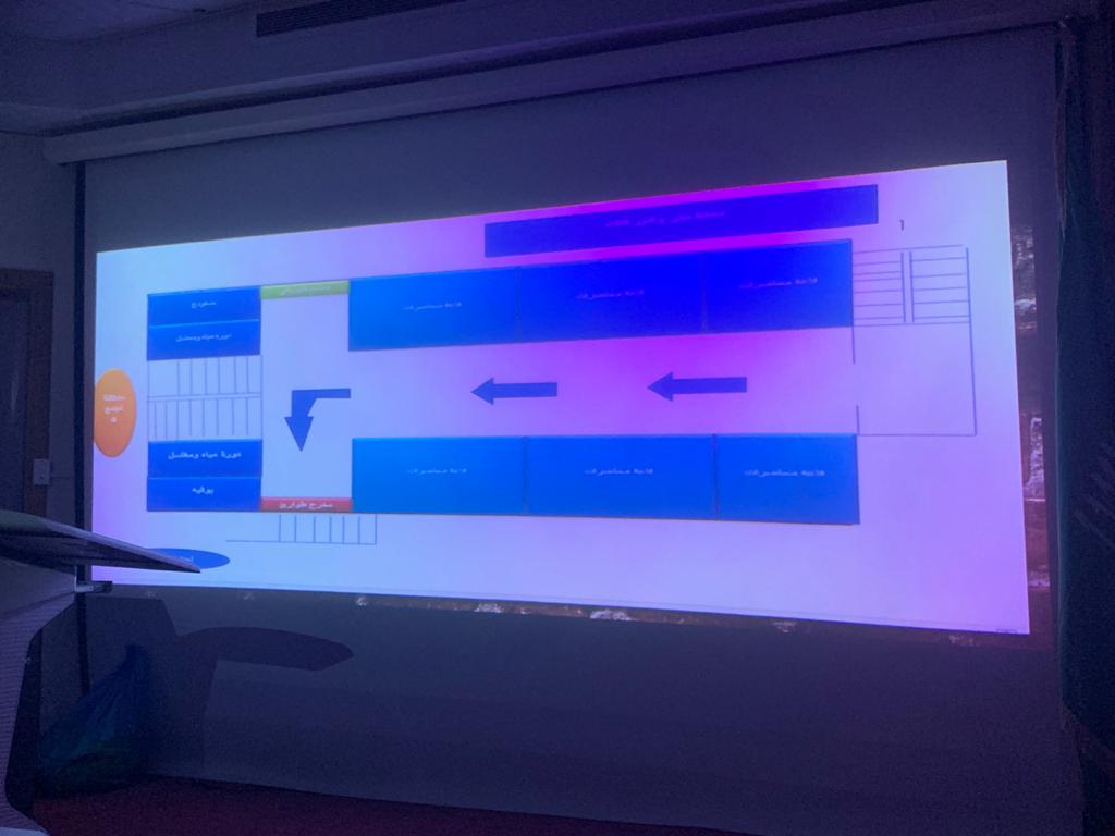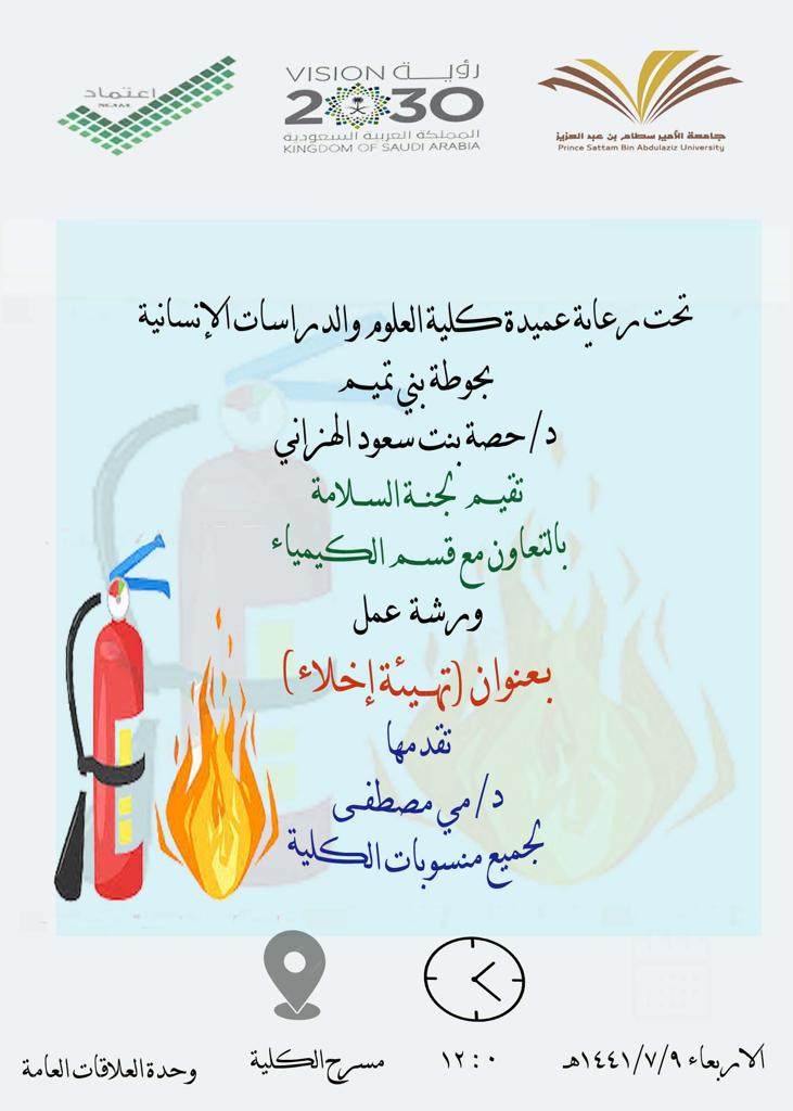 تسعى كلية العلوم والدراسات الإنسانية بقيادة عميدة الكلية الدكتورة / حصة بنت سعود الهزاني إلى التوعية بأهمية الأمن والسلامة وغرس مبادئ الوقاية لدى الموظفات والطالبات داخل الكلية . ومن هذا المنطلق أقامت لجنة السلامة بالكلية بالتعاون مع قسم الكيمياء ورشة بعنوان "تهيئة إخلاء “وذلك في يوم الأربعاء الموافق: 1441/7/9هـ في تمام الساعة ١٢:٣٠. أقامتها د / مي مصطفى أحمد مساعدة العميدة للشؤون التعليمية والاكاديمية و رئيسة لجنة السلامة. تهدف الورشة إلى تدريب المجموعات المشاركة على عملية الإخلاء السريعة بمباني الكلية والأدوار المحددة لها. التعرف على مخططات مباني الكلية وتوزيع المجموعات . حضرت الورشة عدد من الإداريات و مجموعة من عضوات هيئة التدريس و في ختام الورشة تمت الإجابة على استفسارات الحاضرات.