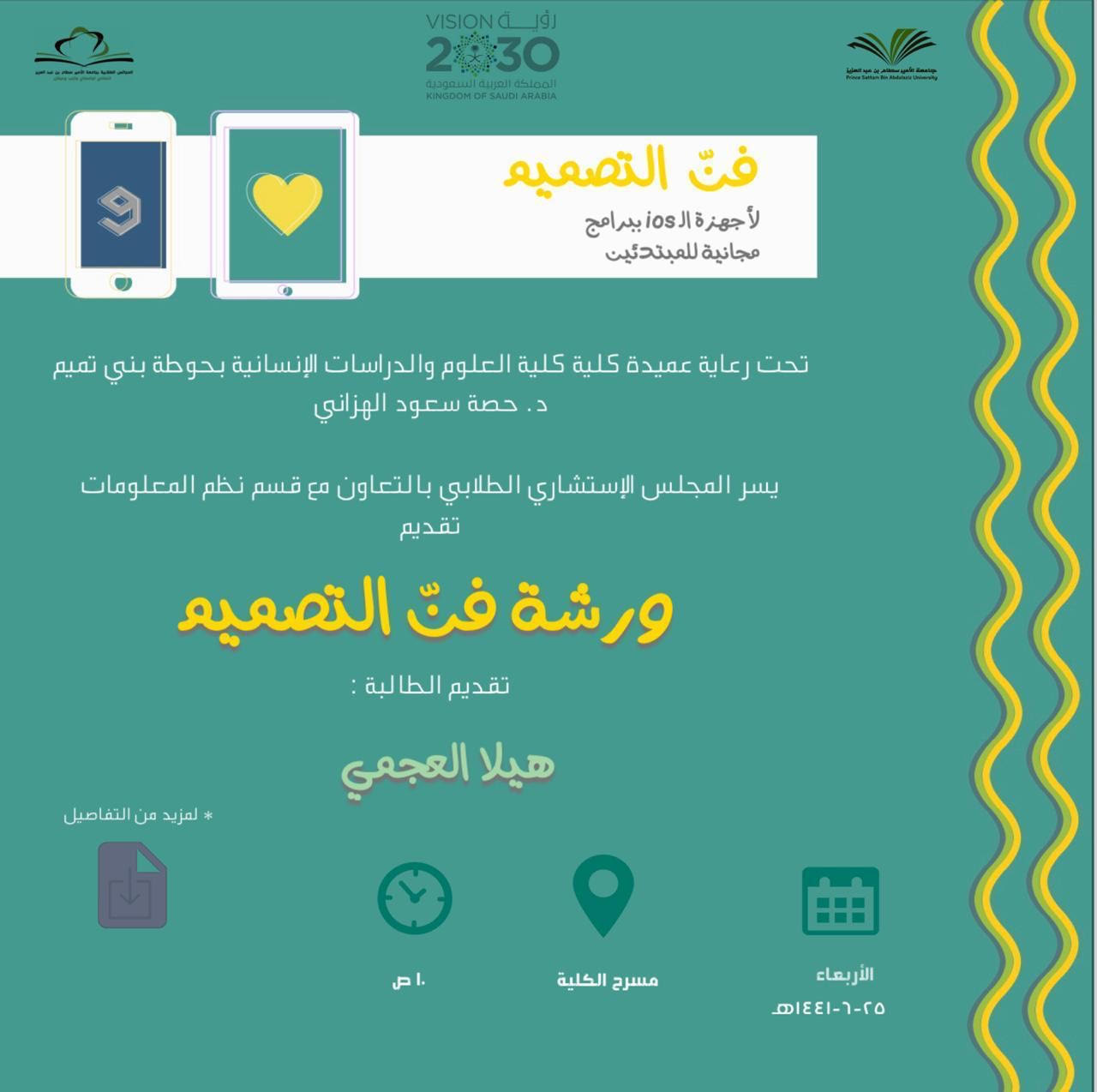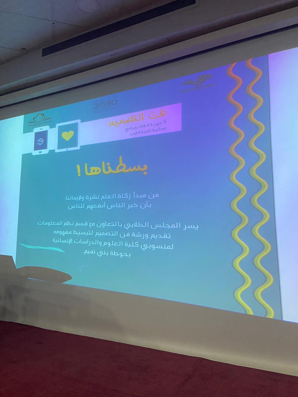 لما لبرامج التصميم من أهمية في بيئة العمل ولزيادة الإنتاج الإبداعي ،نظم المجلس الاستشاري الطلابي بالتعاون مع قسم نظم المعلومات يوم الأربعاء الموافق: ٢٥/ ٦/ ١٤٤١هـ. وتحت قيادة عميدة كلية العلوم والدراسات الإنسانية بحوطة بني تميم د. حصه بنت سعود الهزاني ورشة عمل بعنوان ( فن التصميم) في تمام الساعة ١٠ صباحاً بمسرح الكلية ، قدمتها نائبة المجلس الاستشاري الطلابي هيلا العجمي من قسم نظم المعلومات. تهدف هذه الورشة إلى تبسيط مفهوم التصميم لدى المتدربات وتكوين خلفية عن التغذية البصرية، ففي بداية الورشة تم توضيح مقدمة بسيطة عن التصميم ومرحلة ما قبل التصميم لما لها من أهمية بالغة في التغذية البصرية من حيث ( اختيار الألوان وتناسقها ) وتصميم الانفوجرافيك، وأيضاً تم التعرف على برنامج (PicsArt) وبرنامج (المصمم) و (Asseembly) وكيفية استخدامها في التصميم ،وفي ختام الورشة أُتيح للمتدربات التطبيق على أجهزة الجوال ، وطرح الأسئلة .