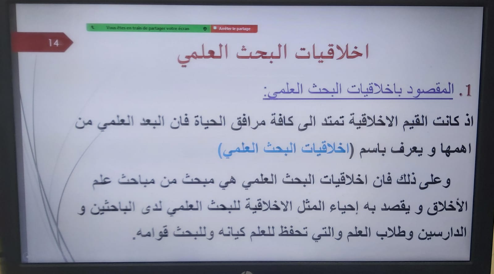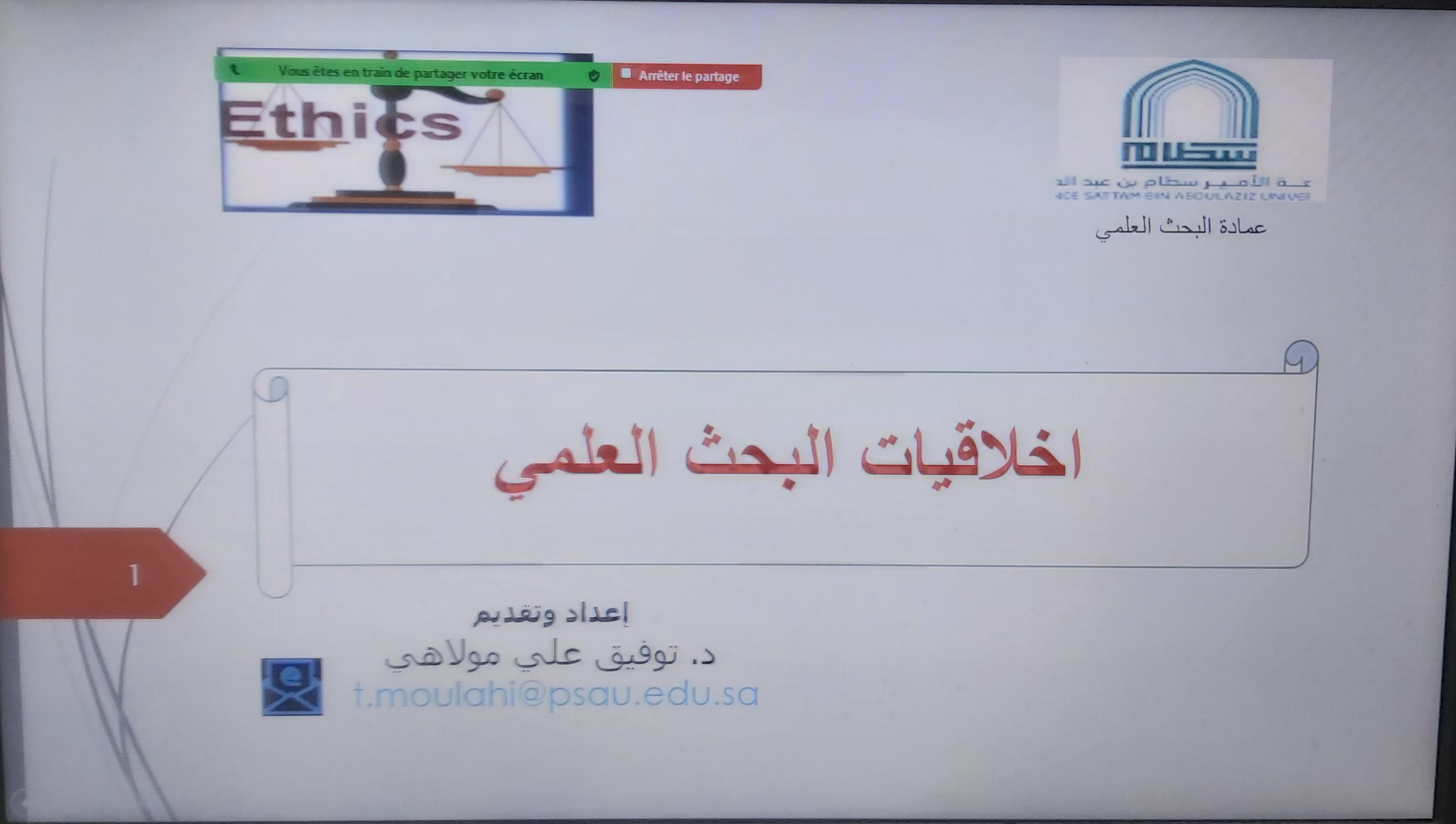 تحت رعاية سعادة الدكتورة حصة بنت سعود الهزاني عميدة كلية العلوم والدراسات الإنسانية بحوطة بني تميم أقامت وحدة البحث العلمي ورشة عمل تحت عنوان "أخلاقيات البحث العلمي" من تقديم الدكتور توفيق مولاهي الأستاذ المساعد بقسم الرياضيات بالكلية، وذلك في يوم الثلاثاء الموافق 23-4-1445هـ عبر برنامج الزووم، حيث تناول في هذه الورشة المحاور الأساسية بالبحث العلمي ألا وهي : تعريف البحث العلمي وأهميته، ومستويات الأبحاث في الدراسات العليا، وأخيرًا تناول بالتفصيل اخلاقيات البحث العلمي المنوط بها الباحث العلمي، وأيضًا الجهات البحثية.