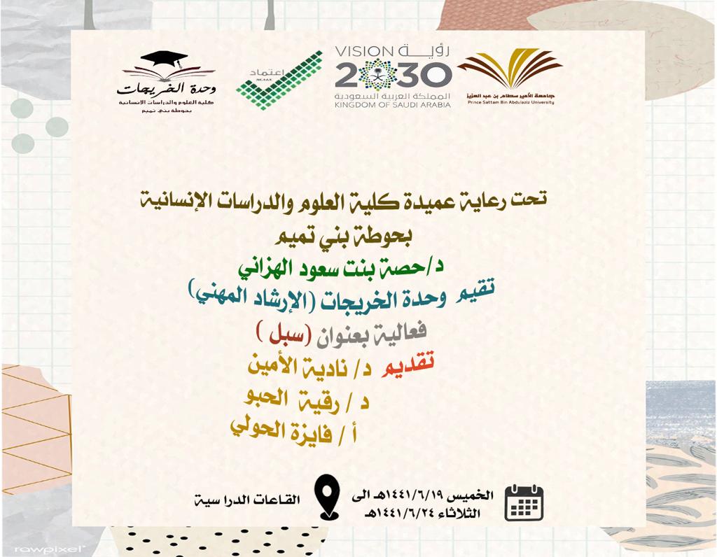 تُواصل وحدة الخريجات متمثلة بلجنة الإرشاد المهني بكلية العلوم والدراسات الإنسانية بحوطة بني تميم البرنامج التعريفي عن منصة سُبل التابعة لتنمية الموارد البشرية. تحت قيادة عميدة الكلية د. حصة بنت سعود الهزاني. حيث بدأ البرنامج في يوم الخميس الموافق :1441/6/19هـ.إلى يوم الثلاثاء الموافق :1441/6/24 هـ في قاعة (16 - 19)بالمبني الأول الدور الثالث. تم تنفيذه من قبل د/ نادية أحمد الامين د/ رقية أحمد الحبو ا/ فايزة سالم الحولي. وتم تحقيق الهدف من الفعالية حيث تهدف هذه المنصة (سُبل) إلى توفير بيئة إلكترونية تفاعلية تهتم بالتثقيف والإرشاد المهني مع الشرائح المستهدفة. ولقد تم تعريف الطالبات بالبوابة الإلكترونية سُبل للتثقيف والإرشاد المهني على شبكة الإنترنت حيث ترتكز عليها أنشطة التثقيف والإرشاد المهني لجميع الشرائح المستهدفة، بالإضافة إلى أنها توفر معلومات ومحتوى تفاعلي ومحتوى مرئي عن سوق العمل مدعمة باختبارات قياس للميول الوظيفي .كما تهدف إلى تمكين الفئات المستهدفة من الاختيار الفعال لمسارات التعليم والعمل، وتطوير أدوات تساعد على تحديد الميول ومطابقتها مع المسارات الوظيفية . وتتيح خدمة التواصل مع مرشدين مهنيين عن بعد ليتم تقديم خدمة الارشاد المهني للباحثين عن عمل في جميع مناطق المملكة .
